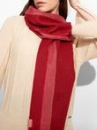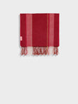 Chalina Perejil en tonalidad rojo, con rayas verticales anchas. Los bordes con flecos gruesos ofrecen un toque de textura. Confeccionada en baby alpaca, brinda calidez y suavidad. | Material predominante: Baby Alpaca