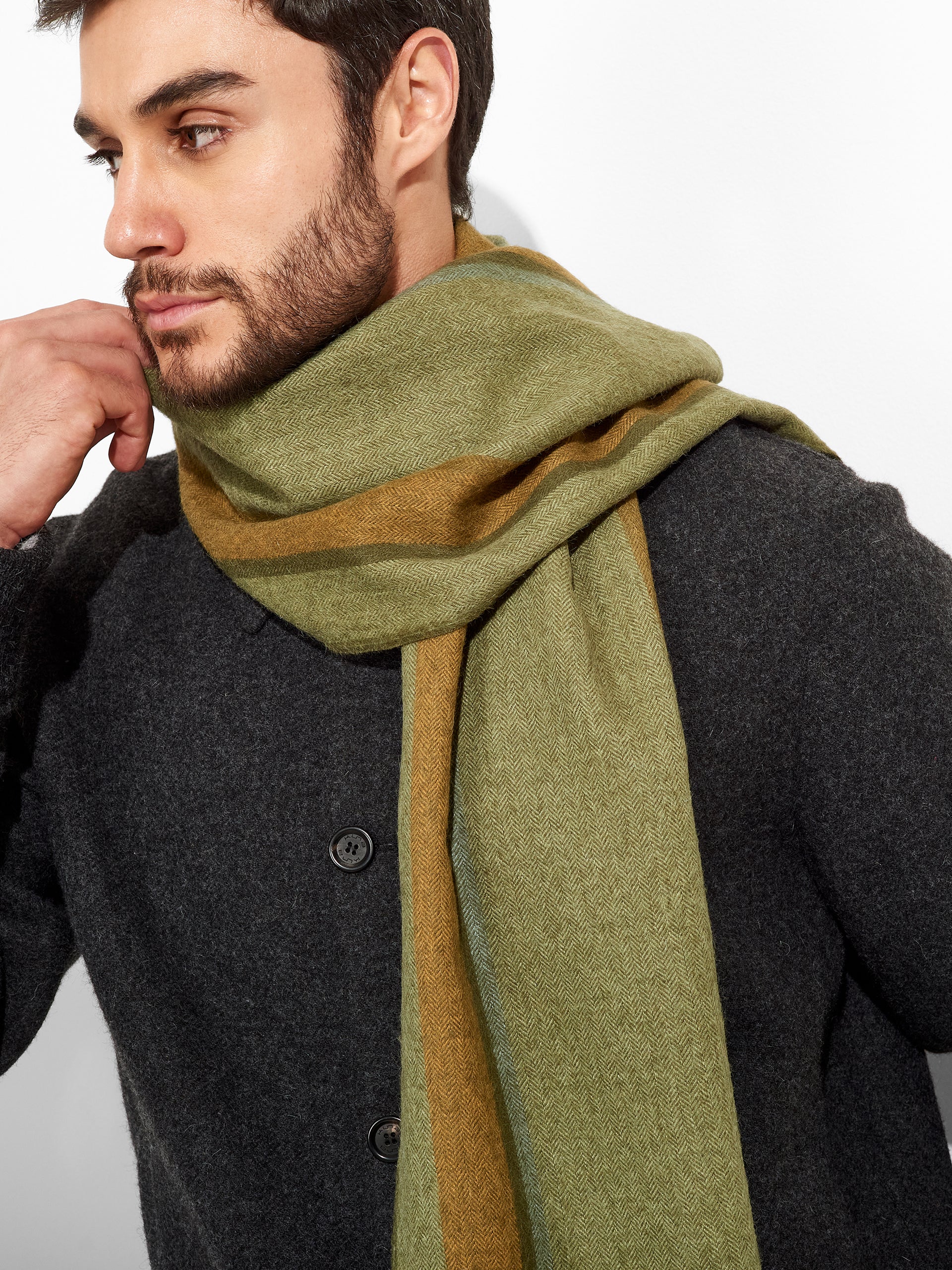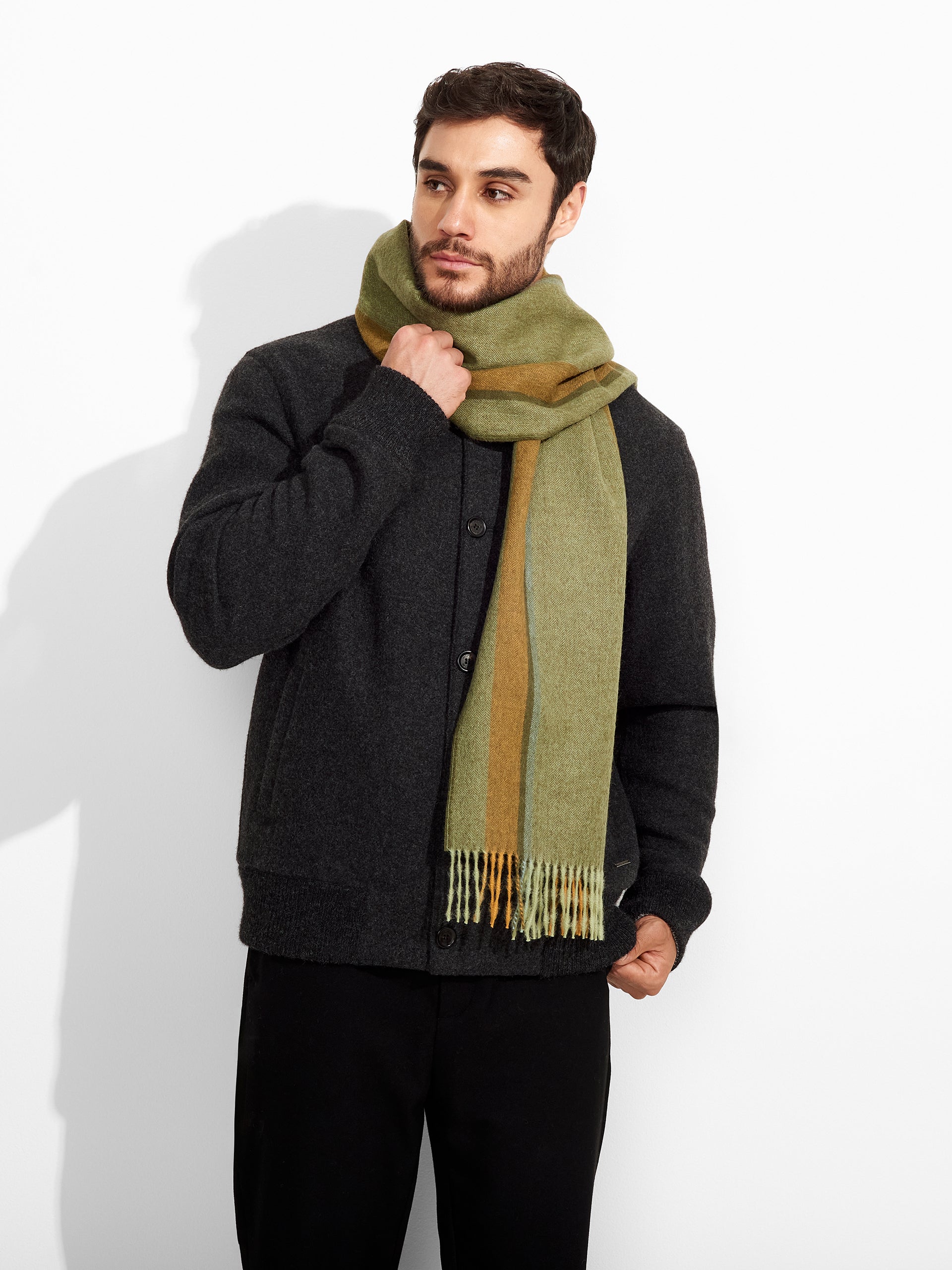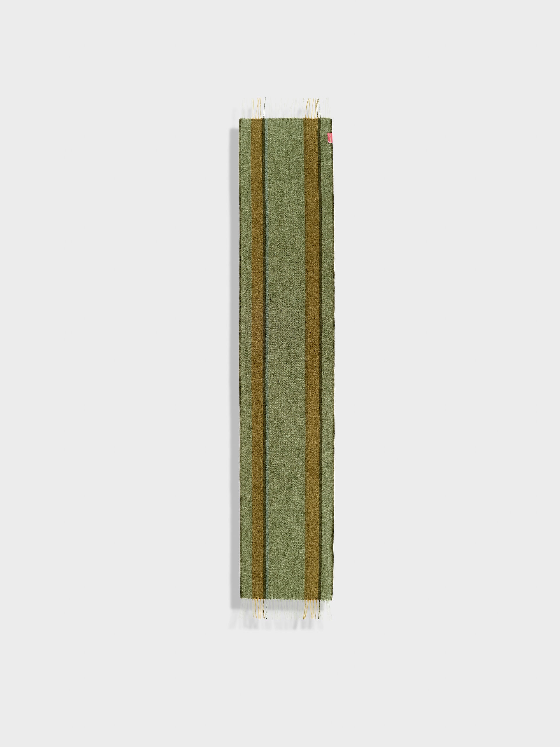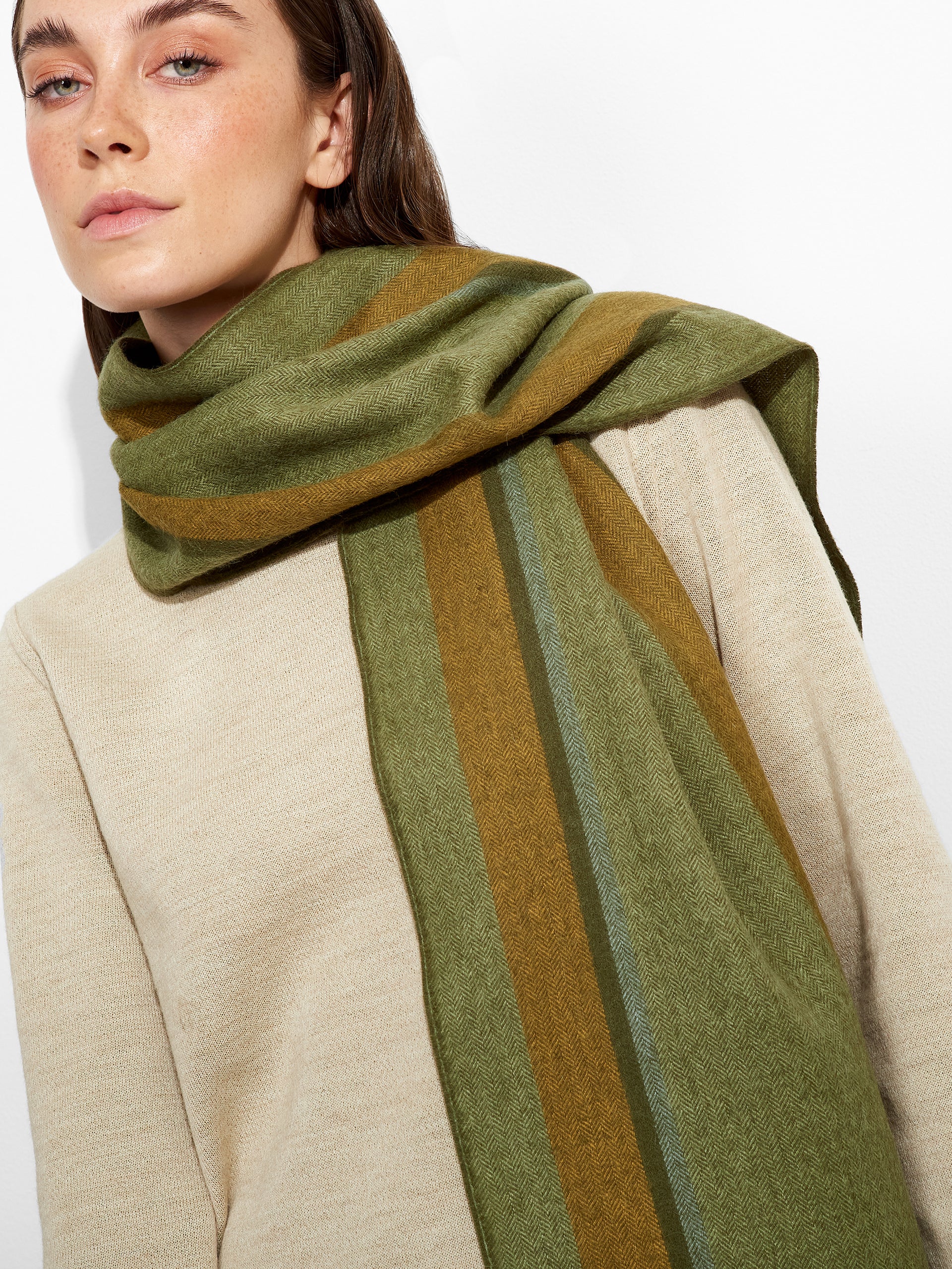 Chalina Perejil en tonalidad verde, con rayas verticales anchas. Los bordes con flecos gruesos ofrecen un toque de textura. Confeccionada en baby alpaca, brinda calidez y suavidad. | Material predominante: Baby Alpaca