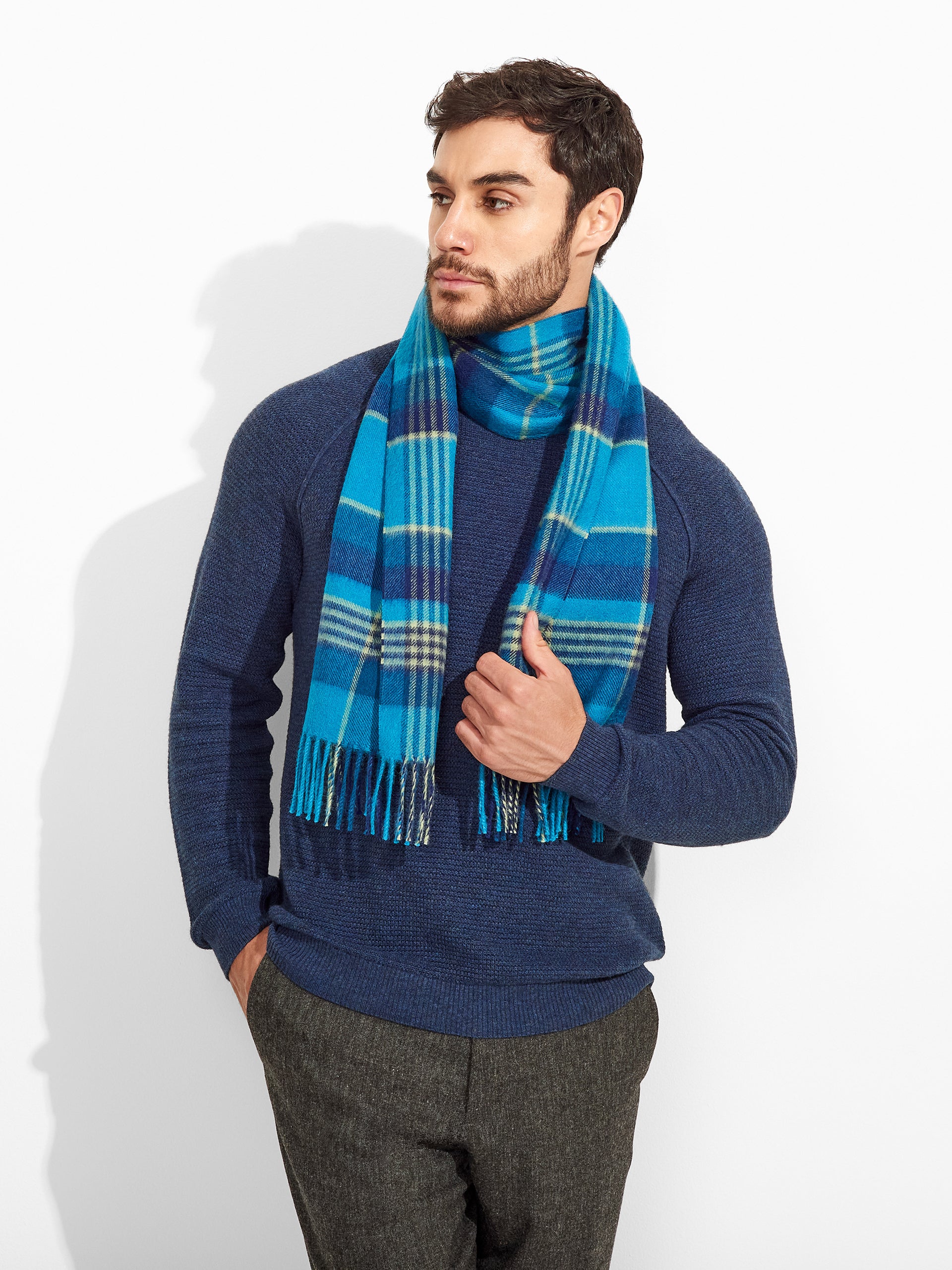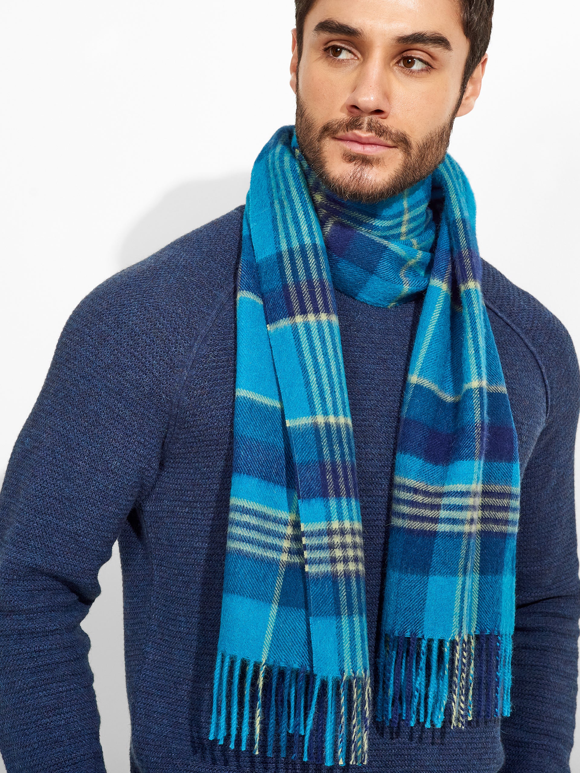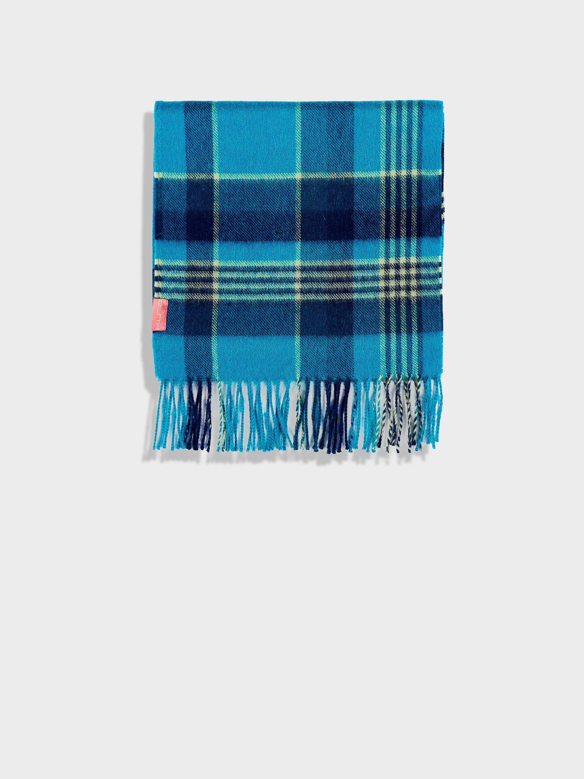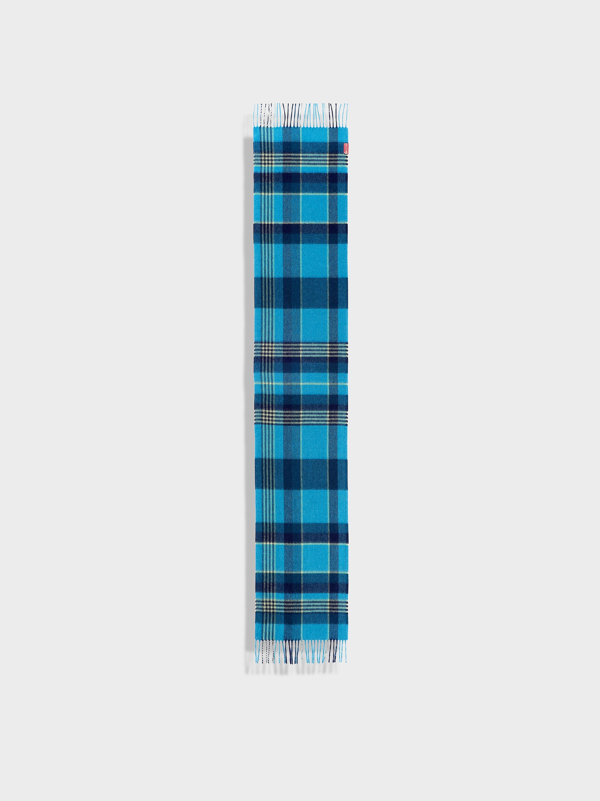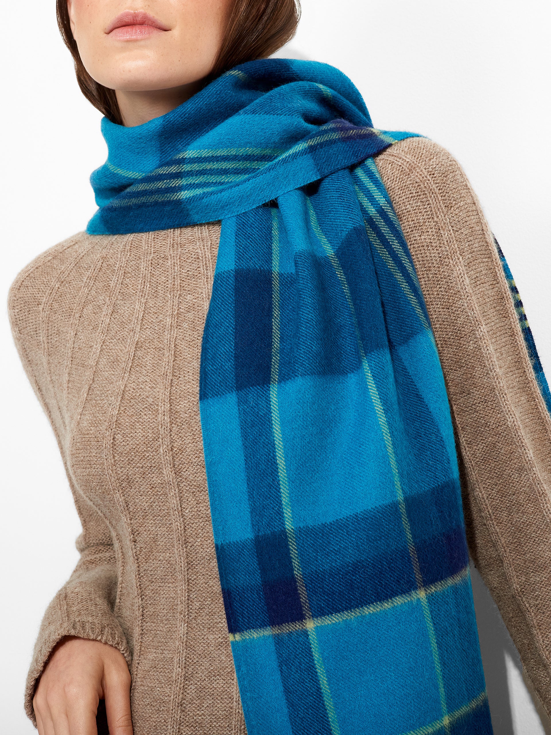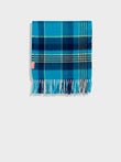 Chalina Ratti en tonalidad azul, con diseño de patrón de cuadros. Los bordes con flecos añaden movimiento y textura. Confeccionada en baby alpaca, destaca por su calidez y suavidad. | Material predominante: Baby Alpaca