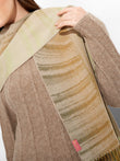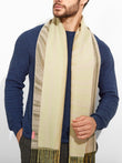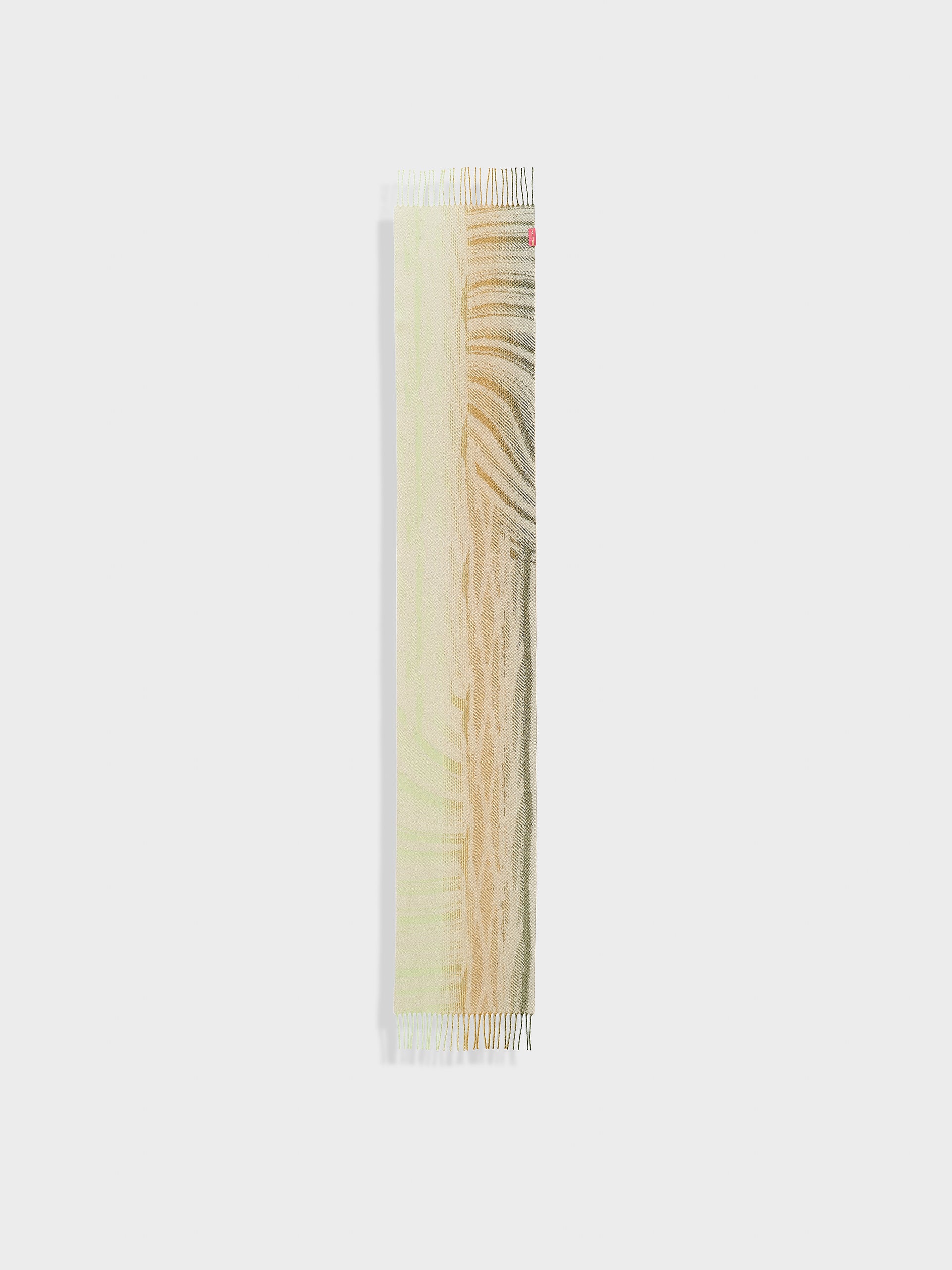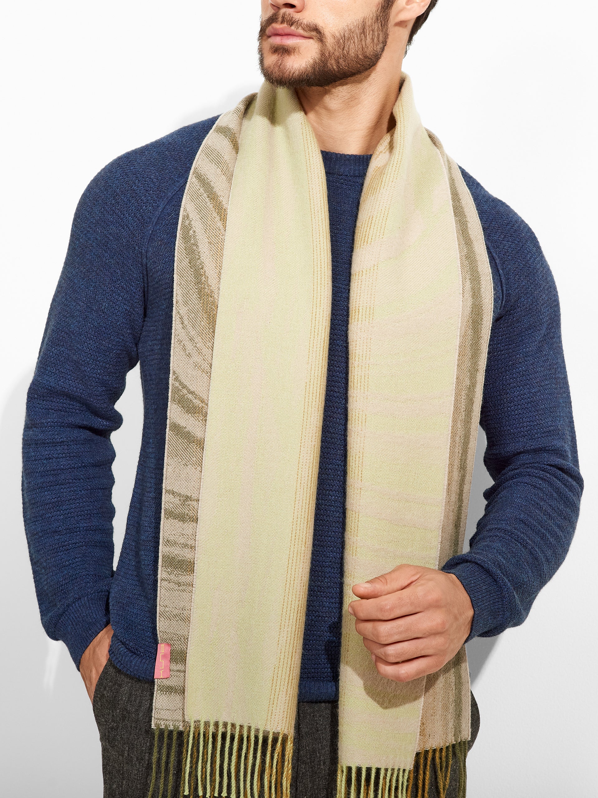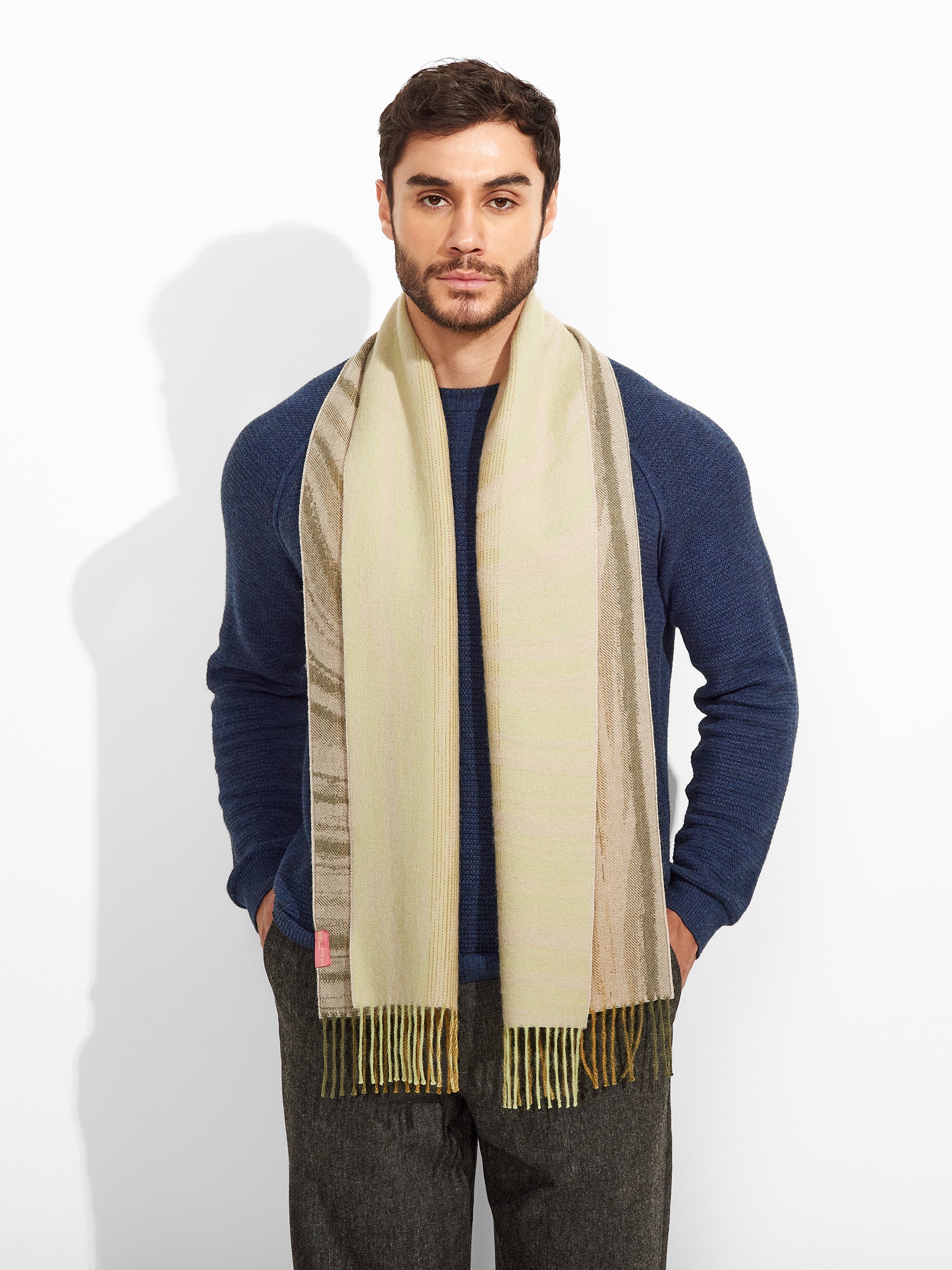 Chalina Zagoni en tonalidad verde, con diseño de rayas irregulares. Los bordes con flecos finos completan el acabado con un toque delicado. Confeccionada en baby alpaca, brinda calidez y suavidad. | Material predominante: Baby Alpaca