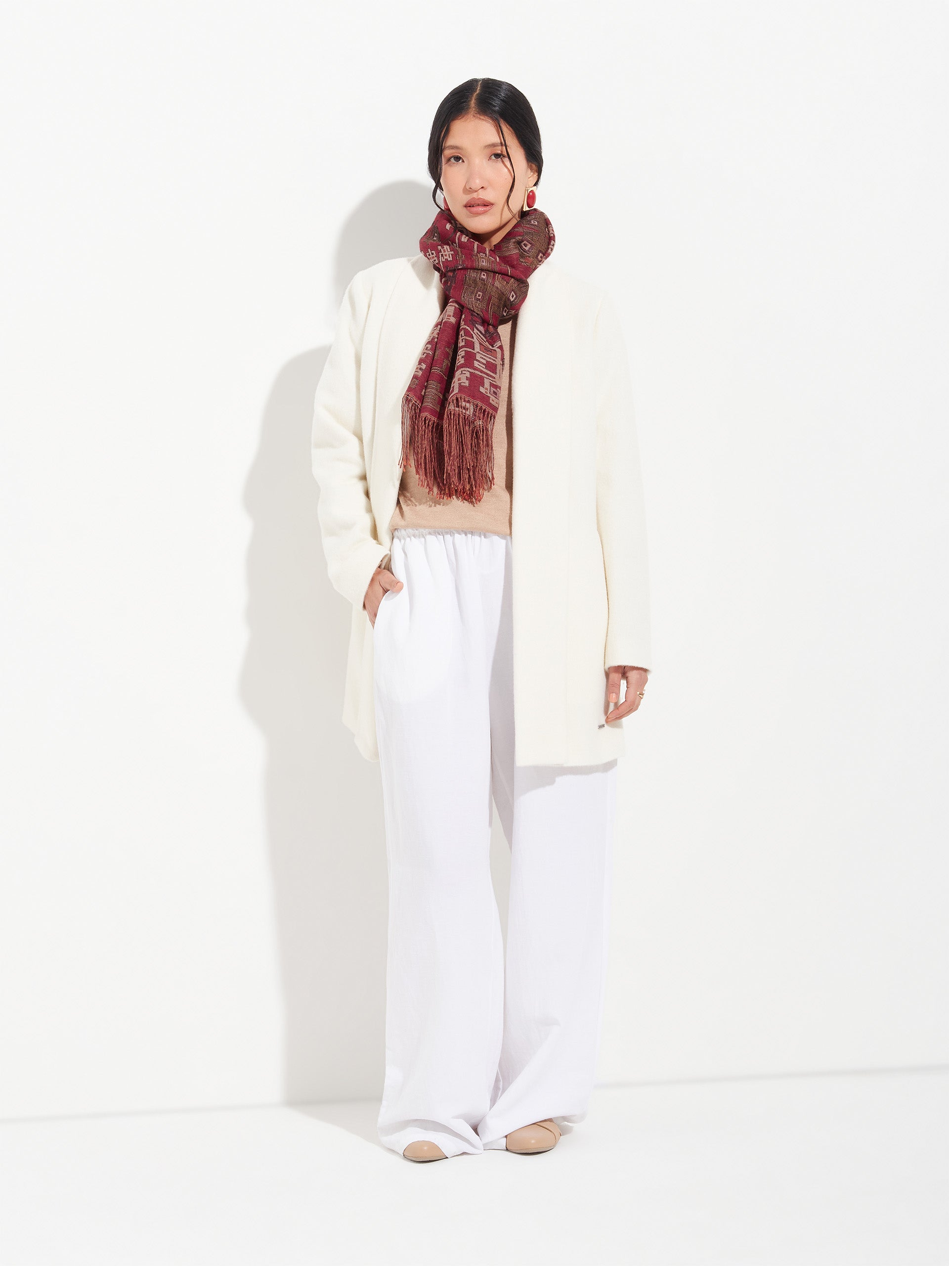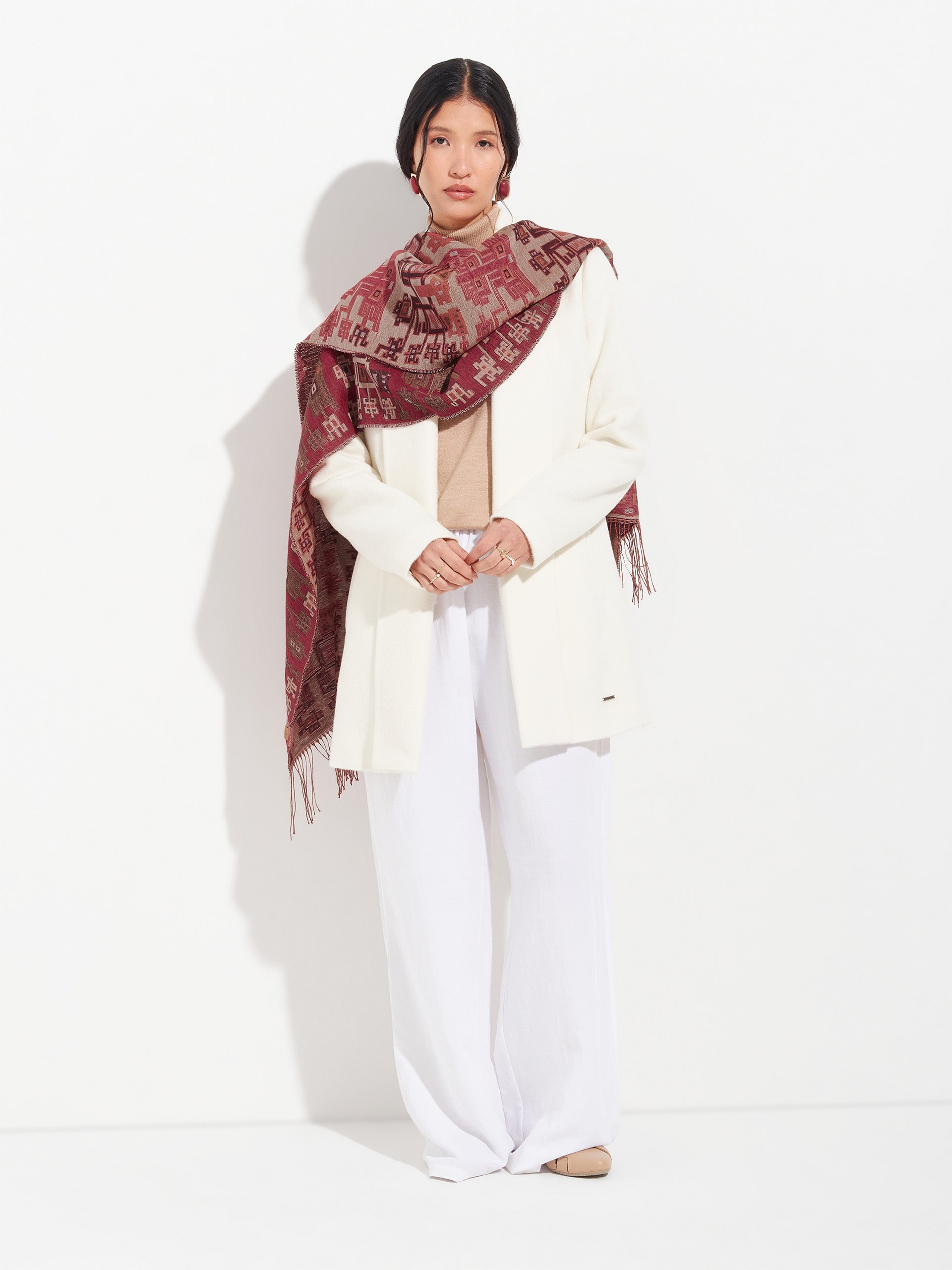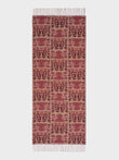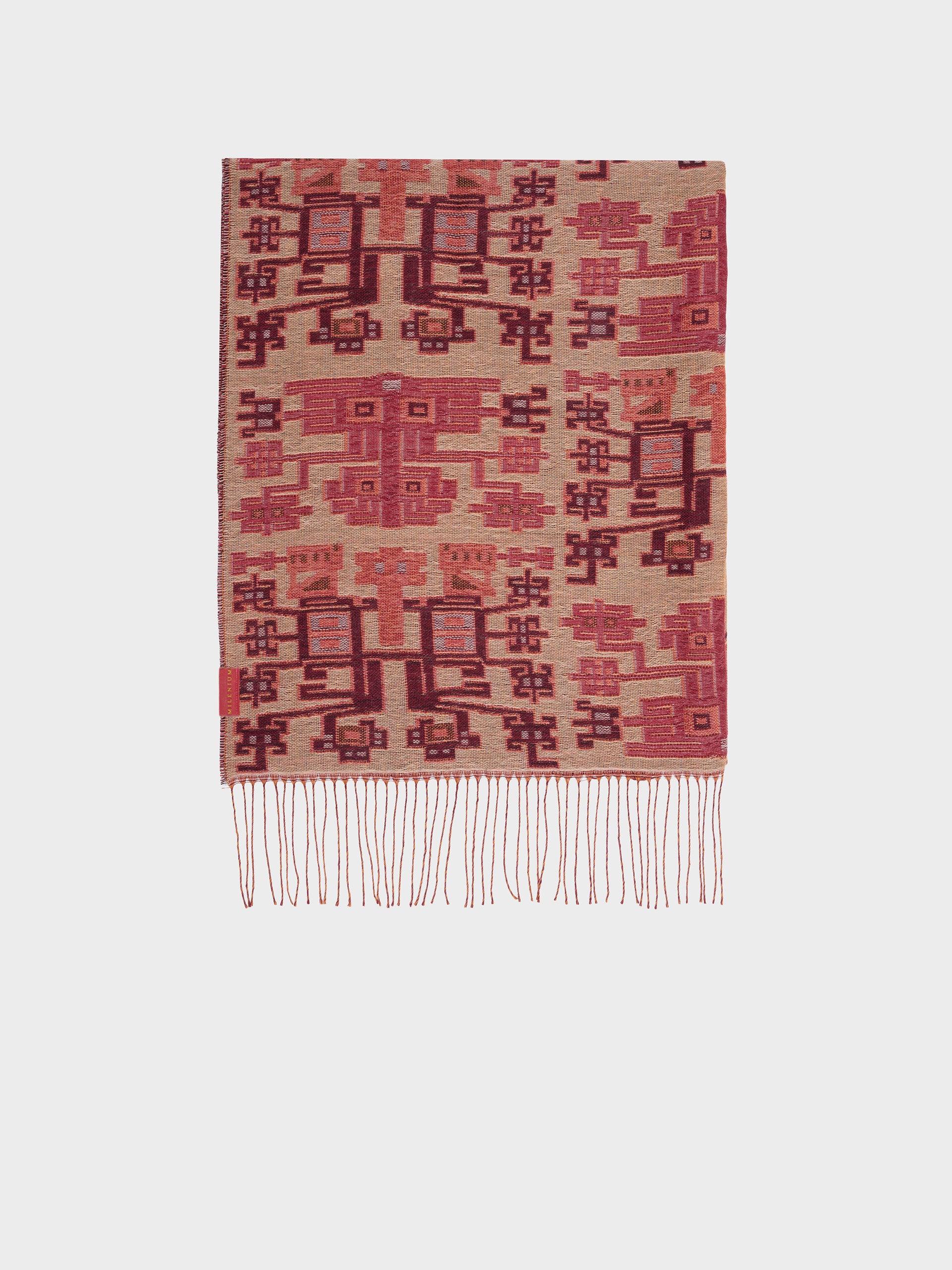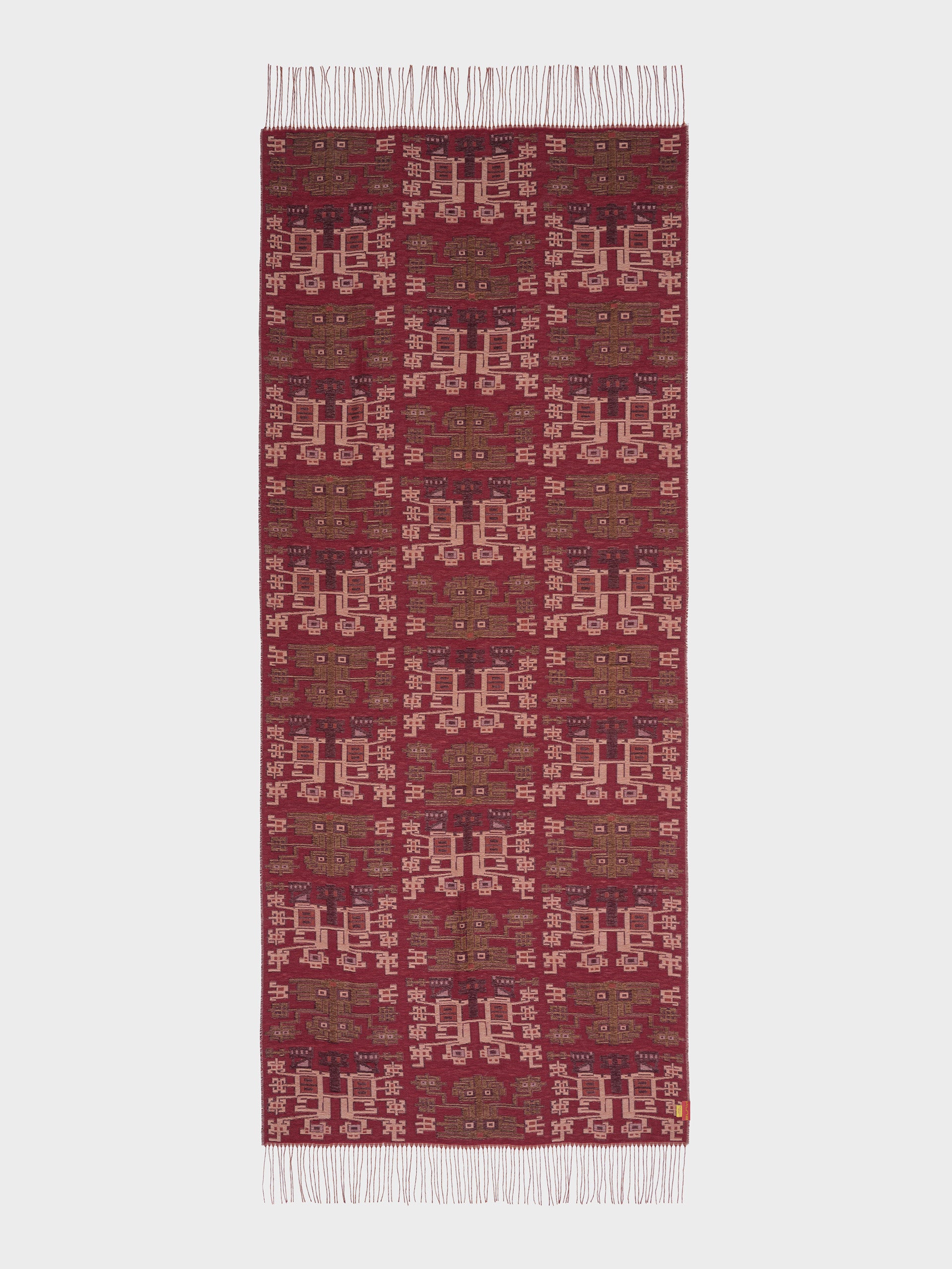 Estola Nazca 52 en tonalidad rojo, elaborada en 70% baby alpaca y 30% seda, con técnica Jacquard en doble tela e inserción de trama oculta. Con una medida de 200/180 x 75 cm, es una prenda reversible, inspirada en la Cultura Nazca, que reinterpreta el legado ancestral en un diseño inspirado en la cultura originaria. | Material predominante: Baby Alpaca