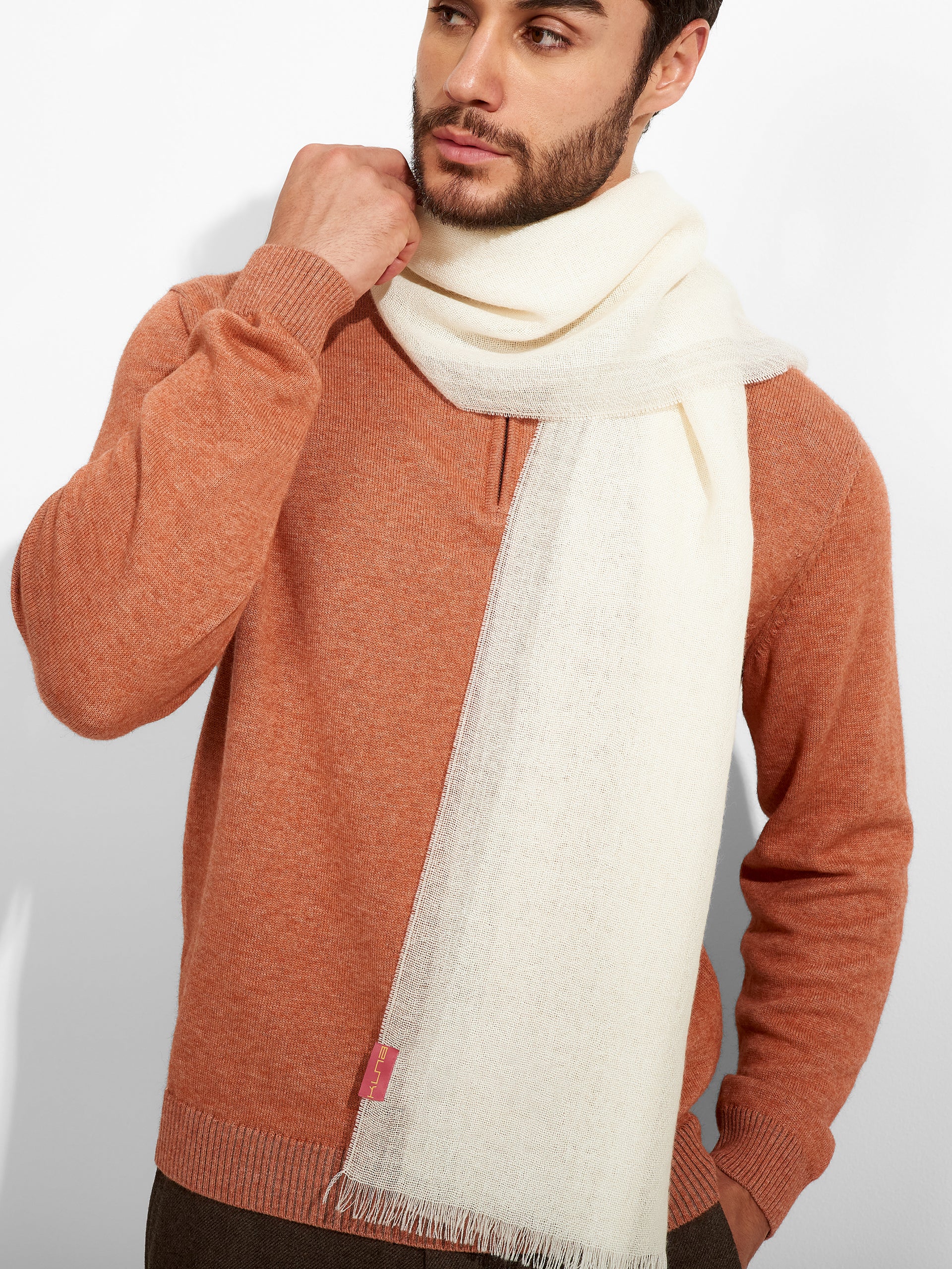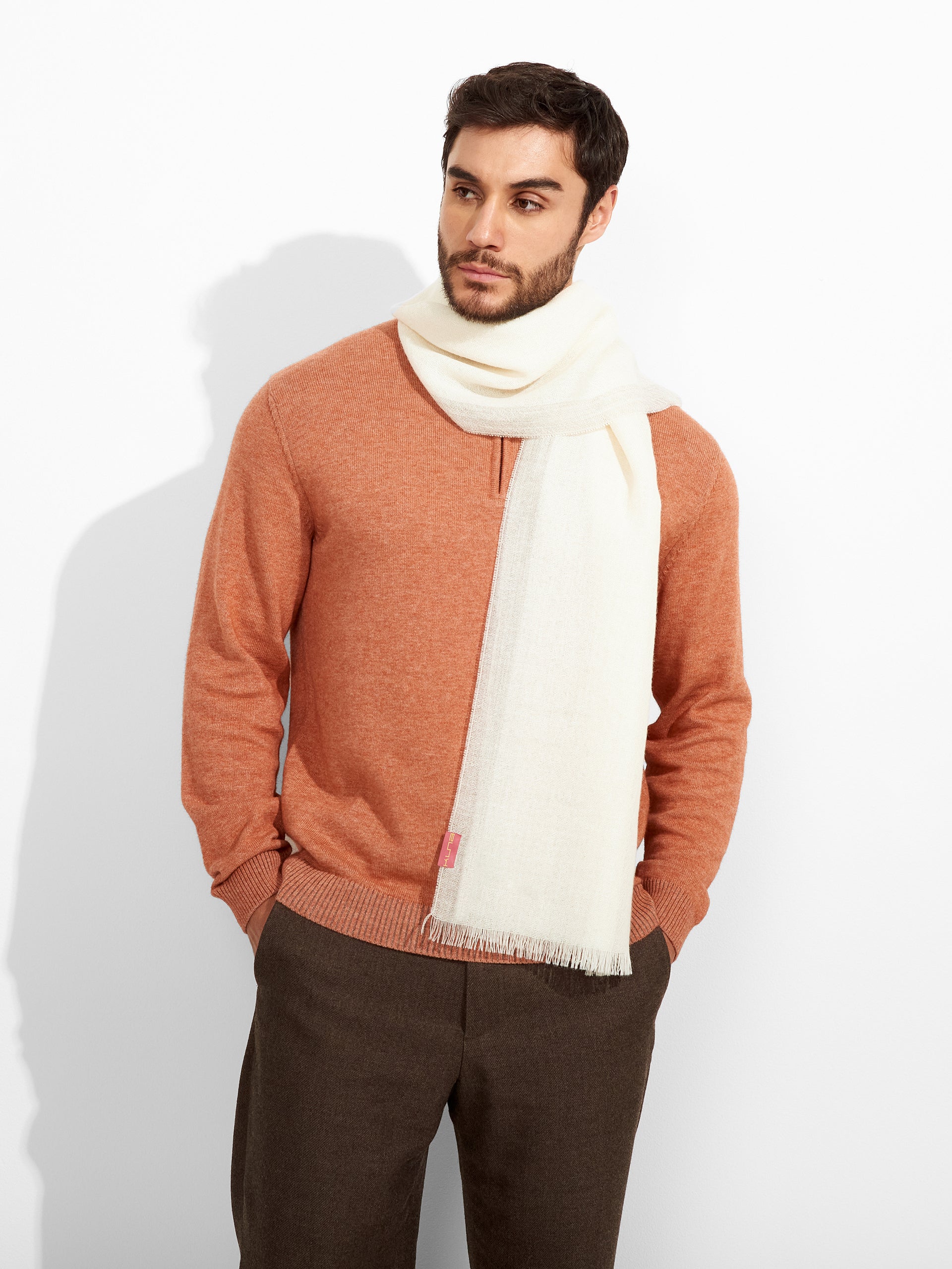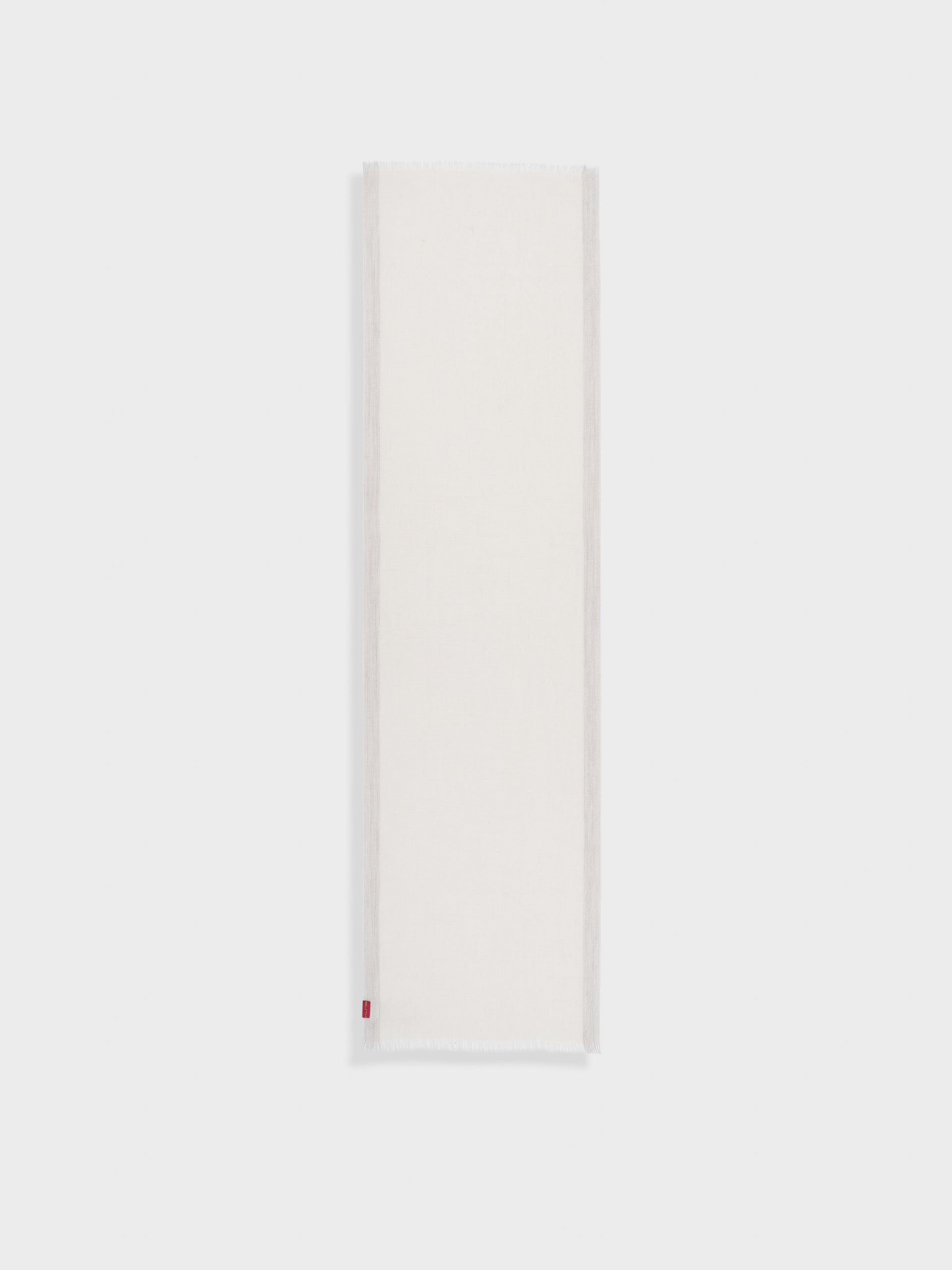 Estola Rum en tonalidad ecru, con bloques de color estrechos en los laterales, presenta bordes con flecos finos. Confeccionada en baby alpaca eco, brinda calidez y suavidad. | Material predominante: Baby Alpaca