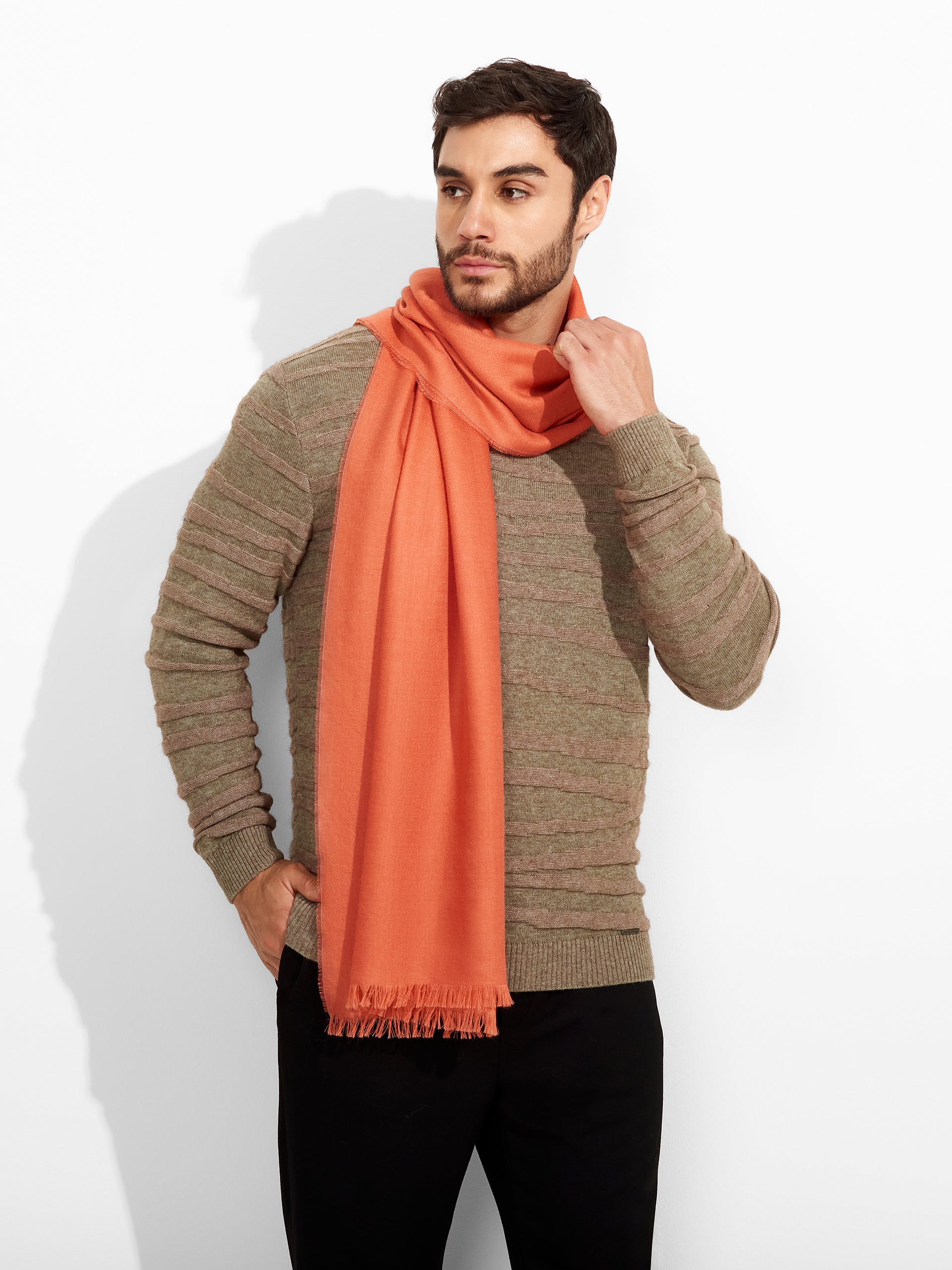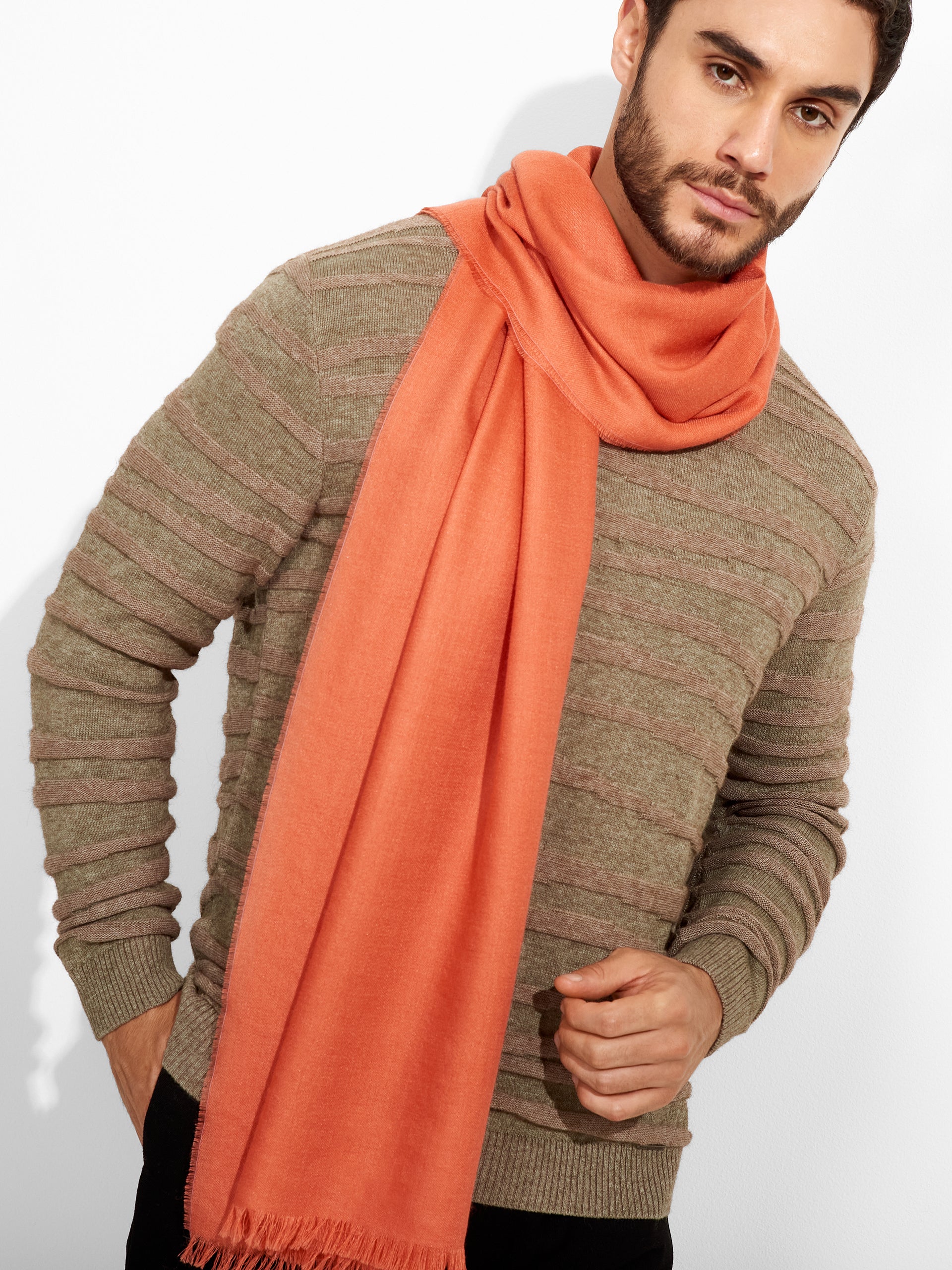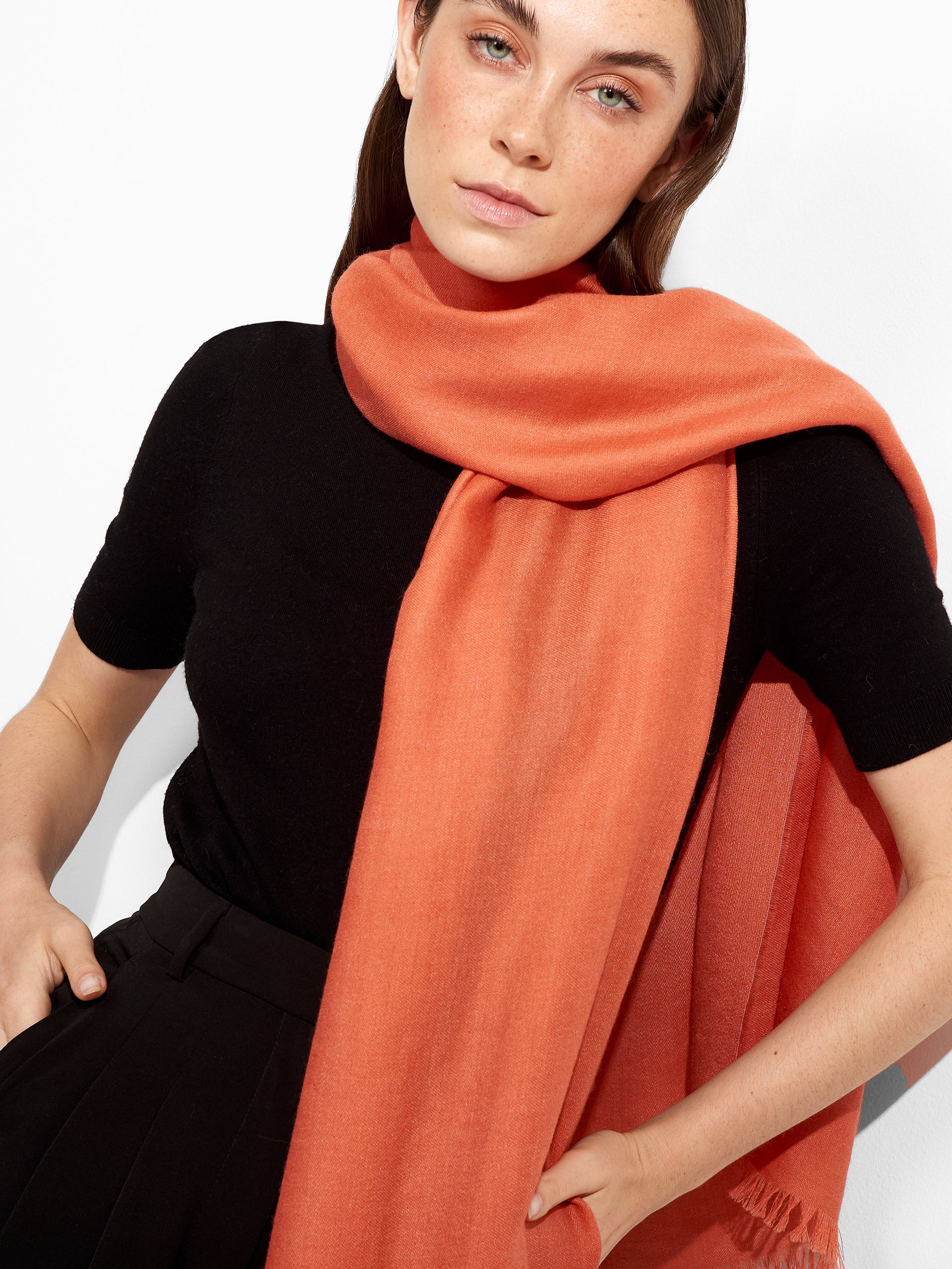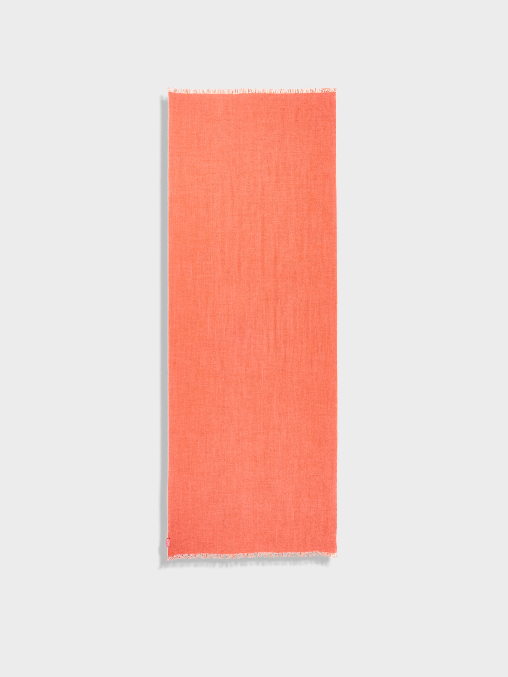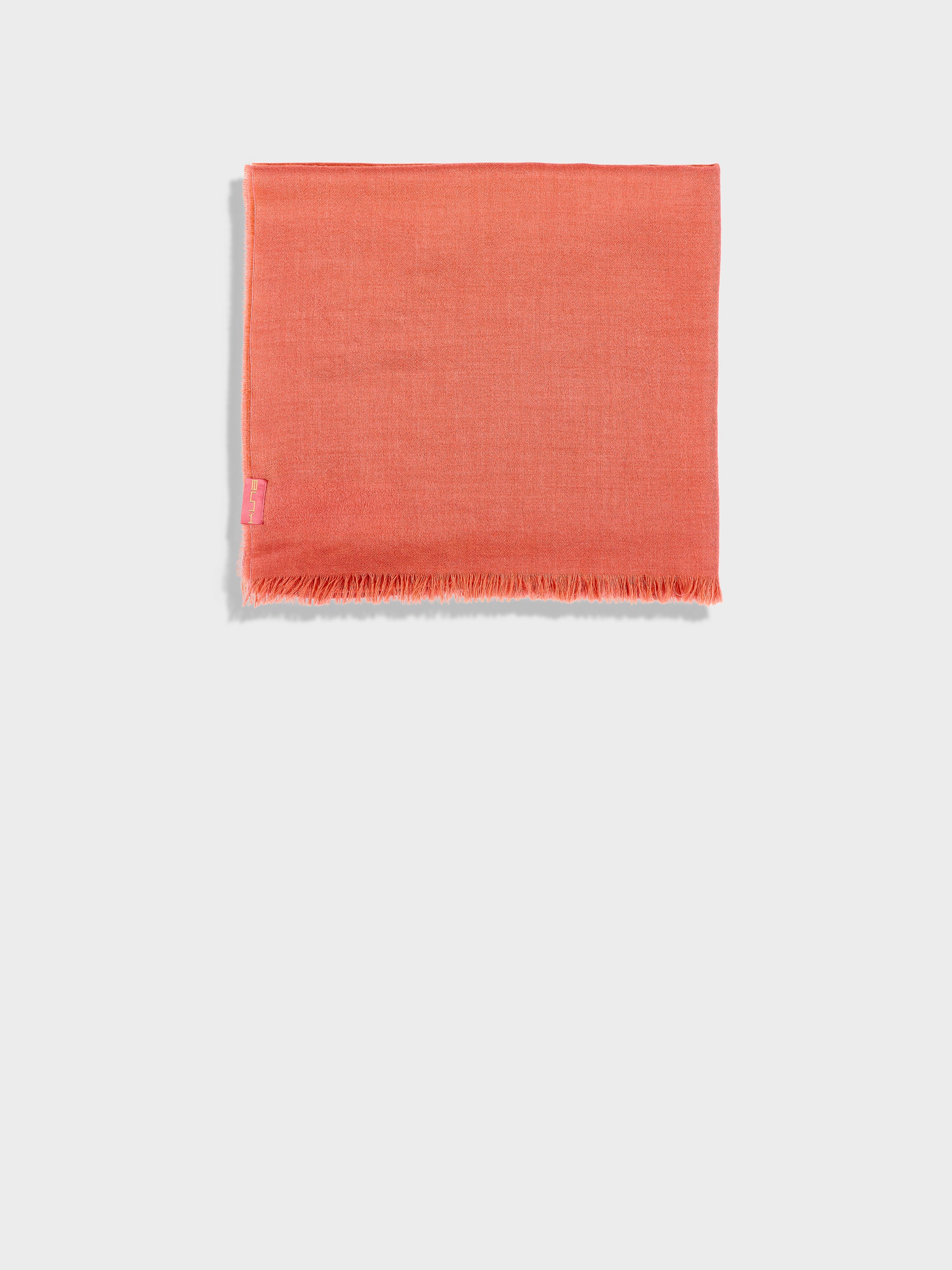 Estola Teaberry en tonalidad naranja, de color entero, presenta bordes con flecos finos que aportan un acabado delicado. Confeccionada en baby alpaca y seda. | Material predominante: Baby Alpaca