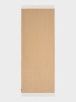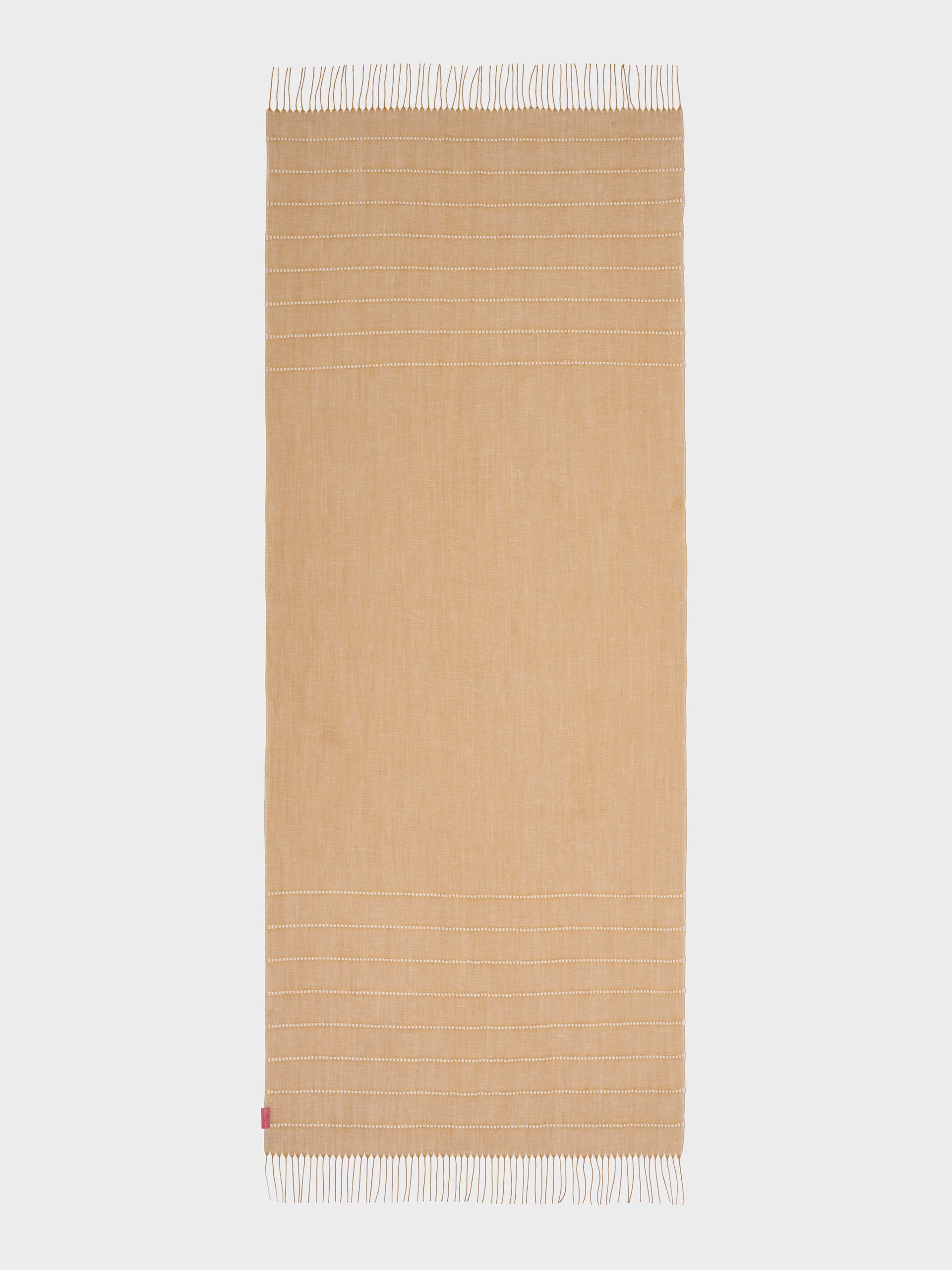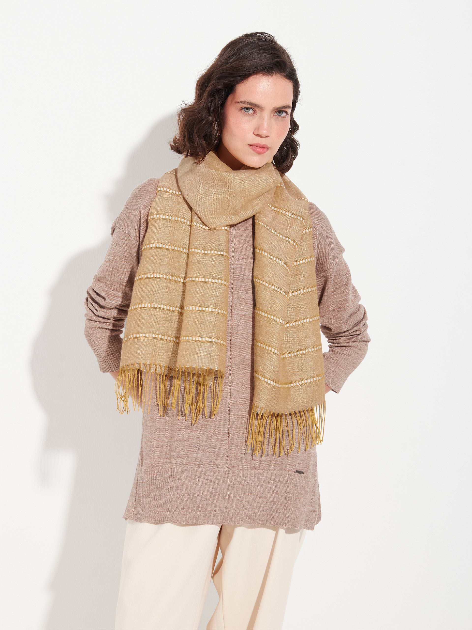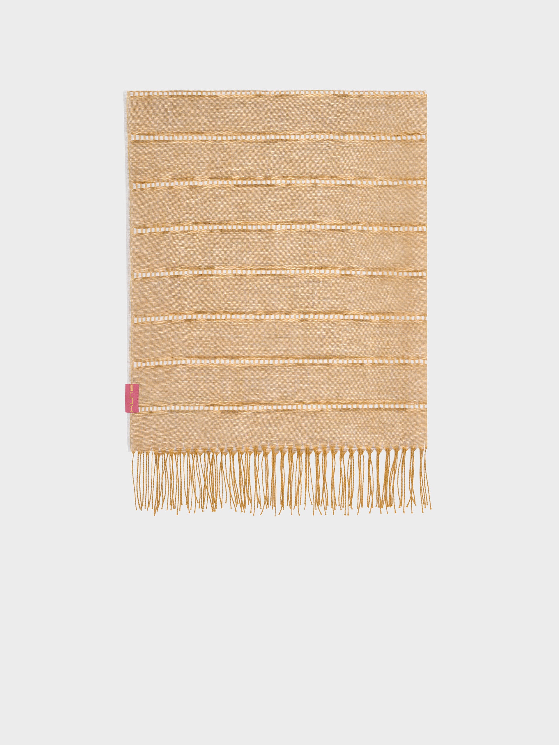 Estola Zabila en tonalidad amarillo, elaborada en baby alpaca, seda y lino. Presenta líneas horizontales en panamá sobre fondo tafetán y acabado desflecado. Su textura ligera y su diseño rayado aportan un toque de distinción. | Material predominante: Lino