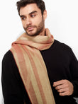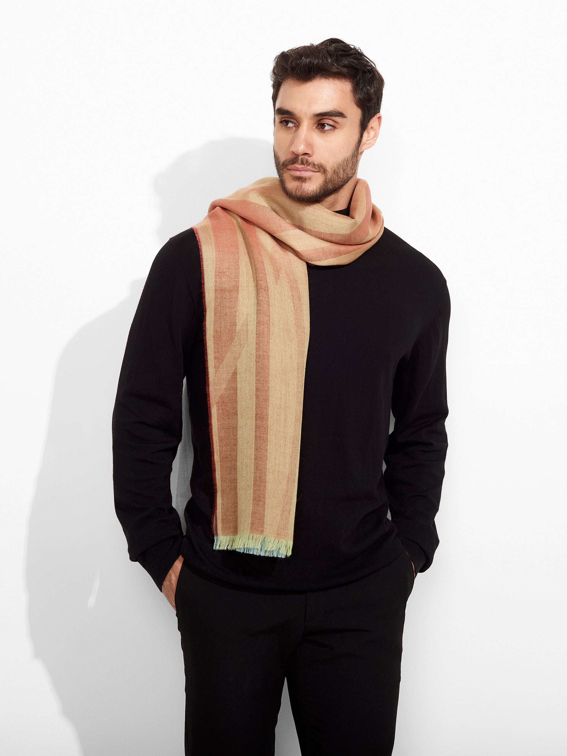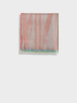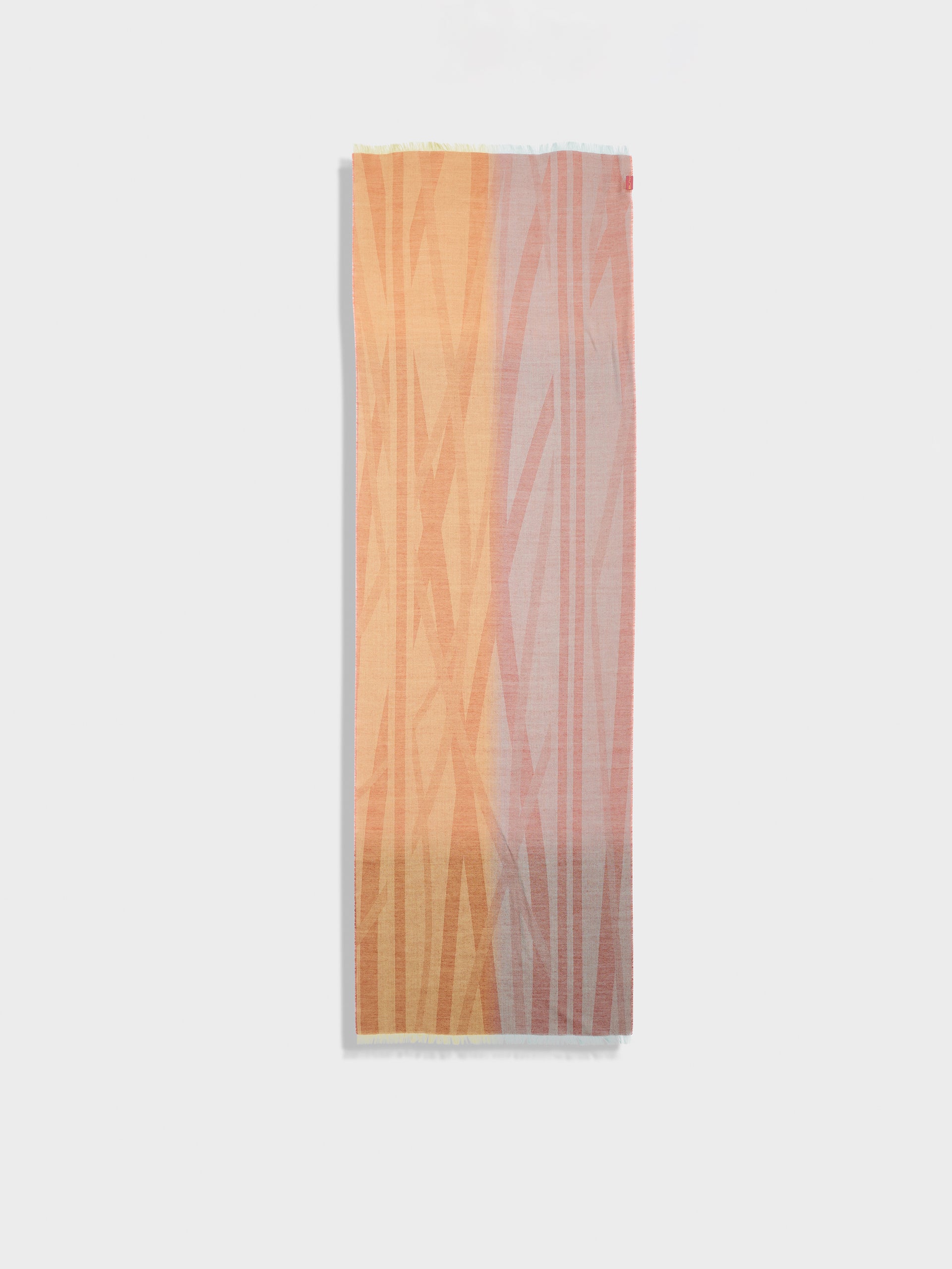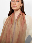 Estola Zakiri en tonalidad rojo, con un diseño de rayas verticales que presentan un sutil efecto degradado, presenta bordes con flecos finos. Confeccionada en baby alpaca y seda. | Material predominante: Baby Alpaca