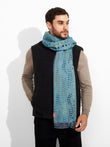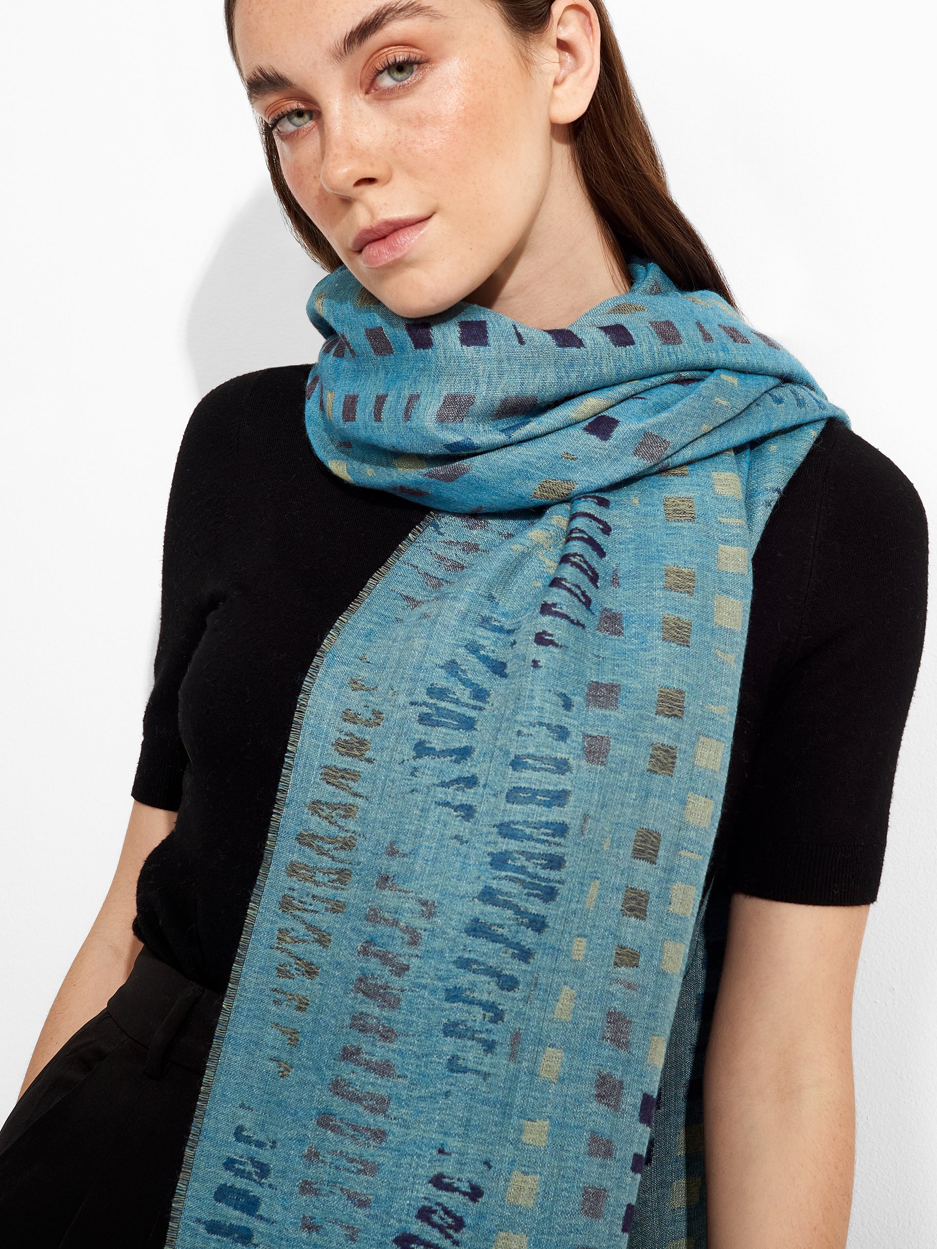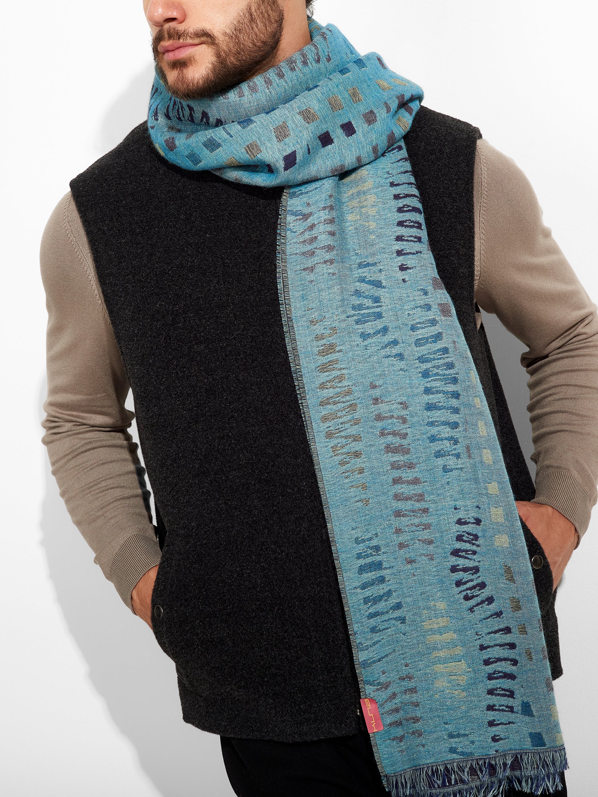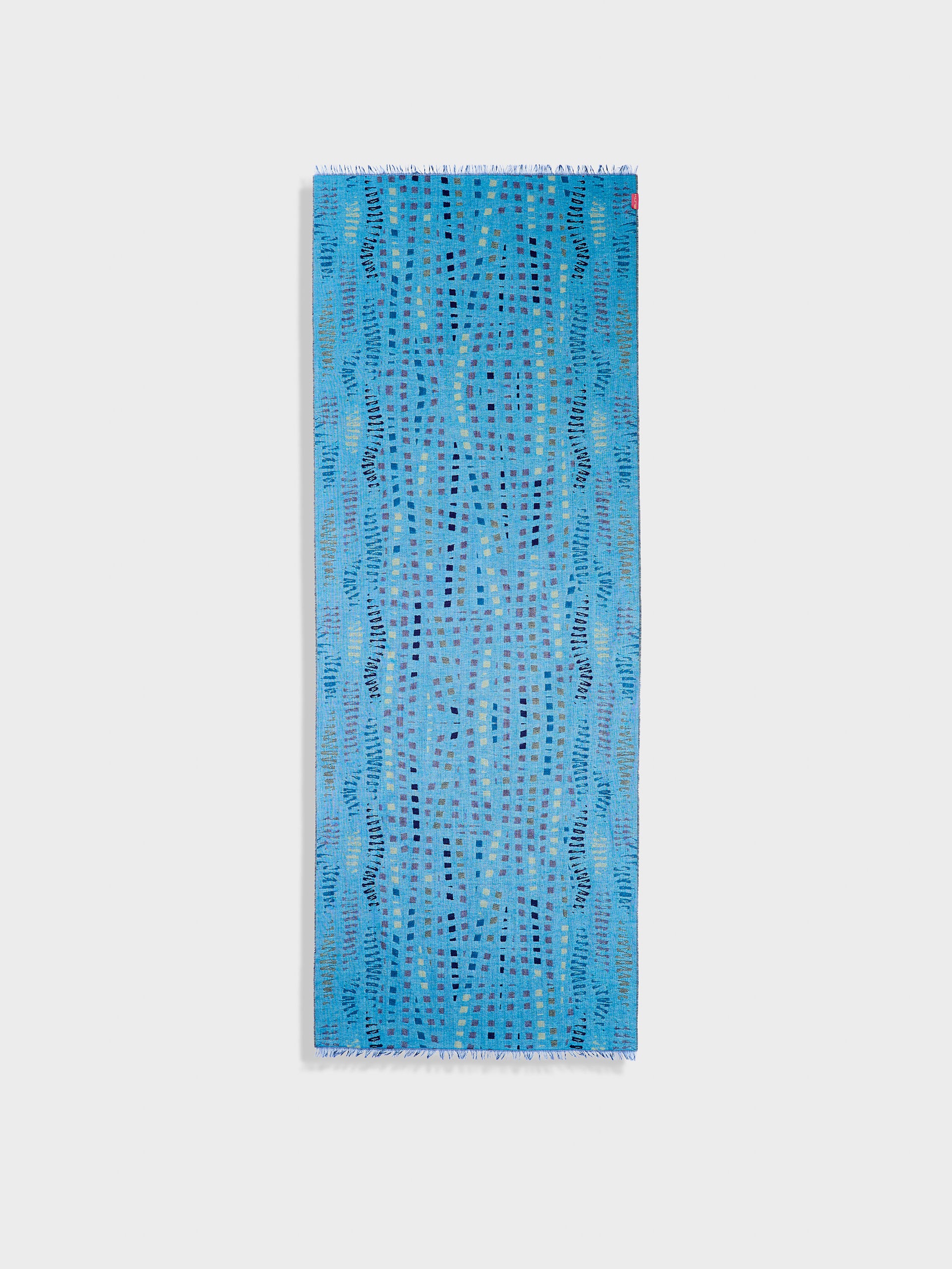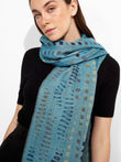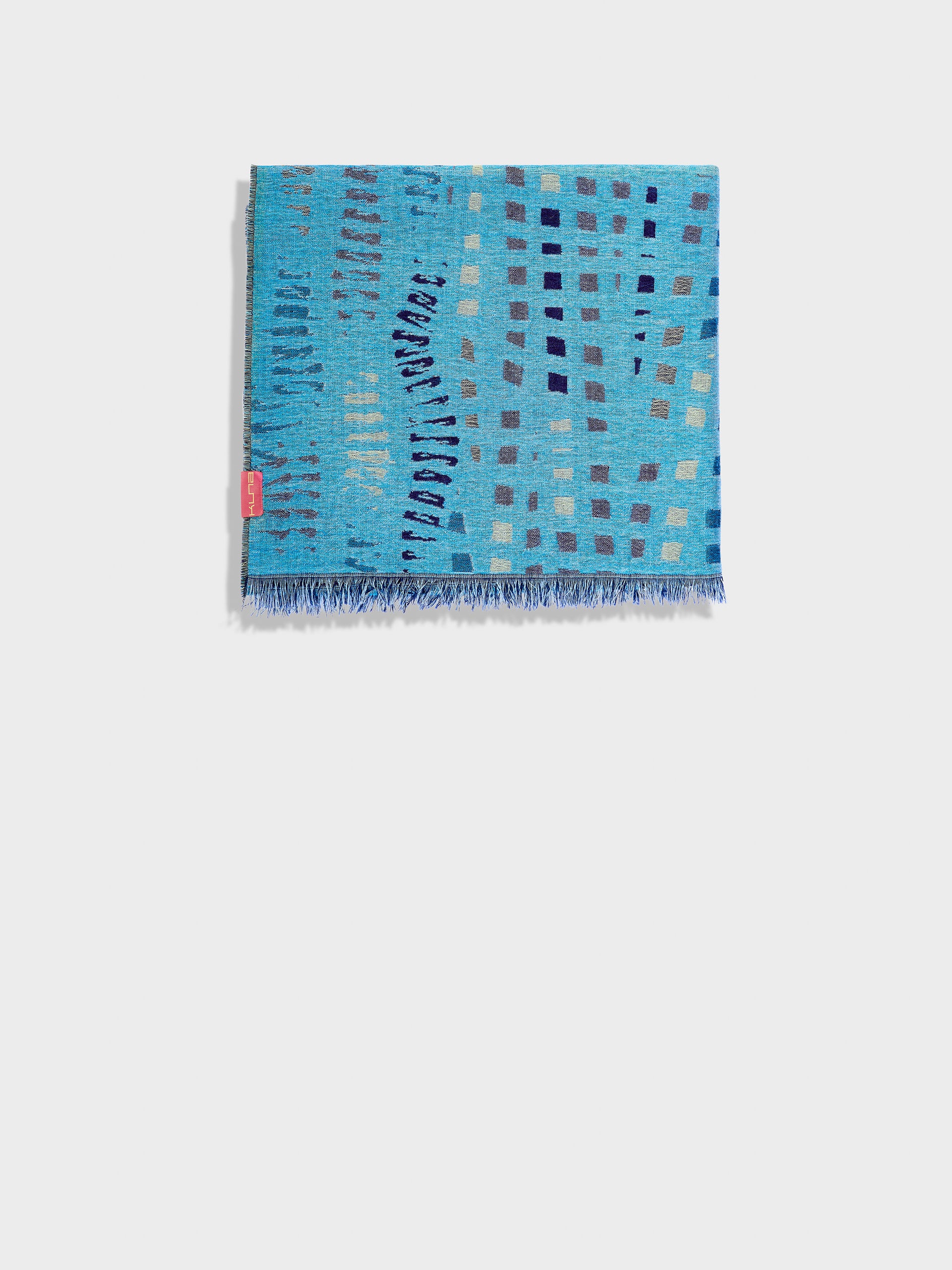 Estola Zane en tonalidad azul, presenta tejido jaquard con un diseño de líneas irregulares y bordes con flecos finos que completan su acabado. Confeccionada en baby alpaca y seda. | Material predominante: Baby Alpaca