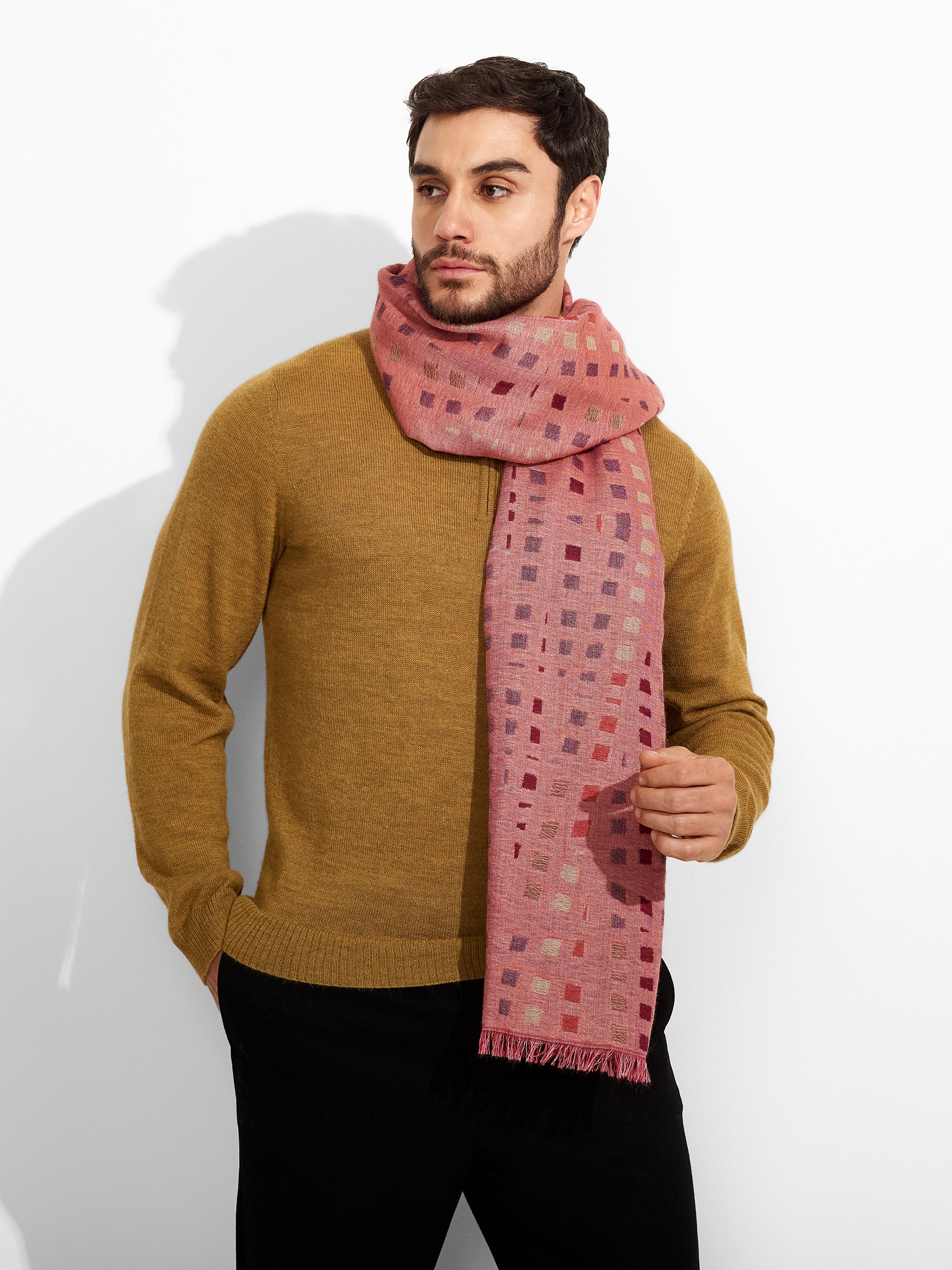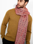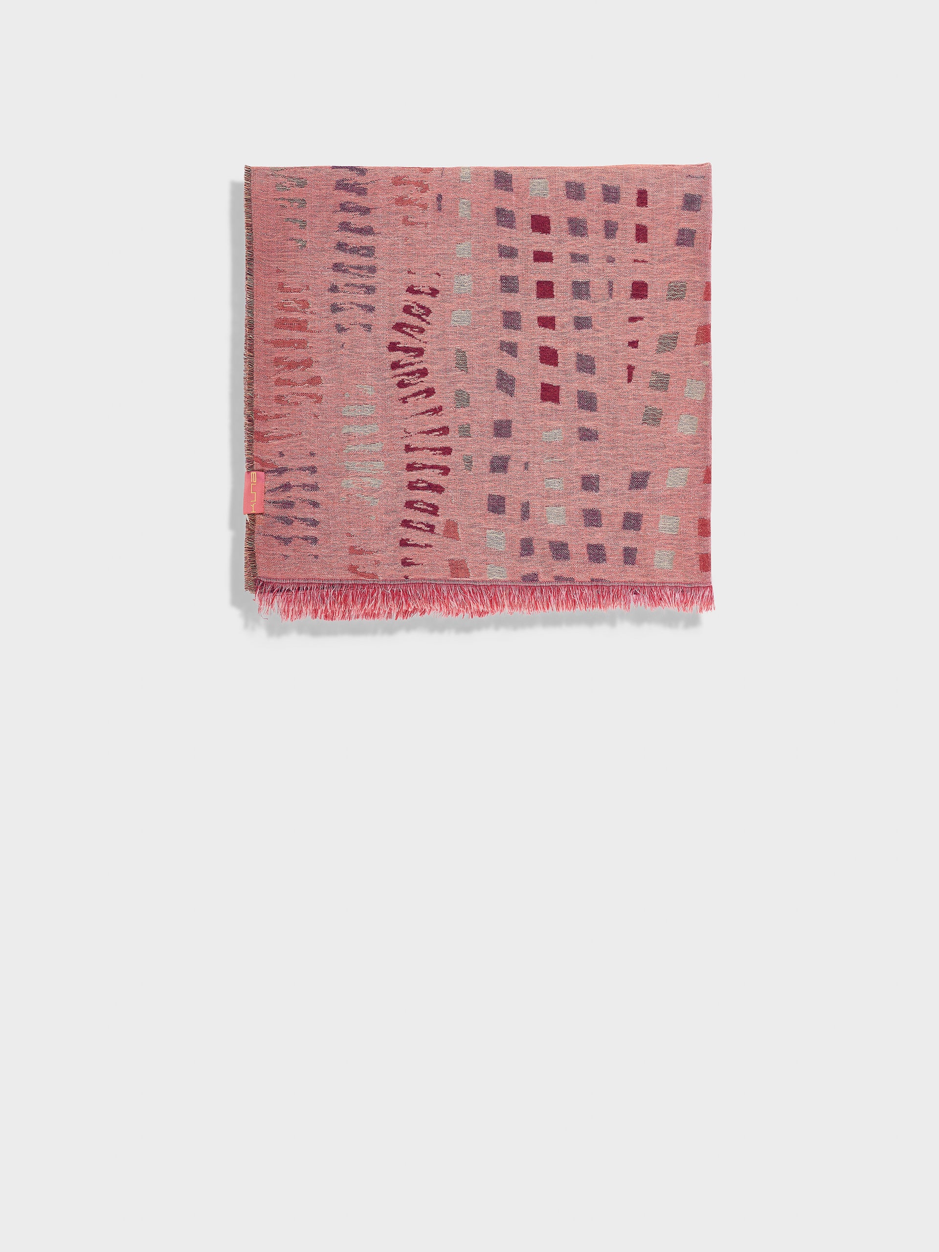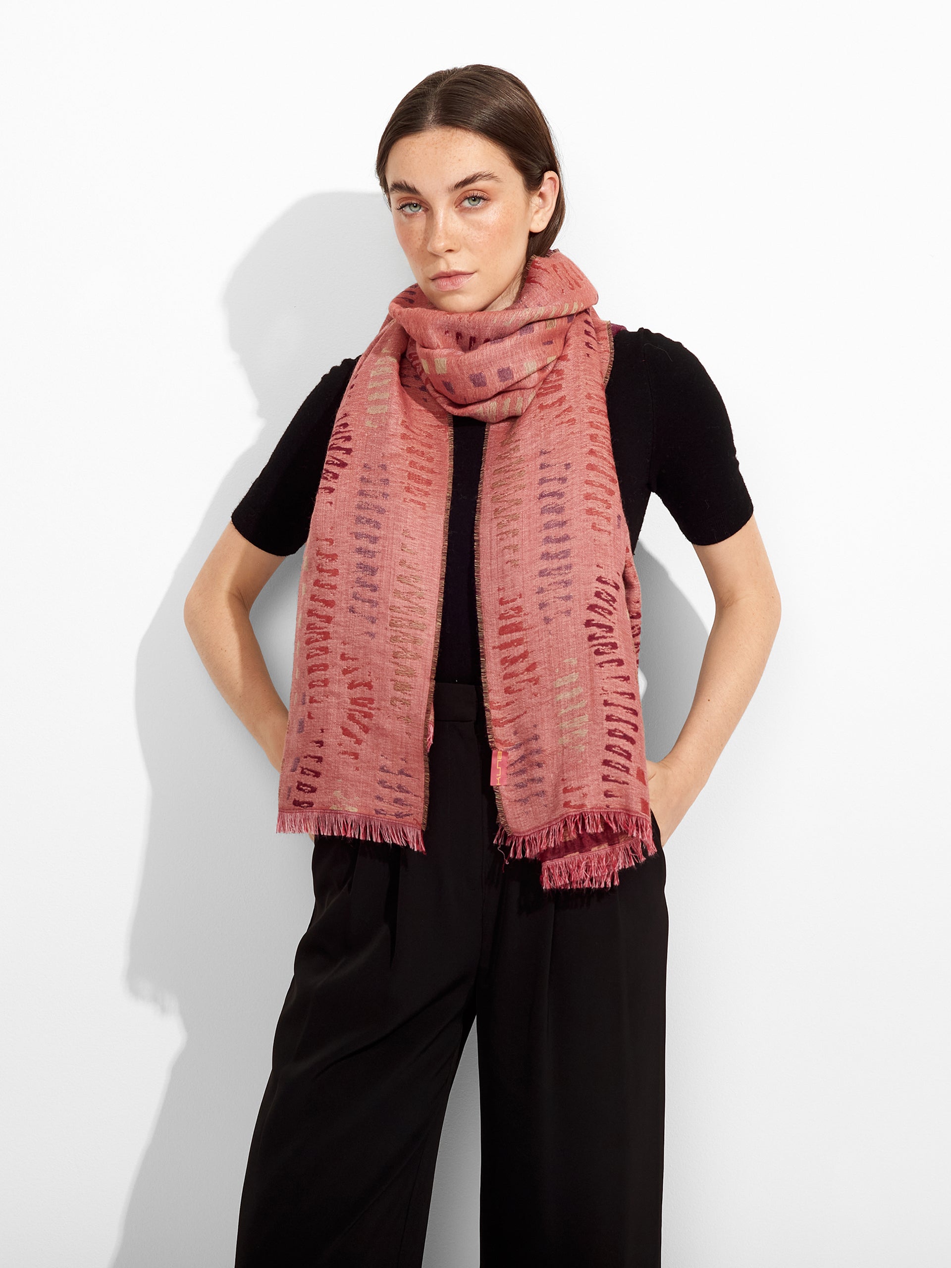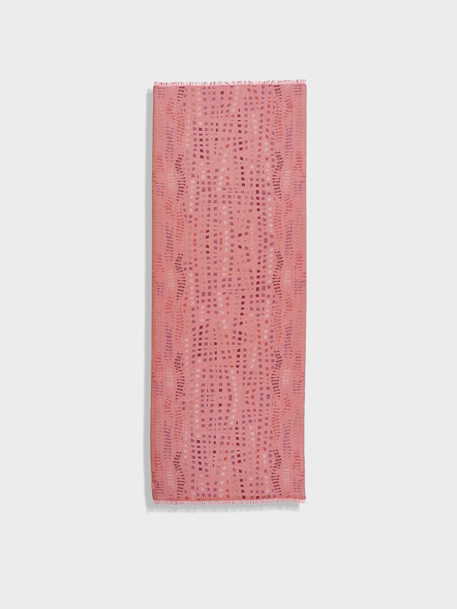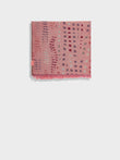 Estola Zane en tonalidad rosado, presenta tejido jaquard con un diseño de líneas irregulares y bordes con flecos finos que completan su acabado. Confeccionada en baby alpaca y seda. | Material predominante: Baby Alpaca