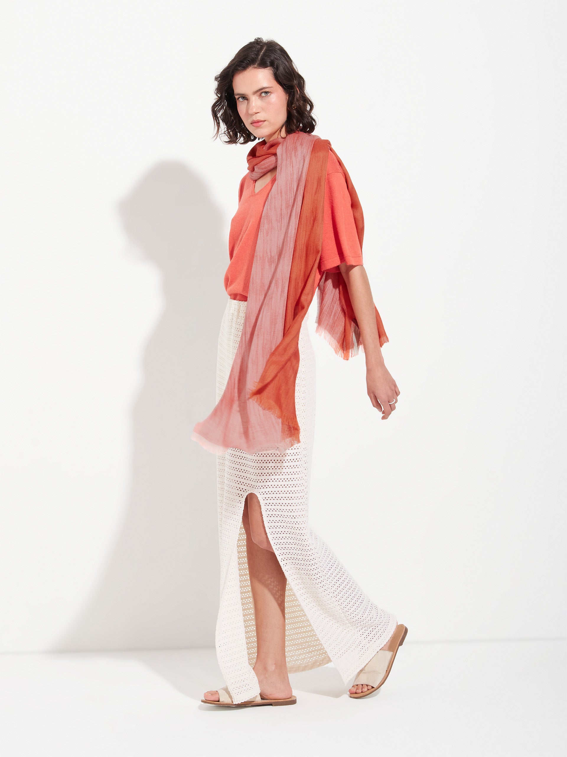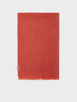 Estola Zankov en tonalidad rojo, confeccionada en baby alpaca y seda. Presenta un diseño jaspeado desflecado en tejido satín jacquard, que aporta textura y movimiento. Ideal para complementar con elegancia cualquier atuendo. | Material predominante: Baby Alpaca