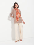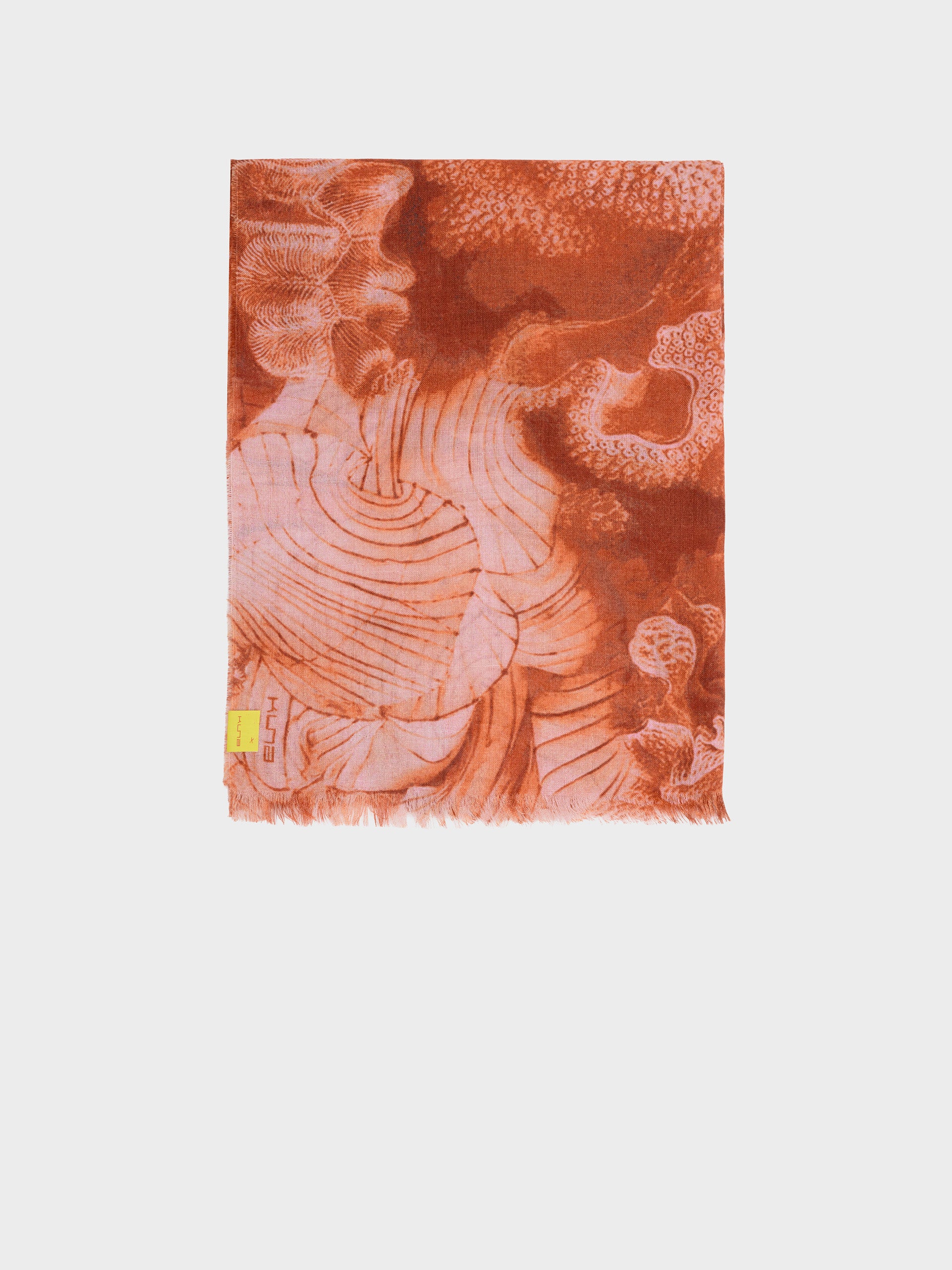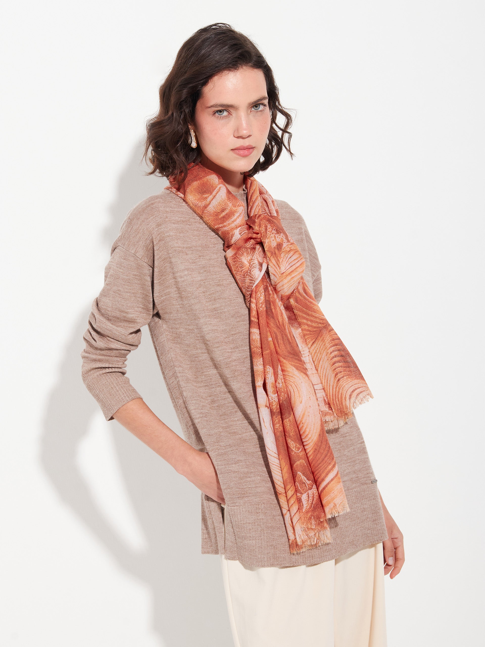 Estola Zanone en tonalidad naranja, confeccionada en baby alpaca y seda. Presenta un delicado estampado digital y volantes que aportan movimiento y fluidez. Ideal para añadir un toque artístico y sofisticado. | Material predominante: Baby Alpaca