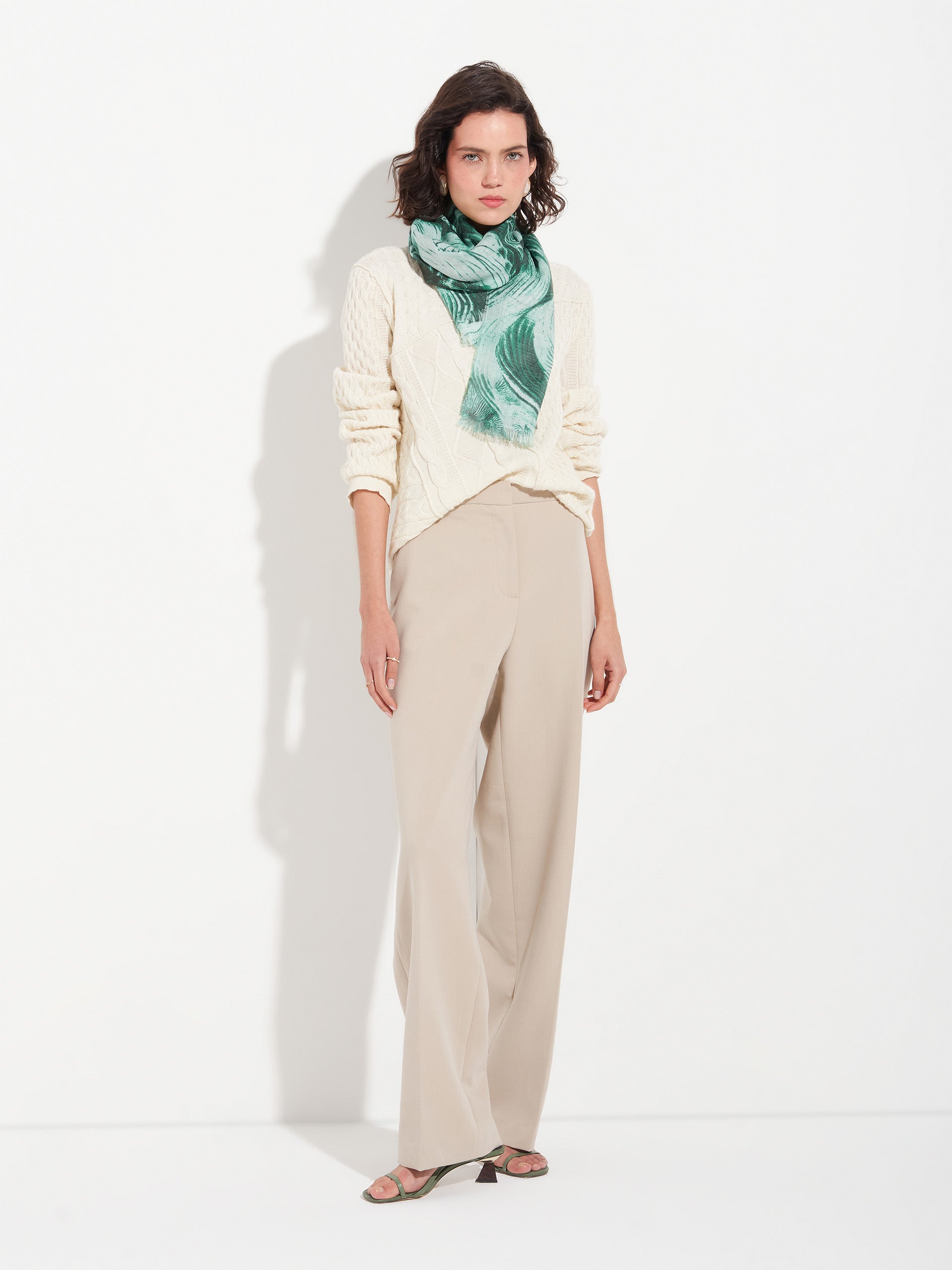 Estola Zanone en tonalidad verde, confeccionada en baby alpaca y seda. Presenta un delicado estampado digital y volantes que aportan movimiento y fluidez. Ideal para añadir un toque artístico y sofisticado. | Material predominante: Baby Alpaca