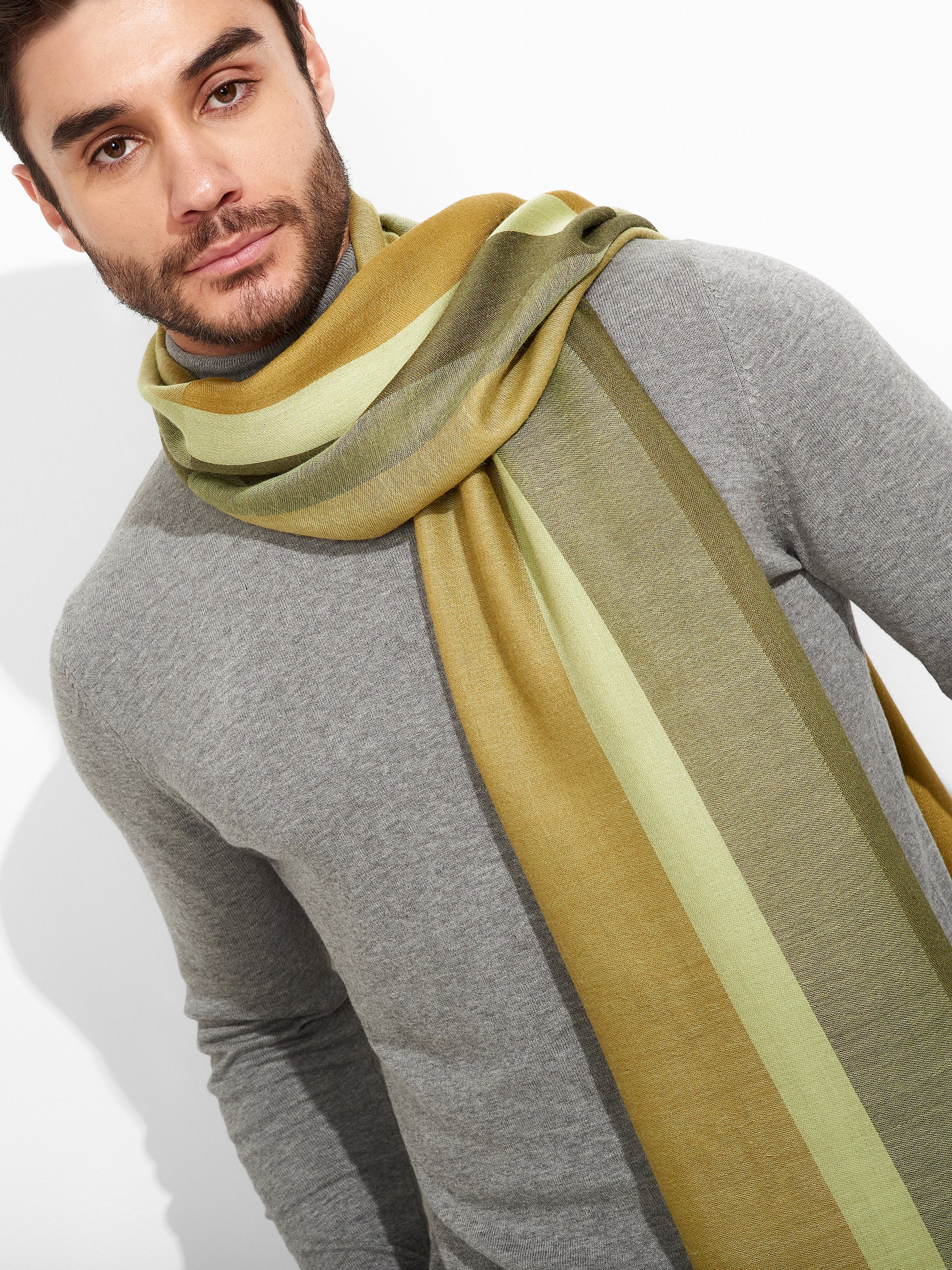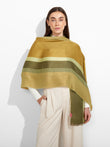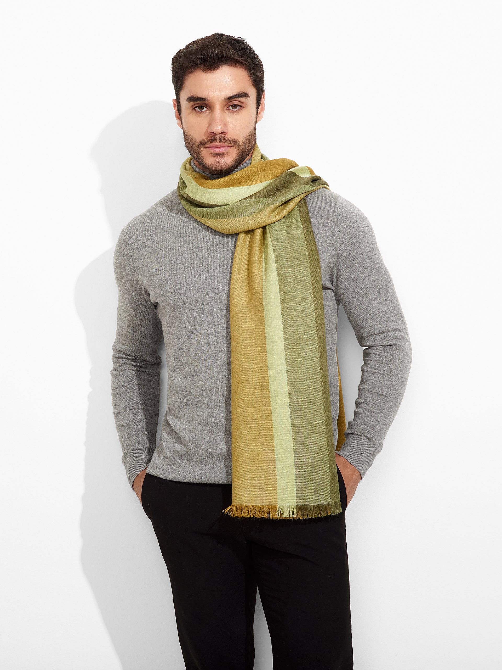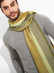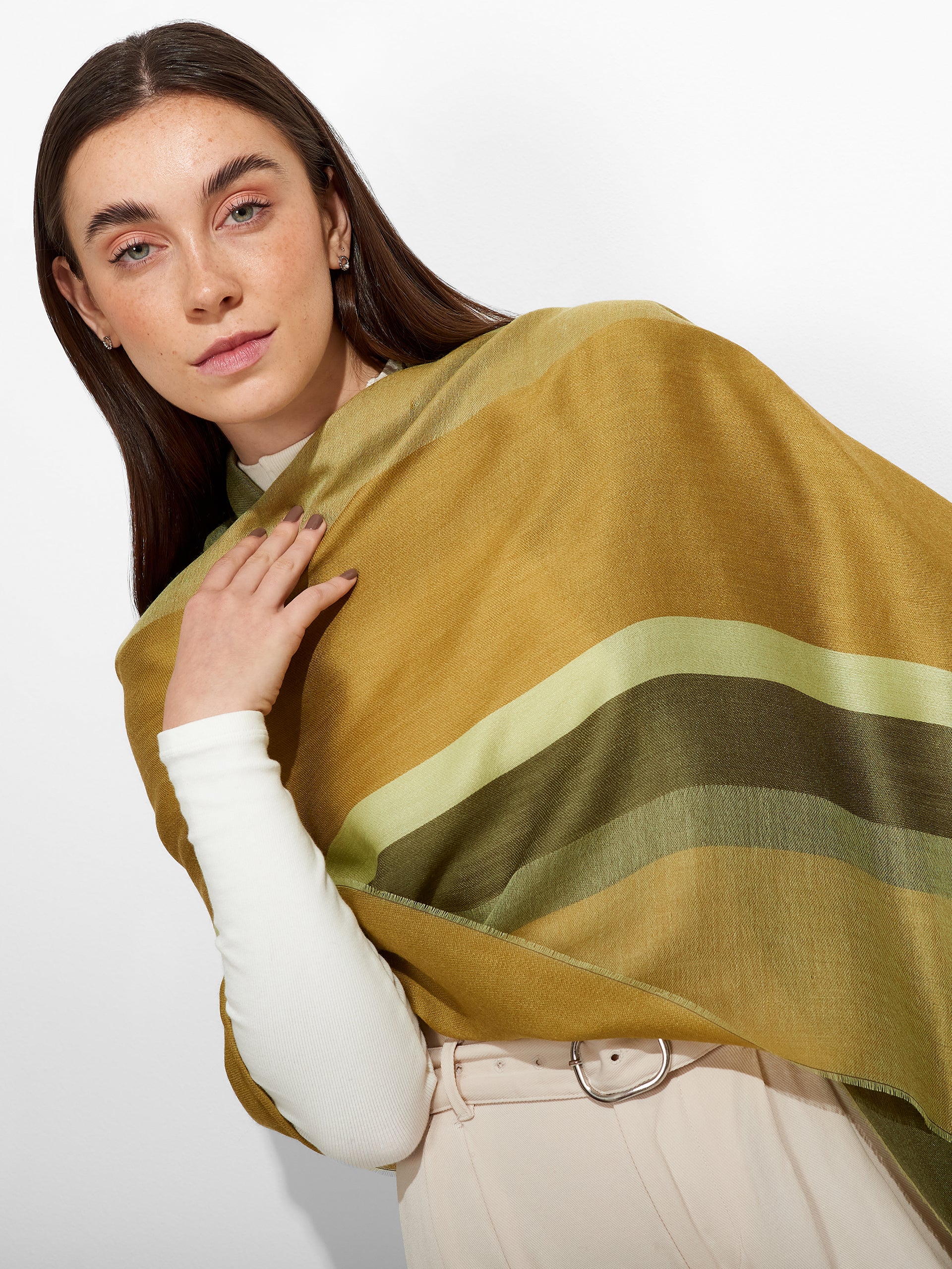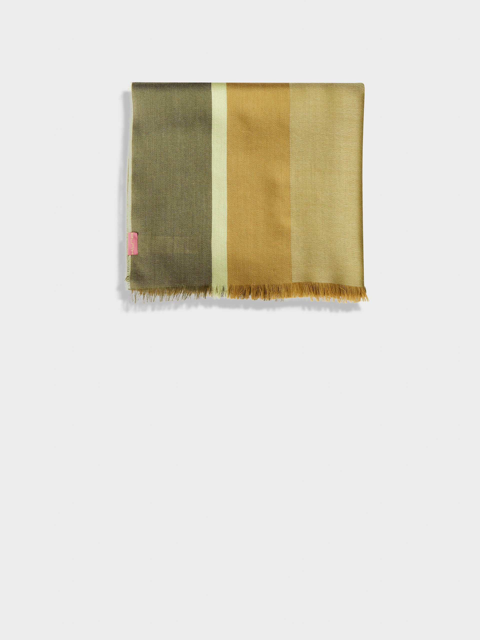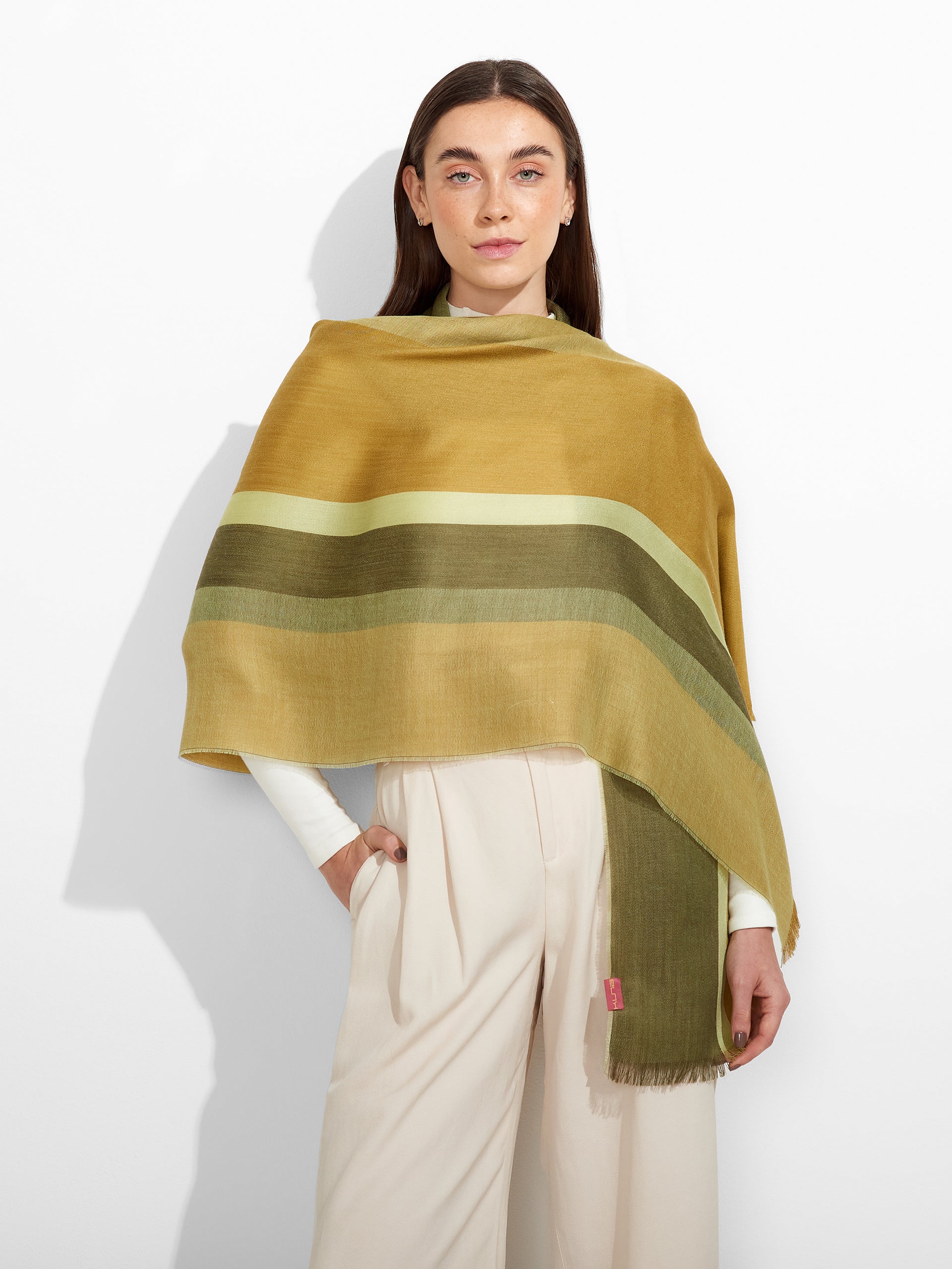 Estola Zarry en tonalidad verde, de diseño plano con rayas laterales que aportan un sutil contraste, presenta bordes con flecos finos. Confeccionada en una mezcla de baby alpaca y seda. | Material predominante: Baby Alpaca