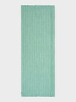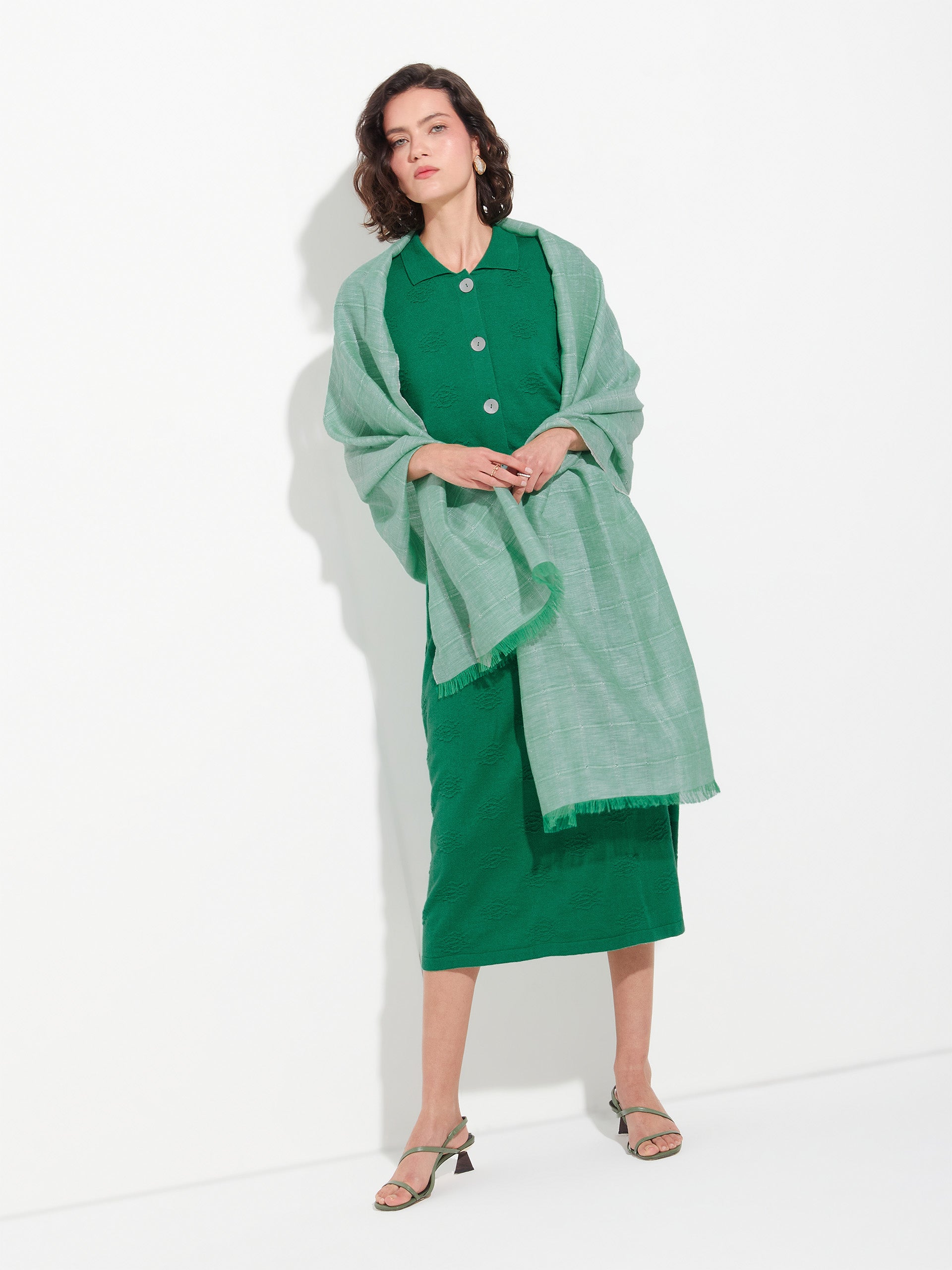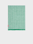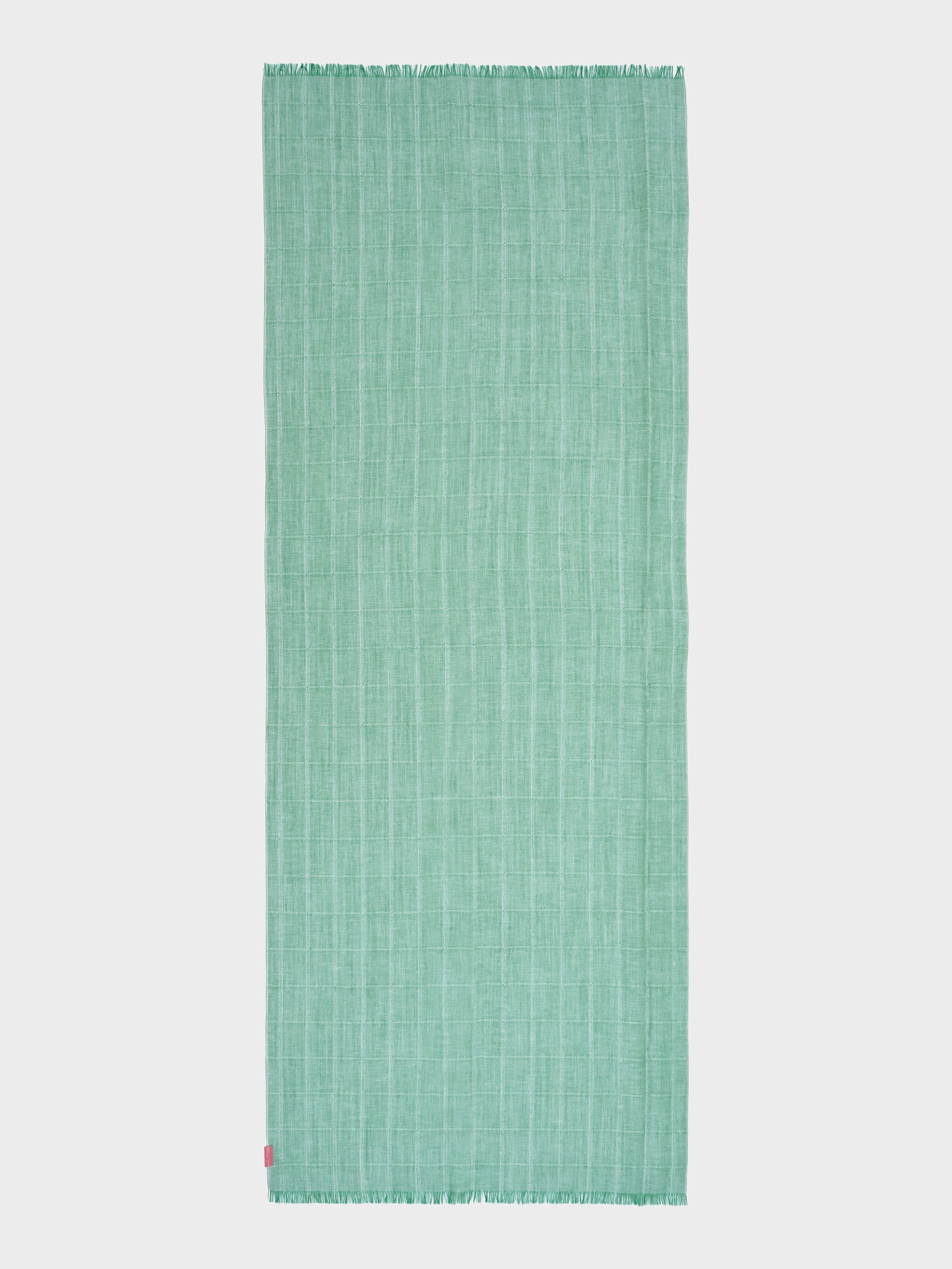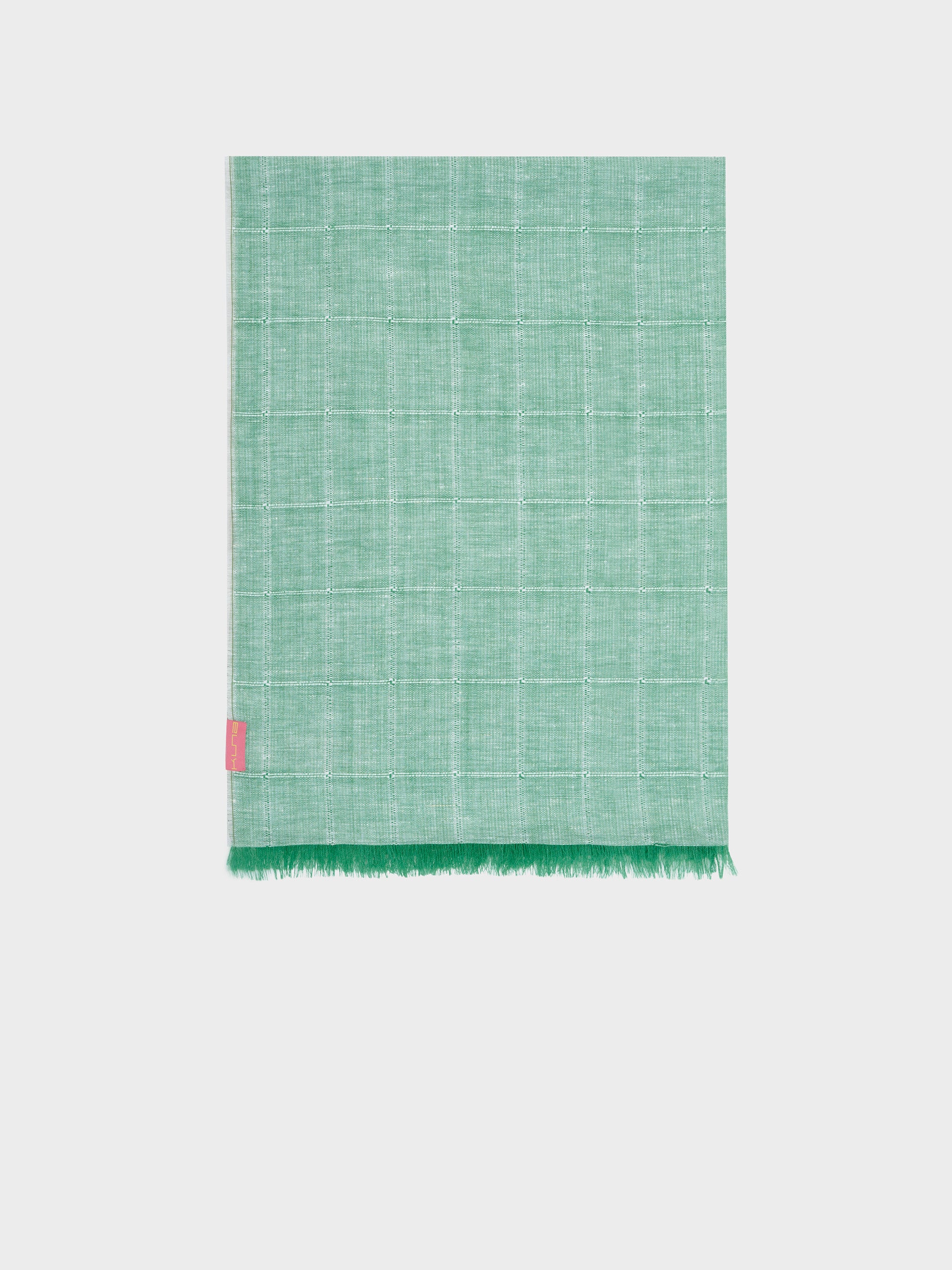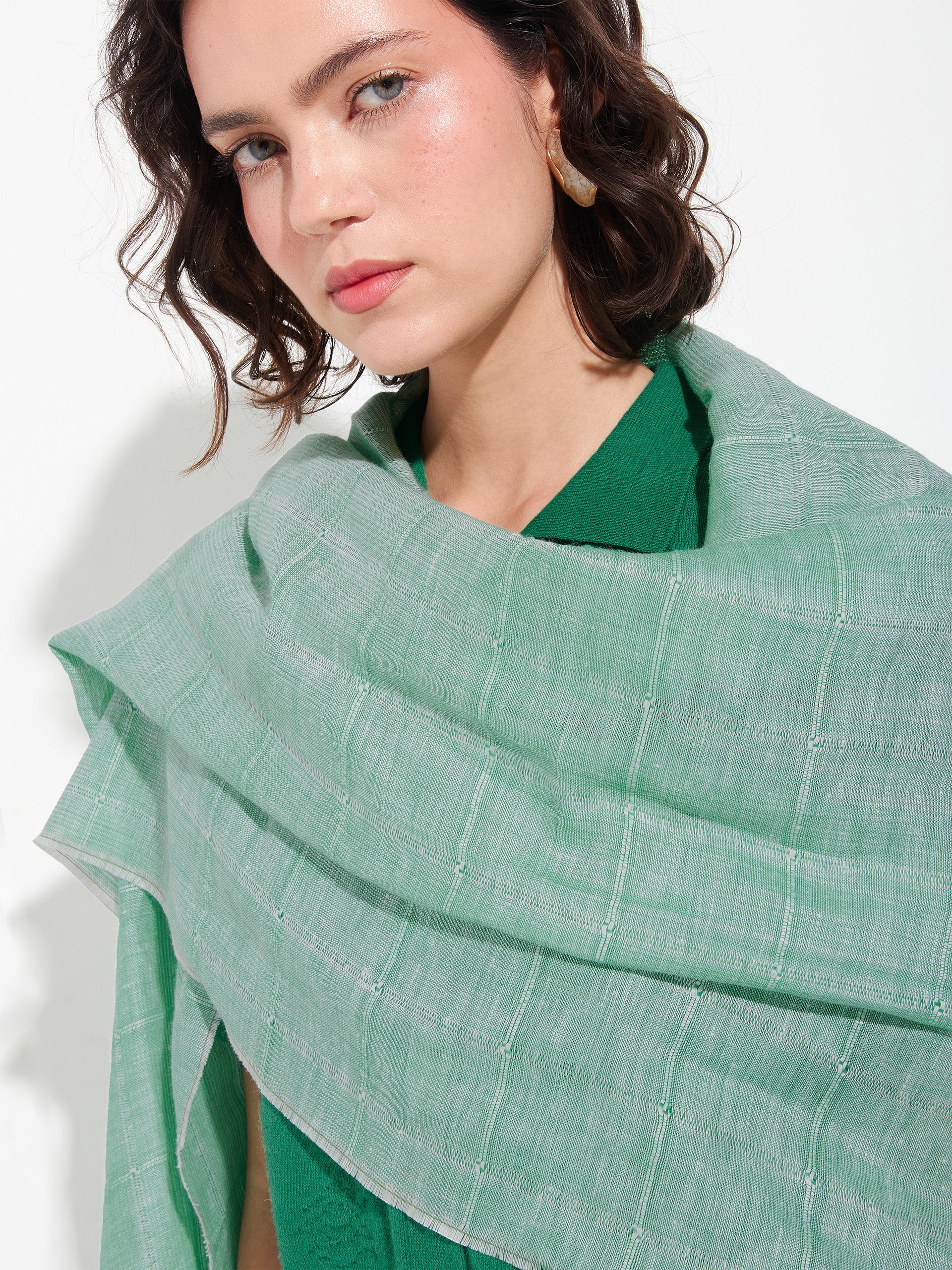 Estola Zoda en tonalidad verde, elaborada en una mezcla de baby alpaca, seda y lino. Presenta un diseño a cuadros en panamá y tafetán con acabado desflecado, que combina ligereza, frescura y estilo artesanal. | Material predominante: Baby Alpaca