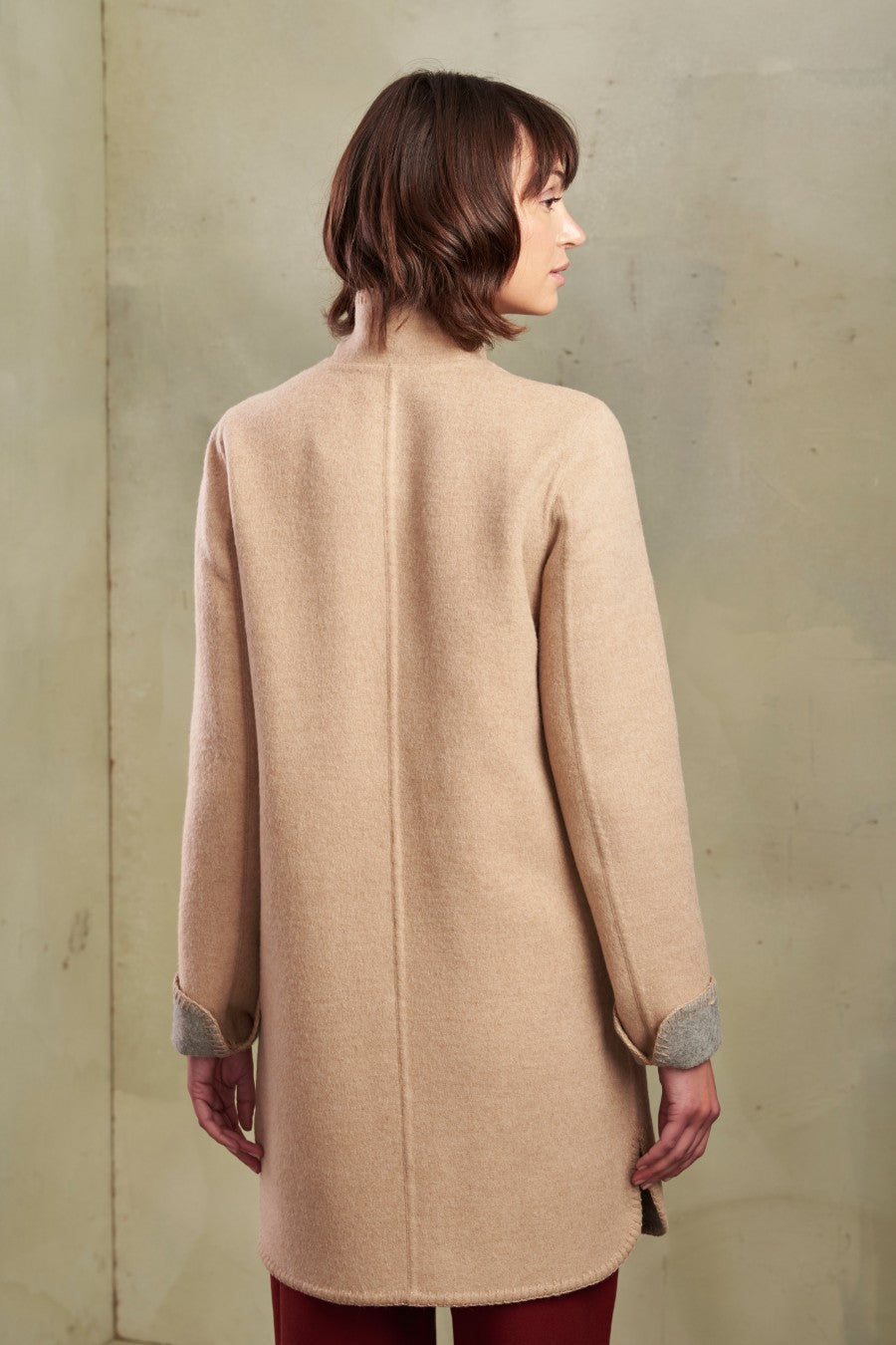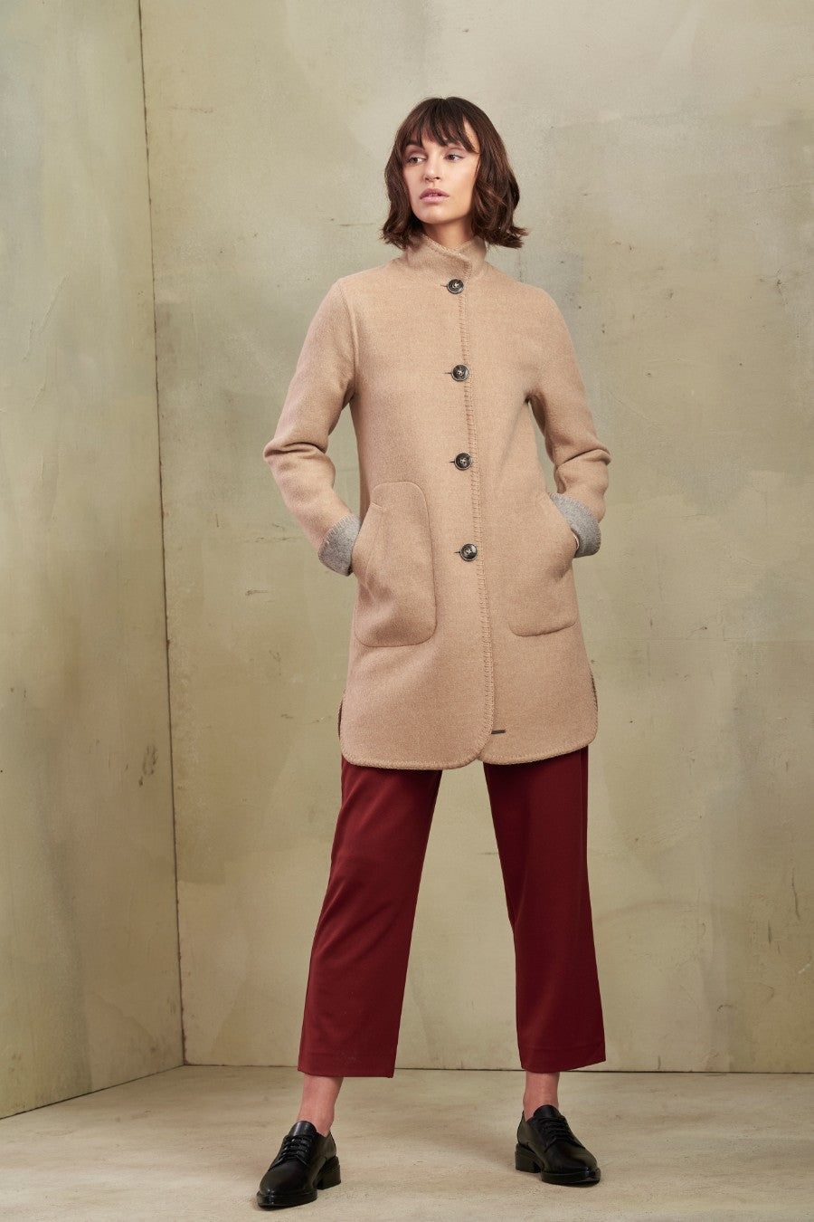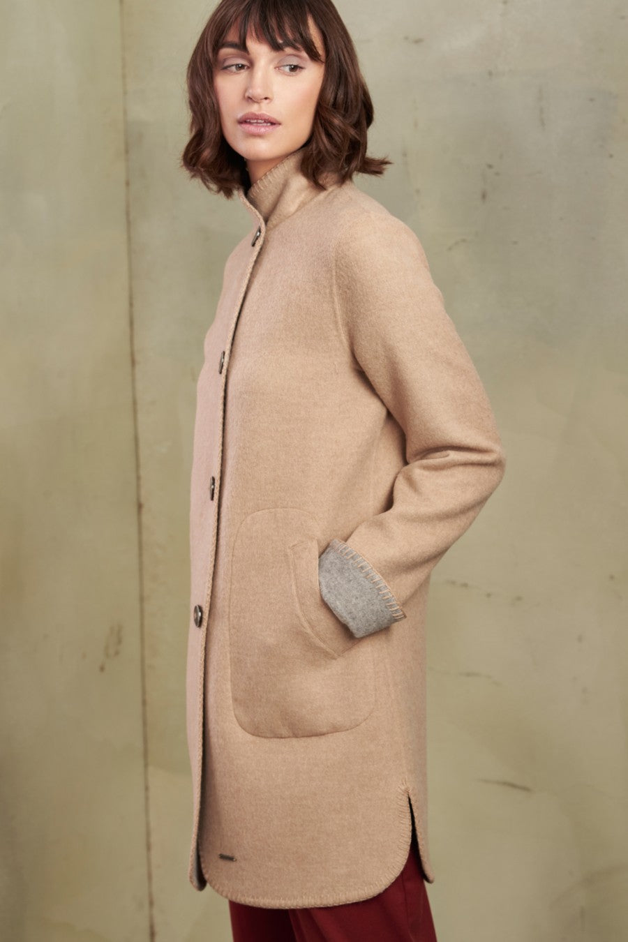 Baby alpaca, wool and nylon combine to wonderful effect in our Satis reversible coat. With large lined pockets, this garment is ideal for wintry weather.