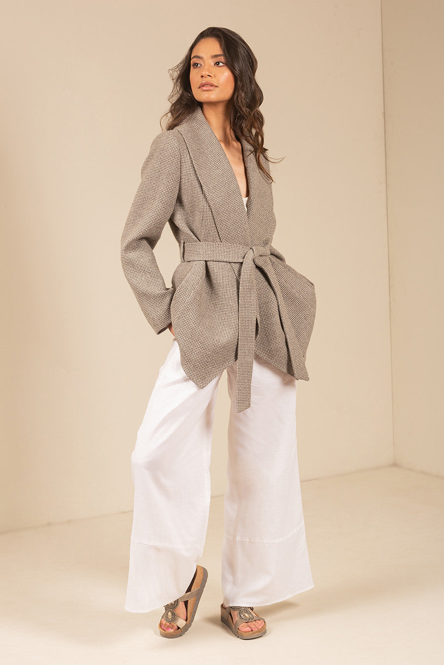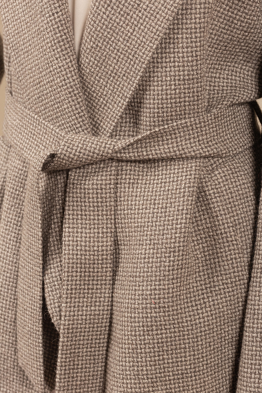 Comfortable and contemporary lines give new life to the classic style of our jacket. Large lapel and a belt tied around the waist characterize the style of this garment, enhancing the feminine figure, elegant and casual luxury. Made with 100% eco-friendly baby alpaca fabric, it is a sustainable and very versatile garment. Combined with shorts it creates a modern and sophisticated summer style, while with long skirts and pants you can get a more formal look.