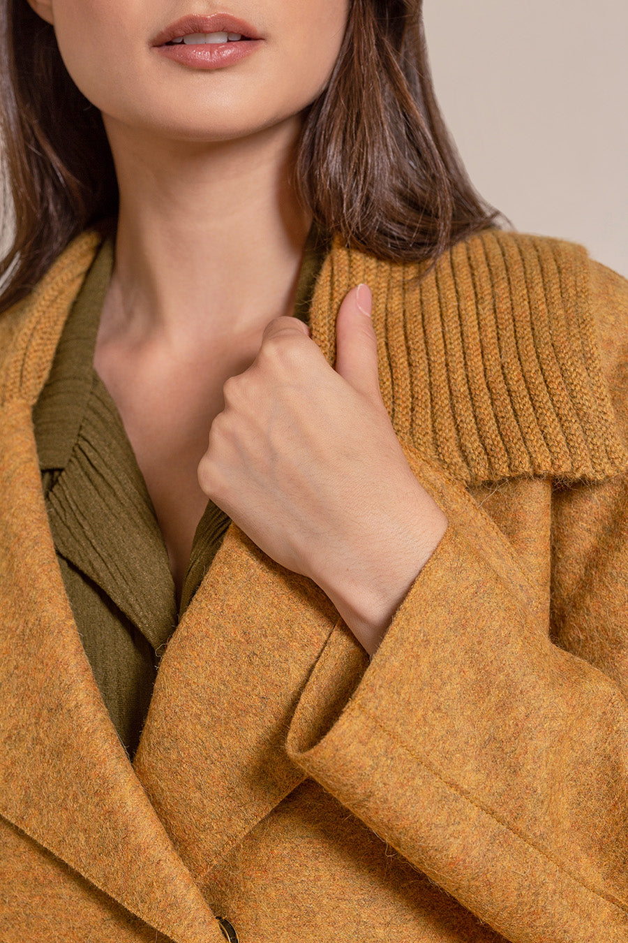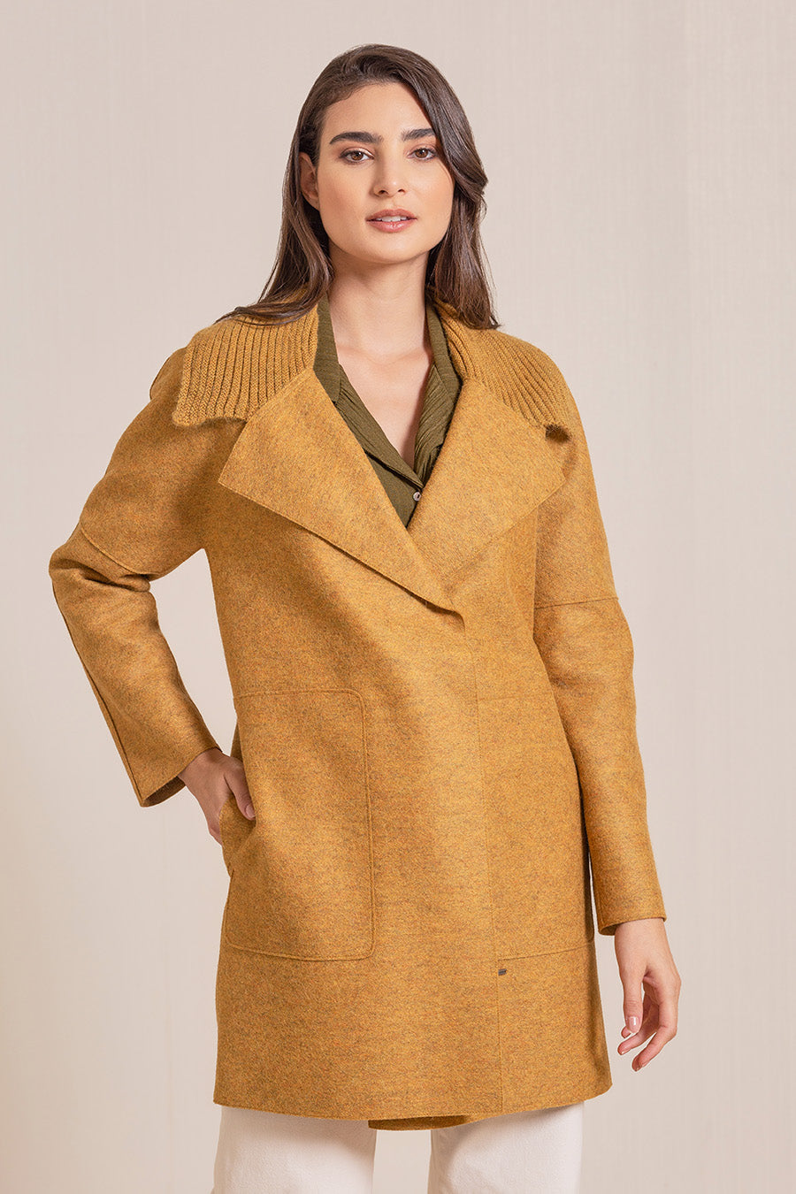 Made of felted fabric, our Vegas coat is embellished with knitted details on the neck to make it even cosier, great for the coldest days of the season.