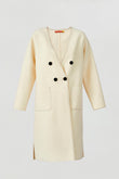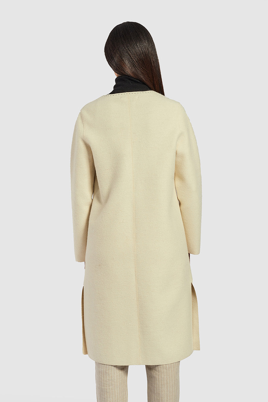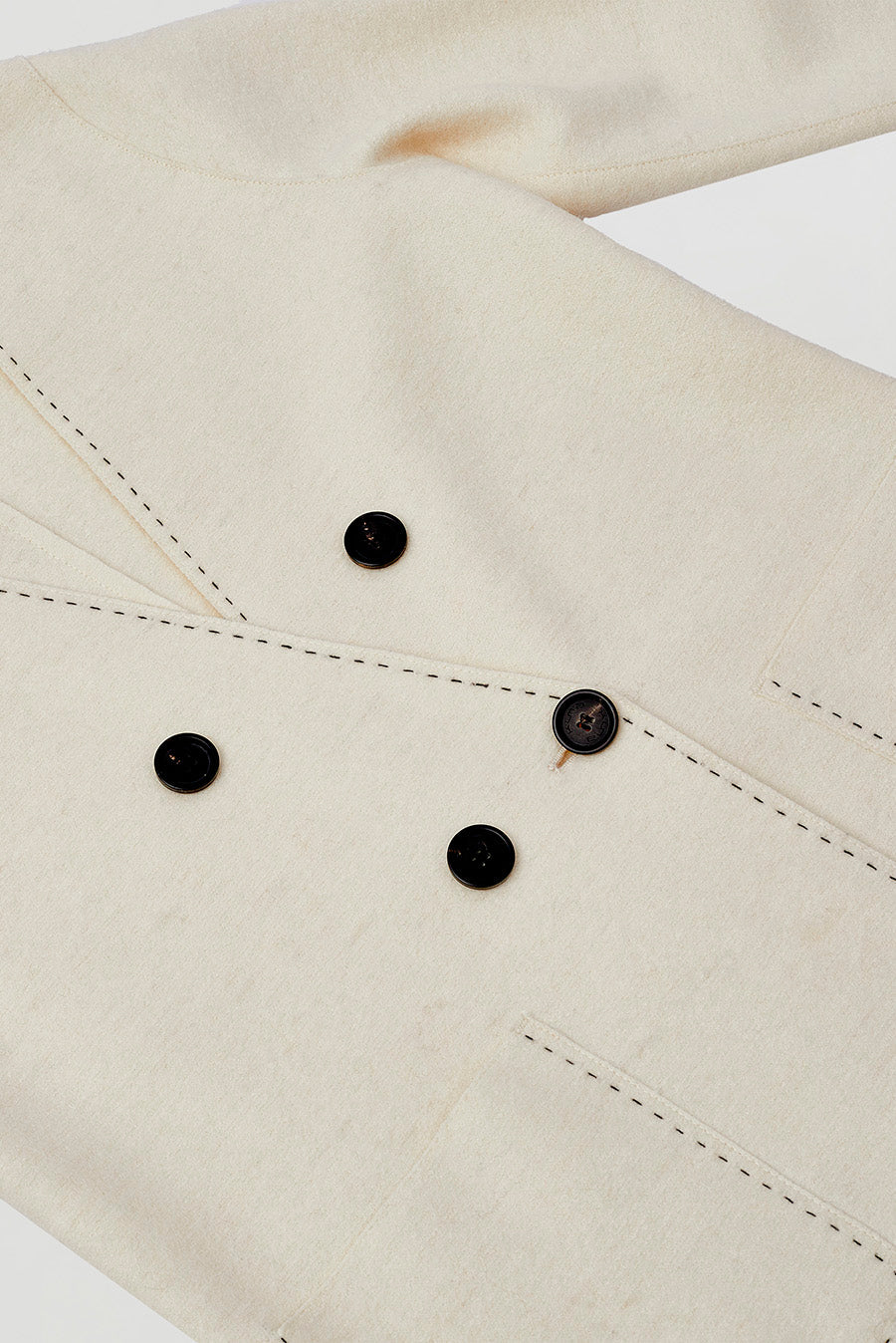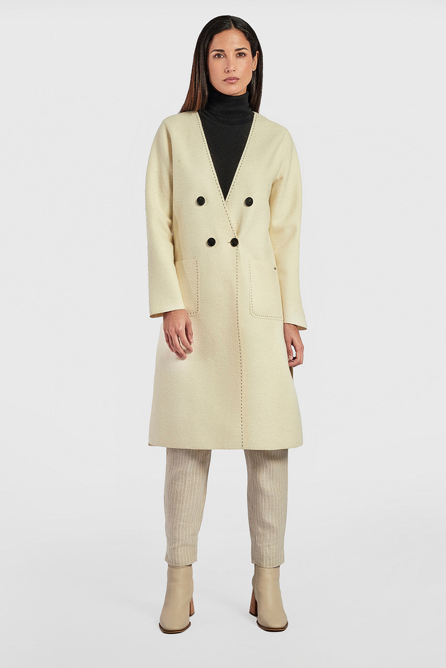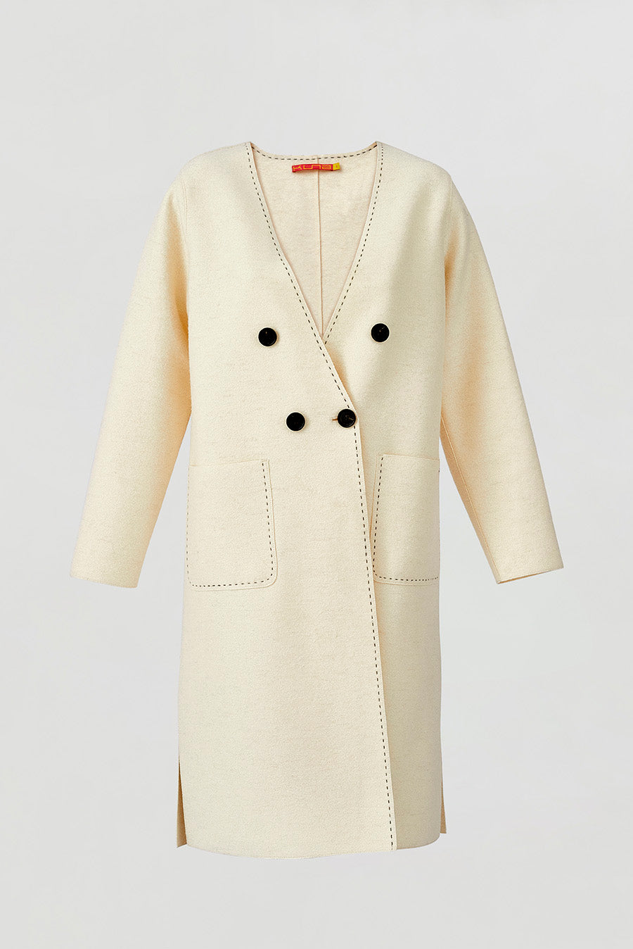 Our Warsaw coat is made of alpaca and wool felt fabric. The large pockets make it very practical, and the stitching add a unique touch.