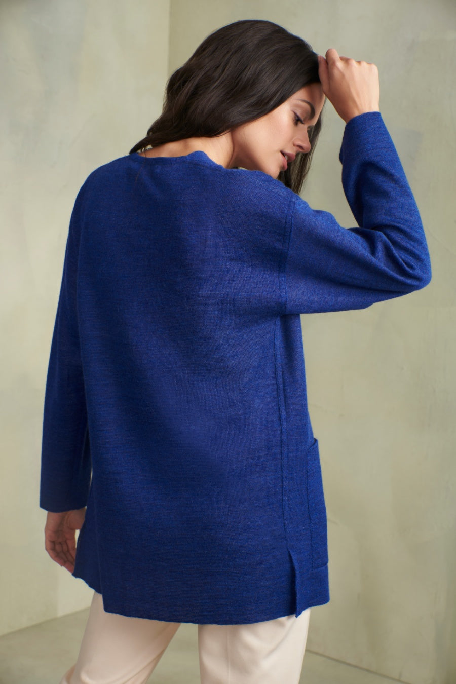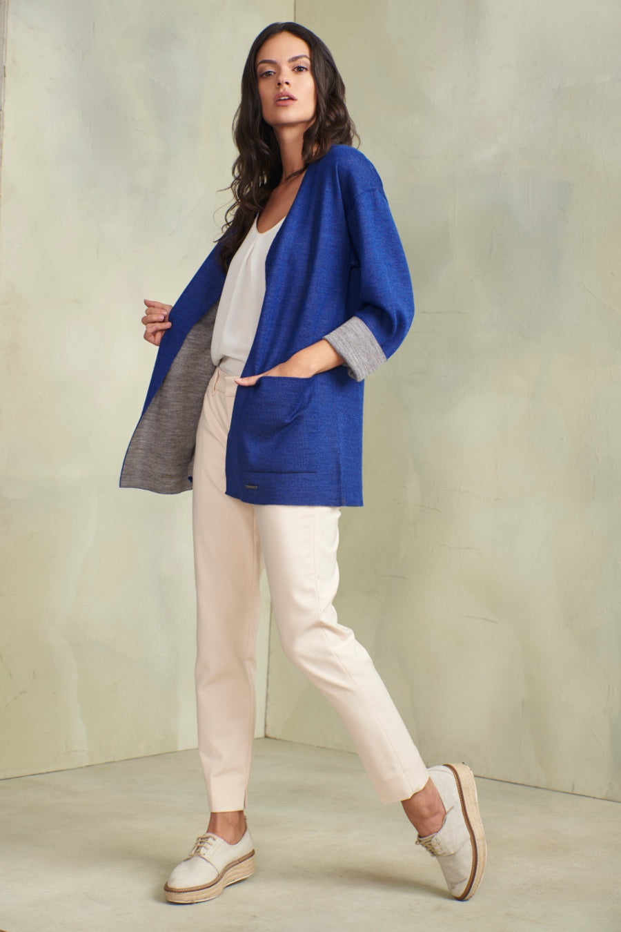 Enhance your style with this elegant and sober double-sided cardigan. Versatile long-sleeved piece with wide pockets, made of noble baby alpaca fibers and silk.