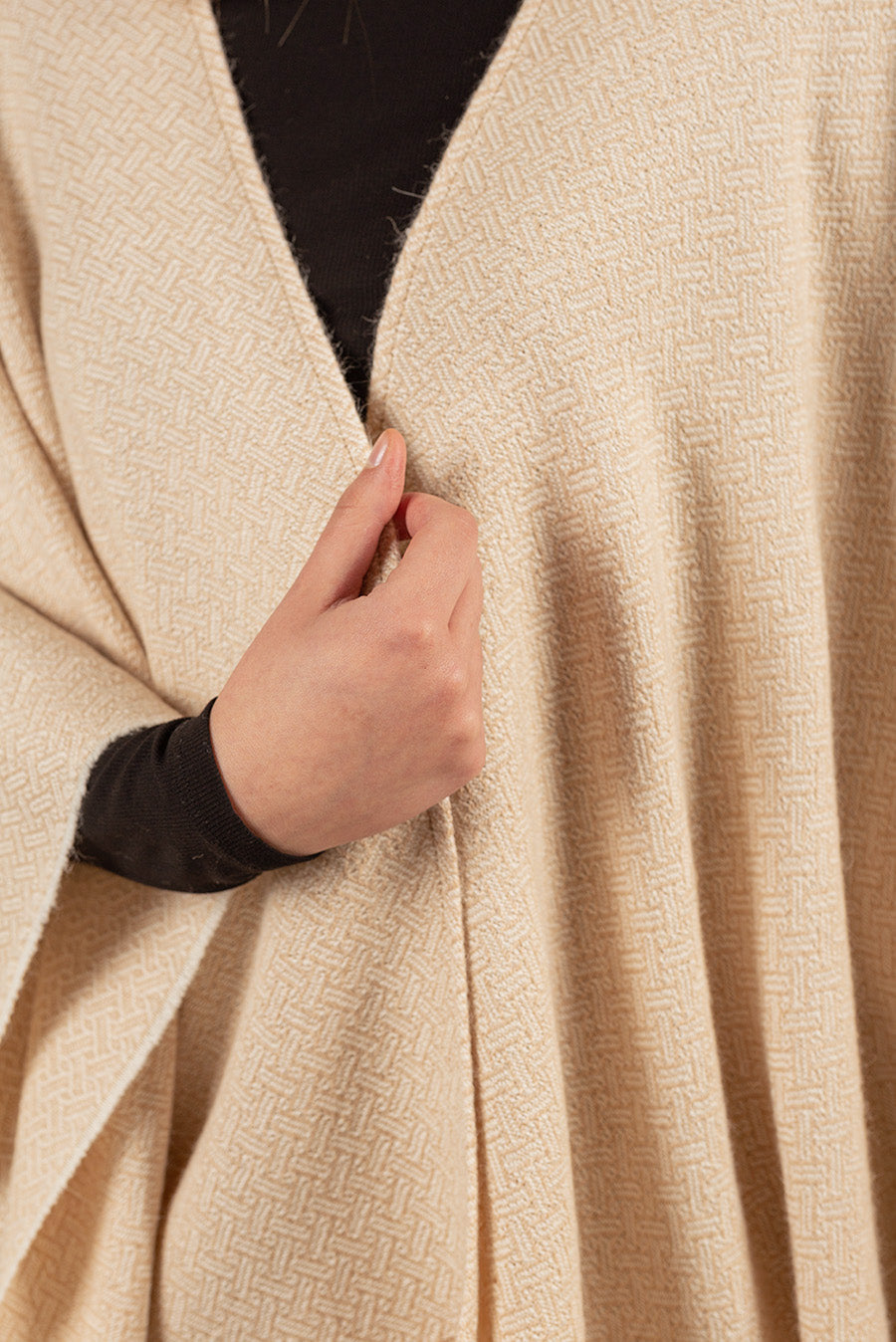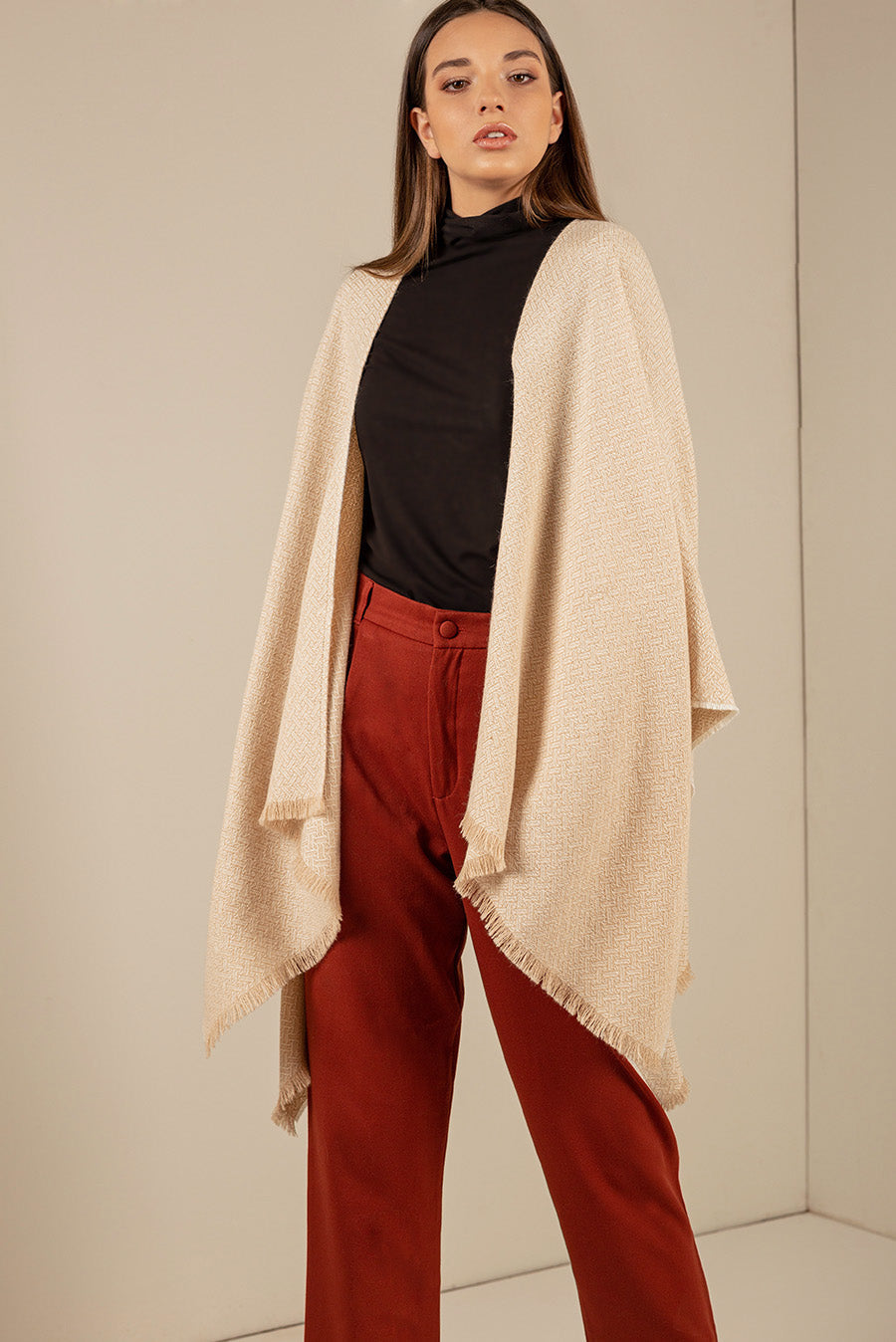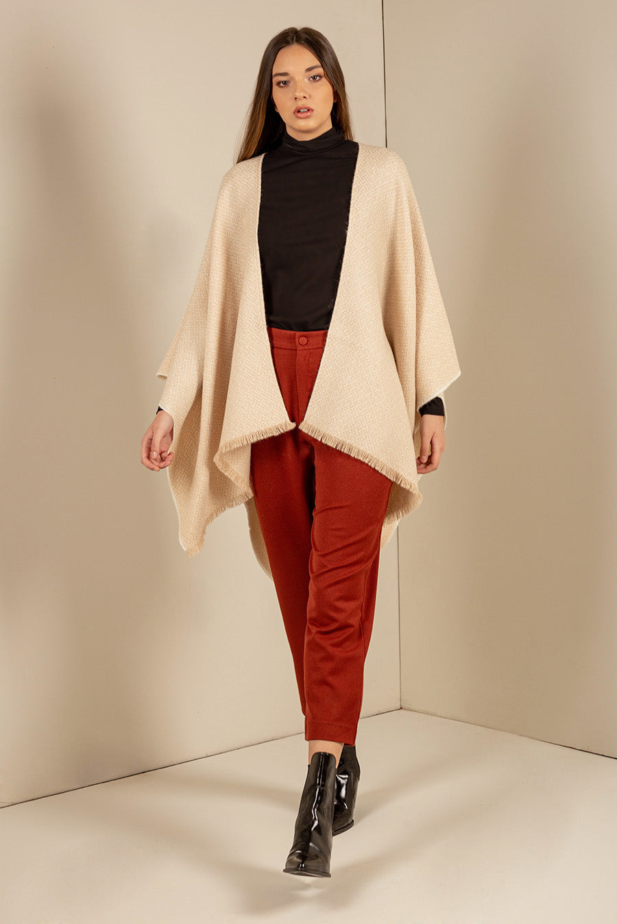 Our jacquard Uscita cape is an eye-catching and sophisticated piece in neutral colours. The geometric designs and tassels on the sides add a special touch and the great drape and unique texture are truly flattering.