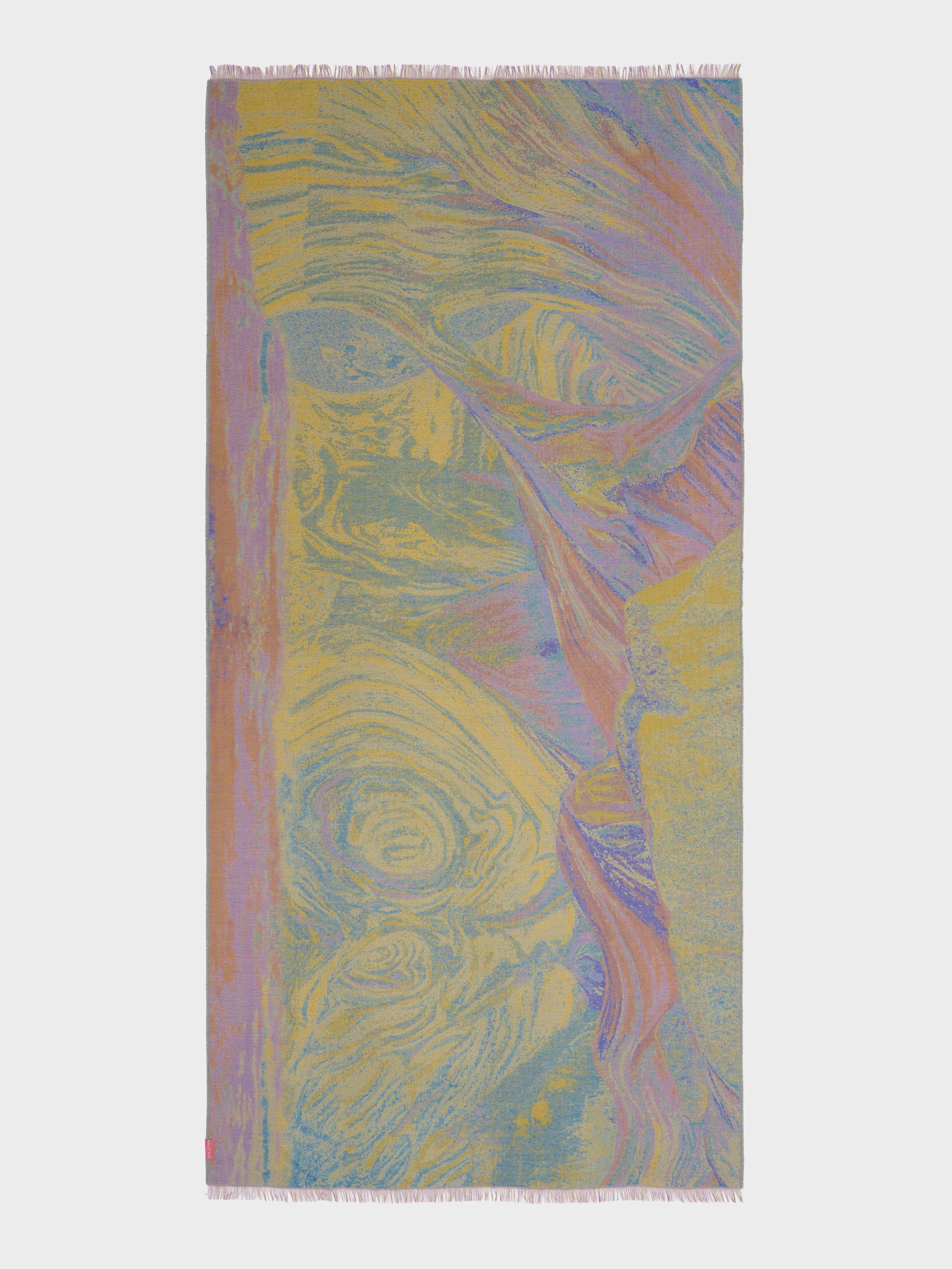 Situado en la ribera del lago General Carrera, en un remoto rincón de la Patagonia, en Chile, esta maravilla natural evoca paradisíacas tonalidades turquesas y cristalinas, las cuales, a merced de los estratos de mármol, concilian a la perfección con el sosiego y el placer de este auténtico e imperdible santuario que la naturaleza nos ofrece. | Material predominante: Royal Alpaca y Seda