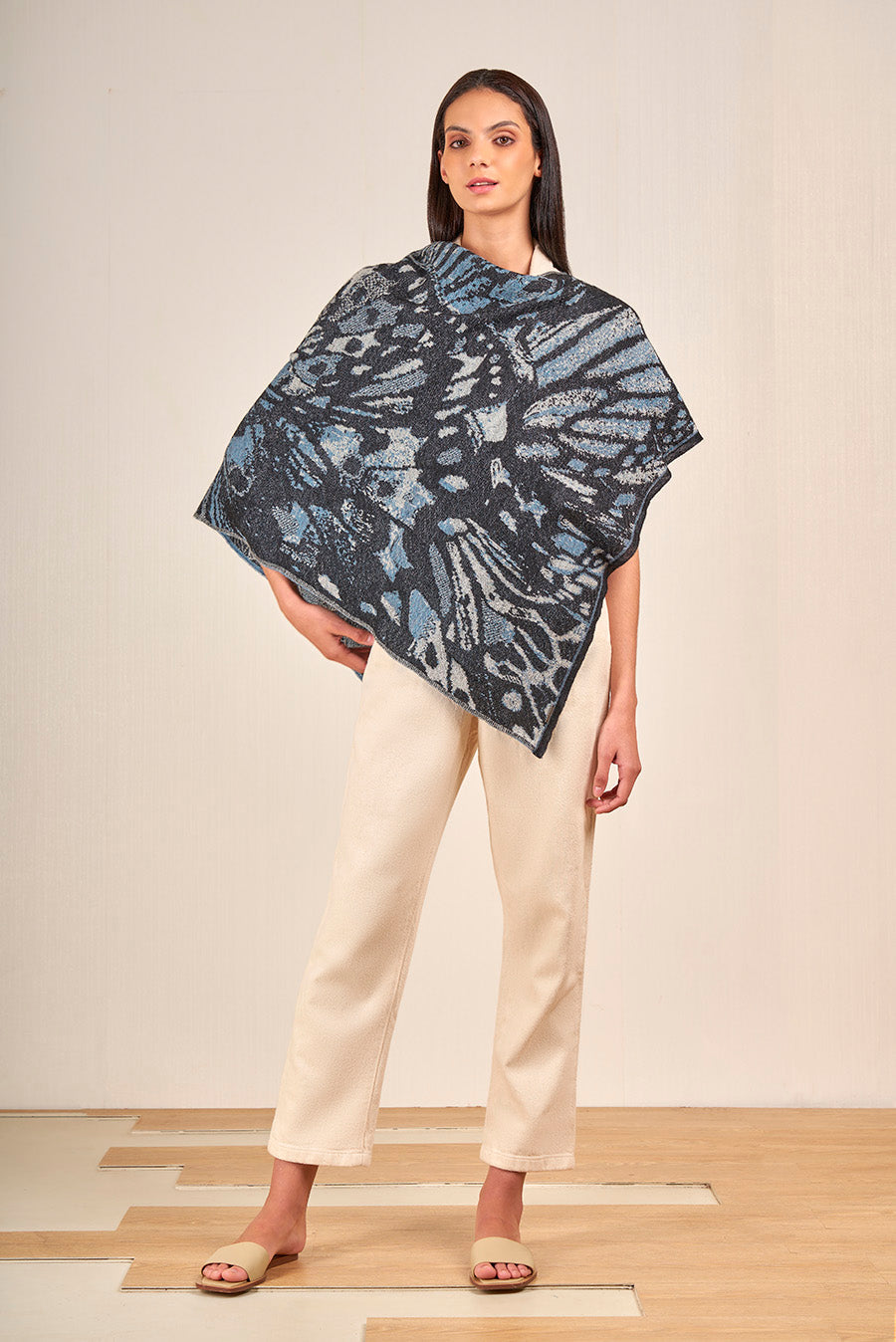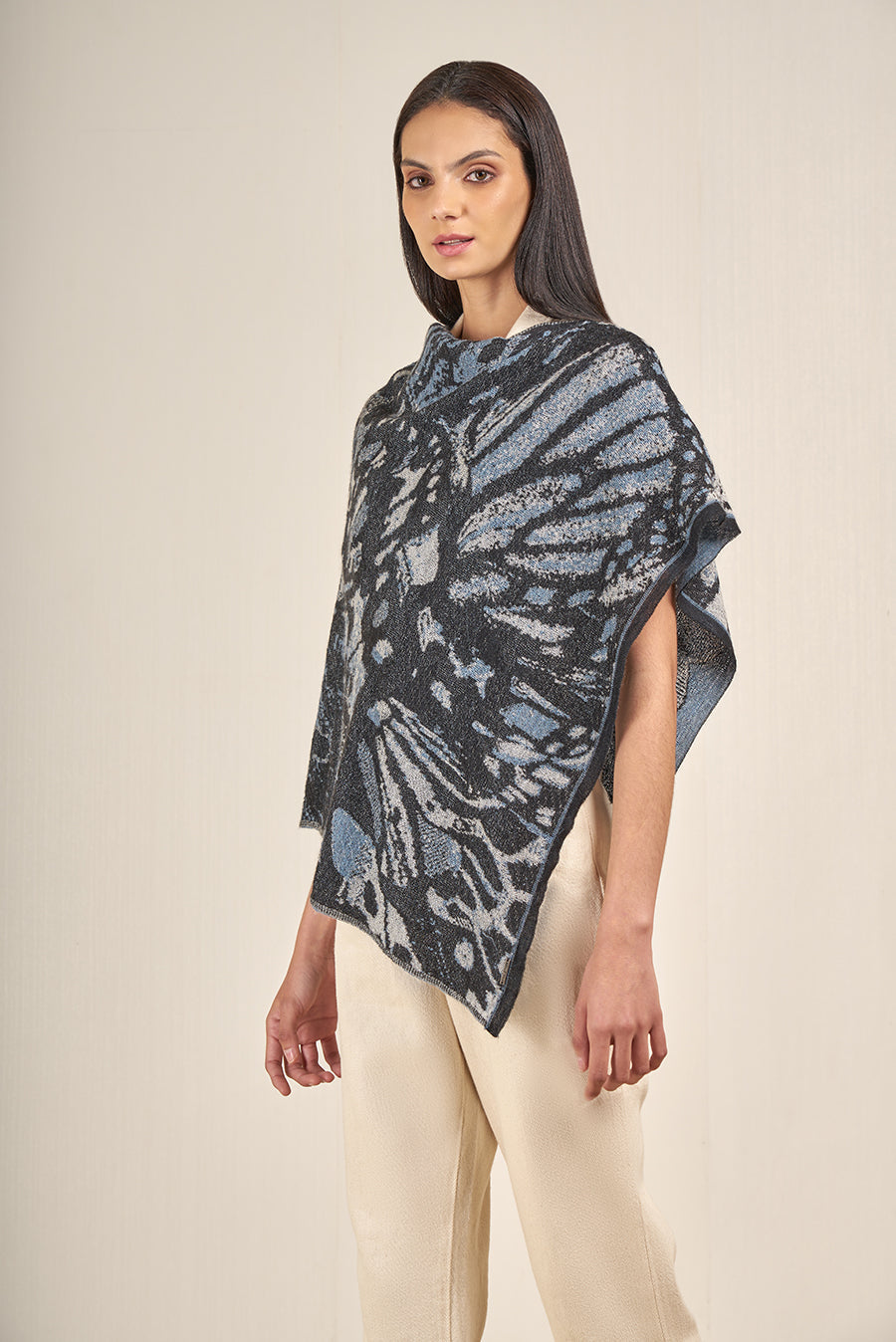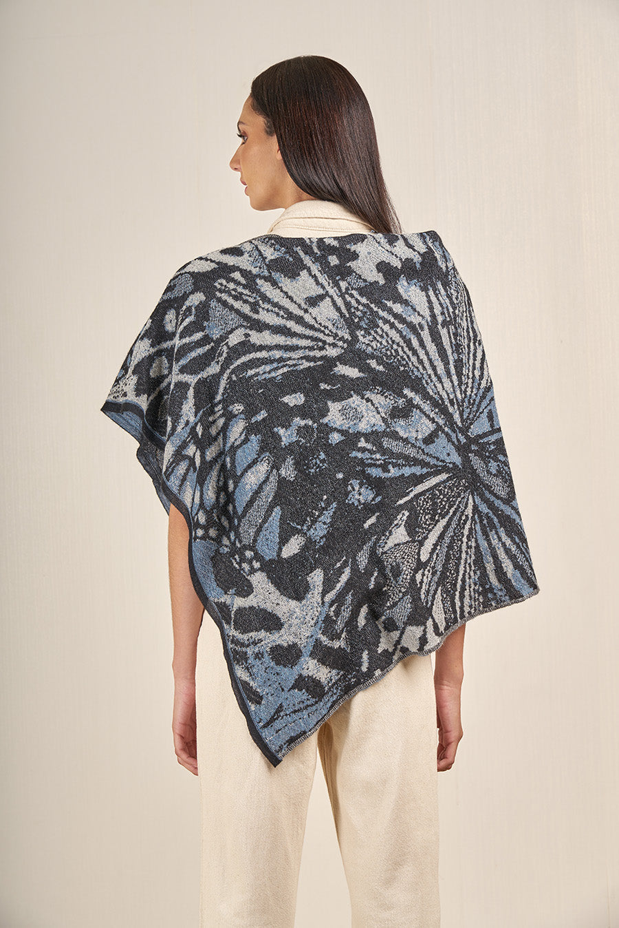 Made of a rich blend of baby alpaca and silk, our asymmetrical Vapiano poncho is a versatile piece in cool colours and embellished with a beautiful butterfly design.