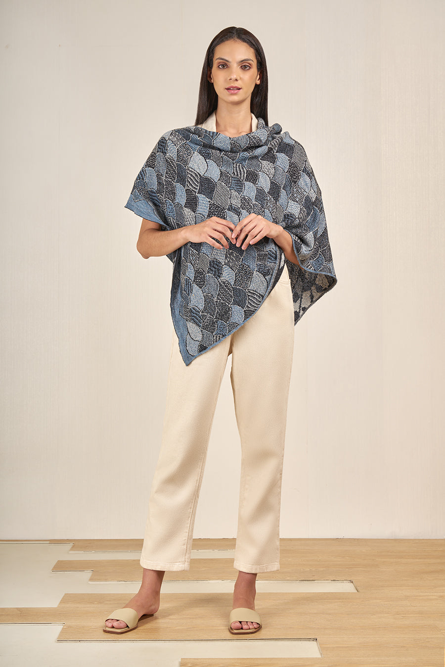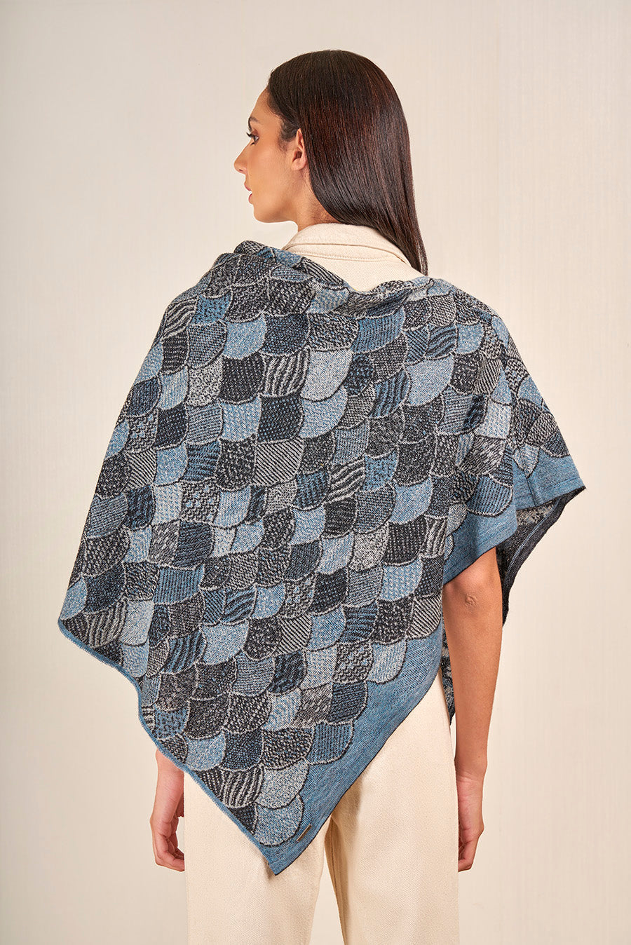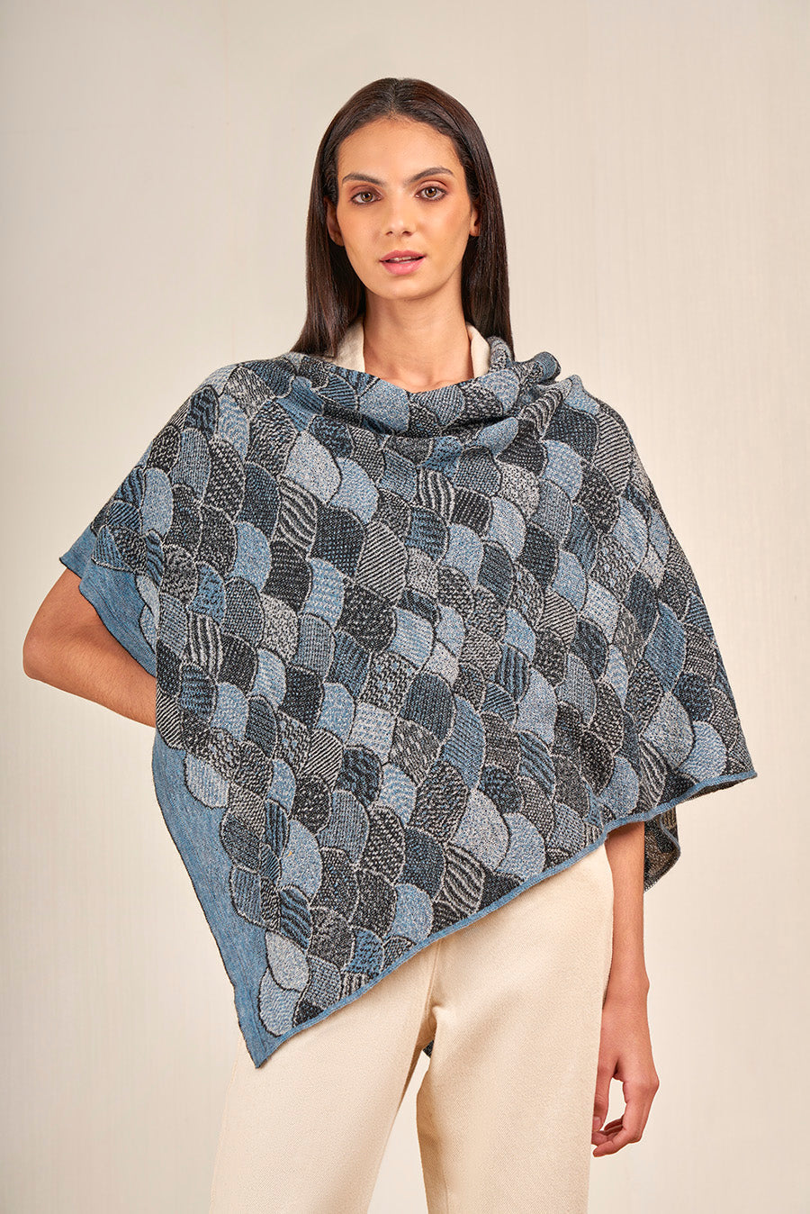 Made of a rich blend of baby alpaca and silk, our asymmetrical Vapiano poncho is a versatile piece in cool colours and embellished with a beautiful butterfly design.