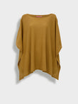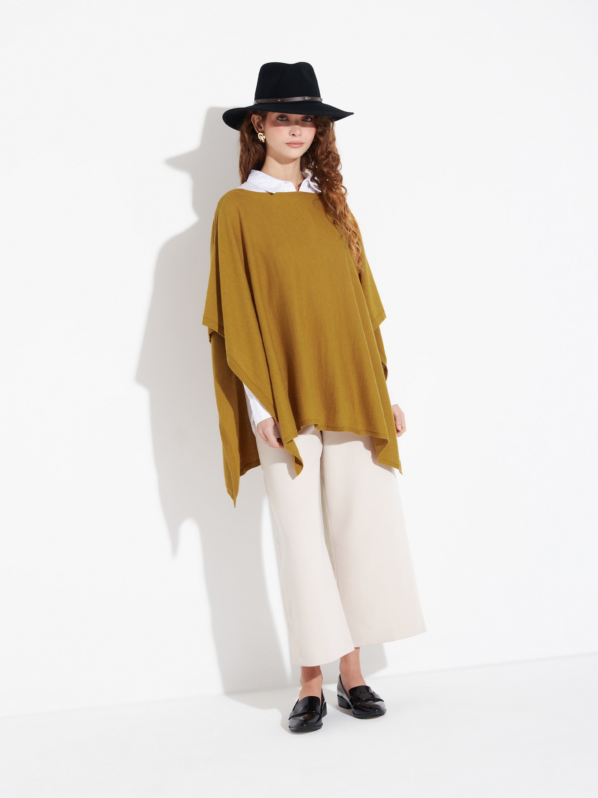Poncho Zarah en tonalidad amarillo, confeccionado en algodón orgánico y baby alpaca. Es un poncho cerrado de punto llano, ligero y suave, ideal para un estilo relajado y contemporáneo. | Material predominante: Algodon