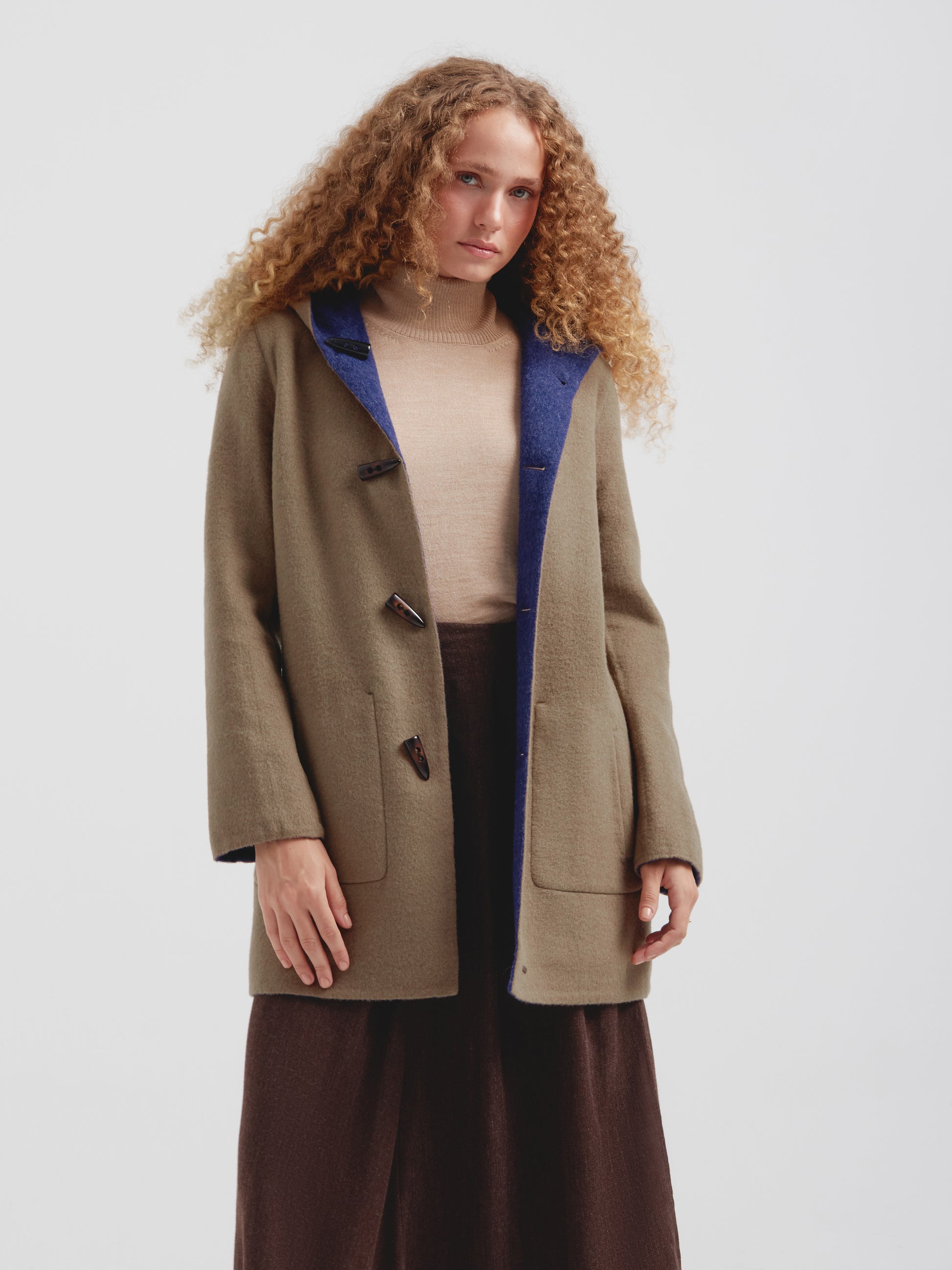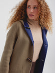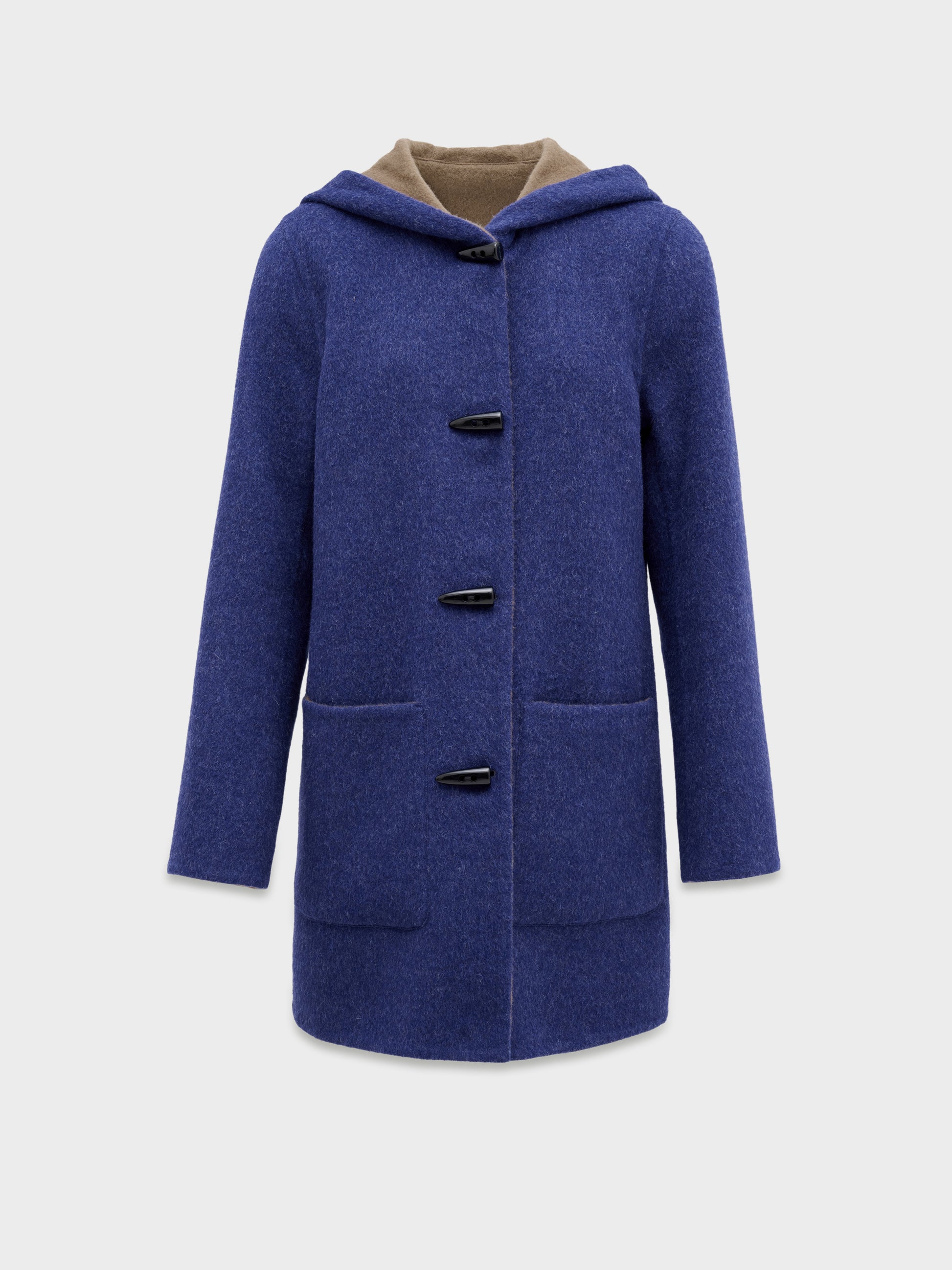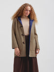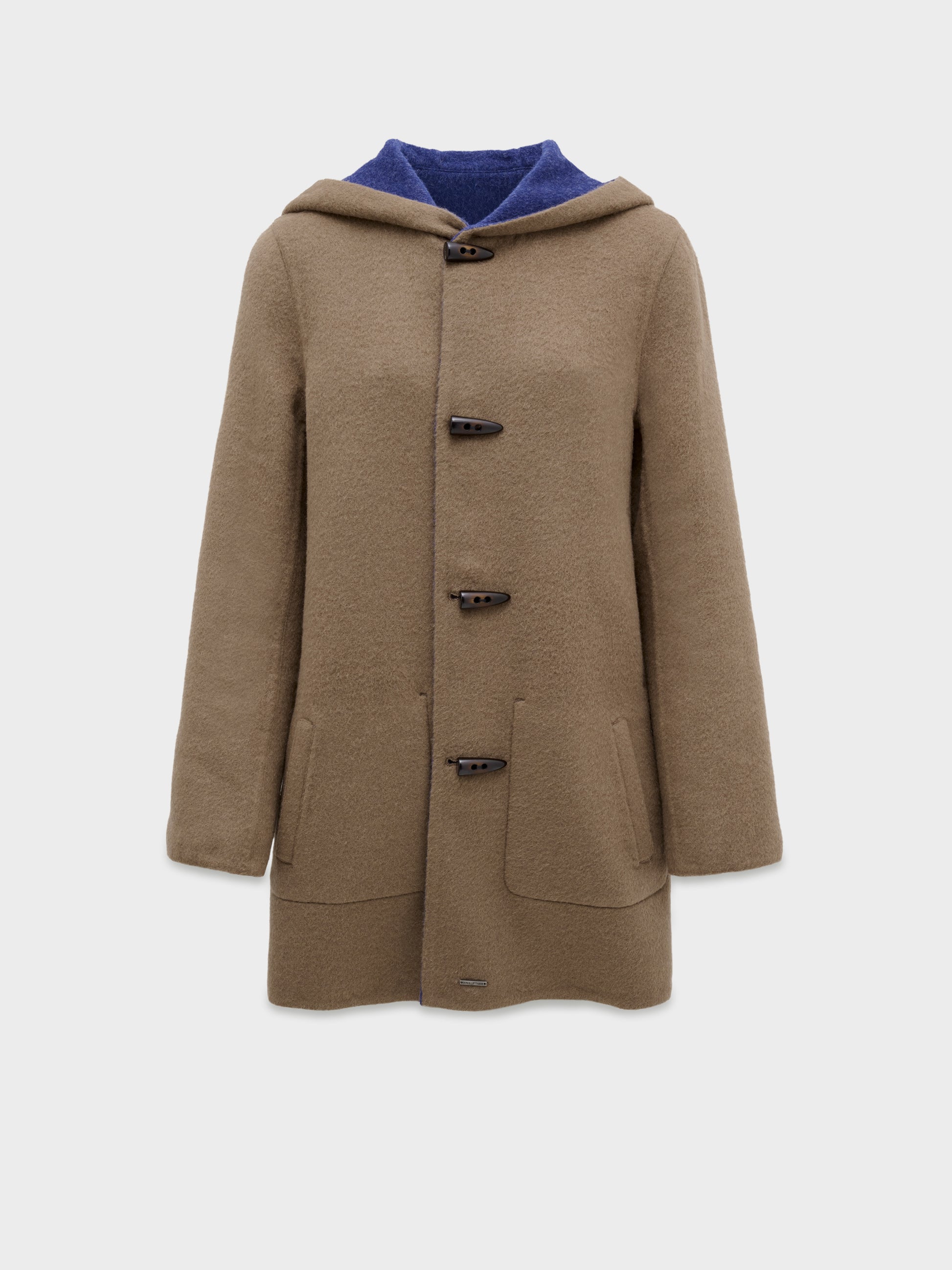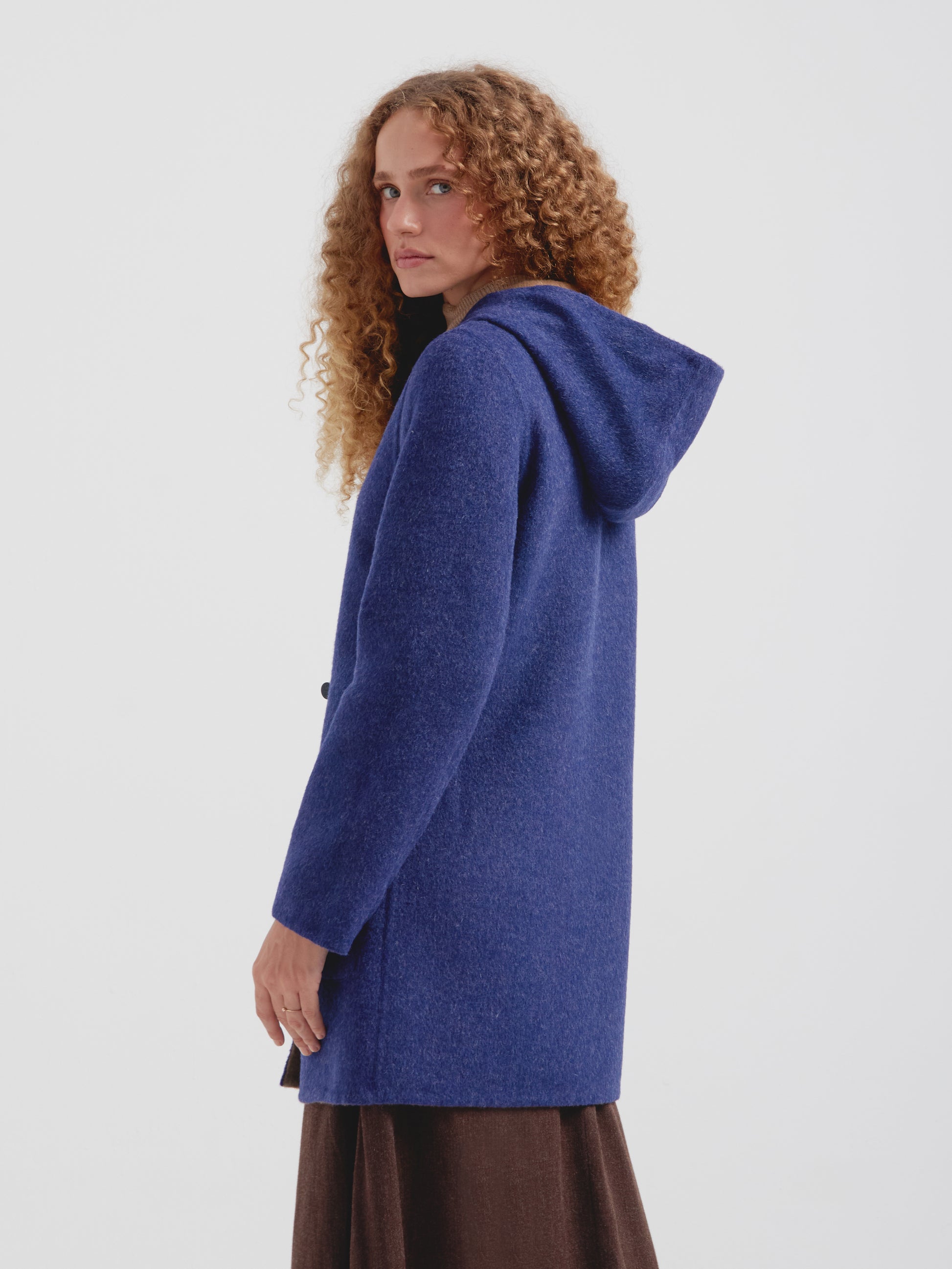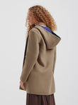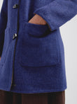 Abrigo Alaia en tonalidad azul, presenta una silueta envolvente con capucha, botones de poliester tipo cacho y bolsillos de parche frontales. Su diseño reversible lo hace versátil. Confeccionado en una mezcla de baby alpaca y lana. | Material predominante: Baby Alpaca