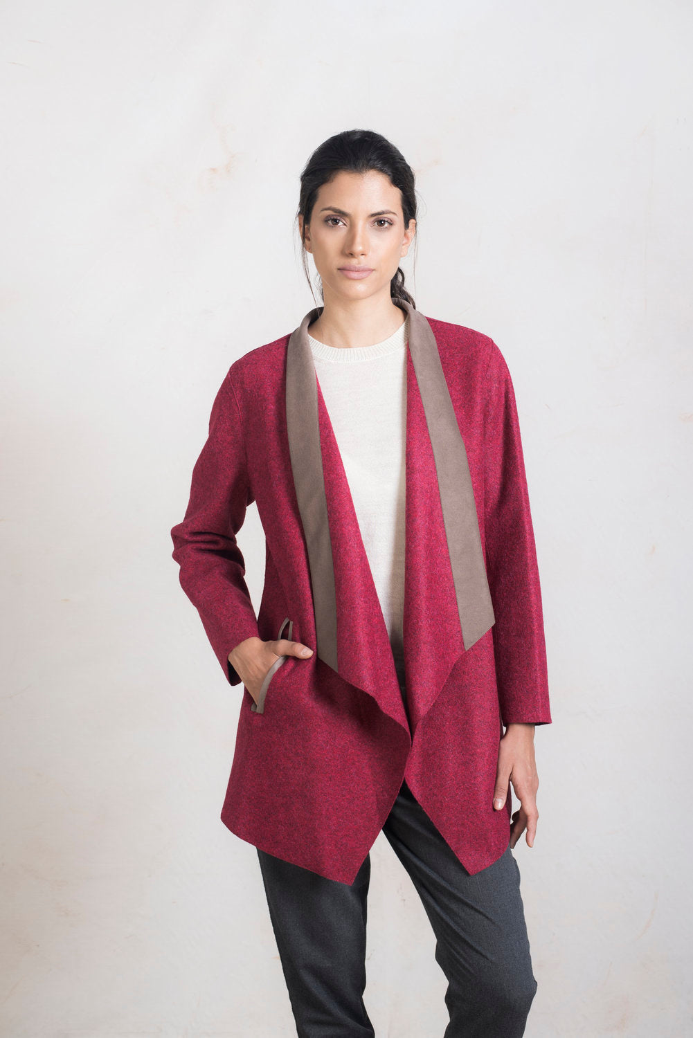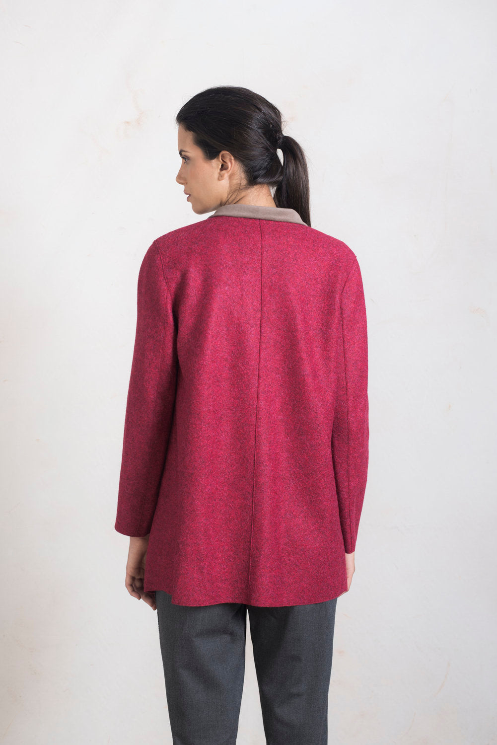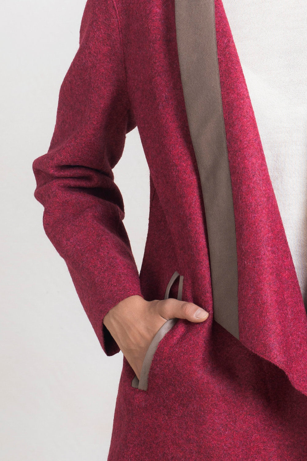 Nuestra tela felted se ha convertido en uno de los principales distintivos de nuestras colecciones. En nuestro modelo Runaway, combinamos esta icónica tela con detalles en alcántara. Este abrigo estiliza gracias a su forma y caída, ideal para salidas casuales. | Material predominante: Alpaca & Lana