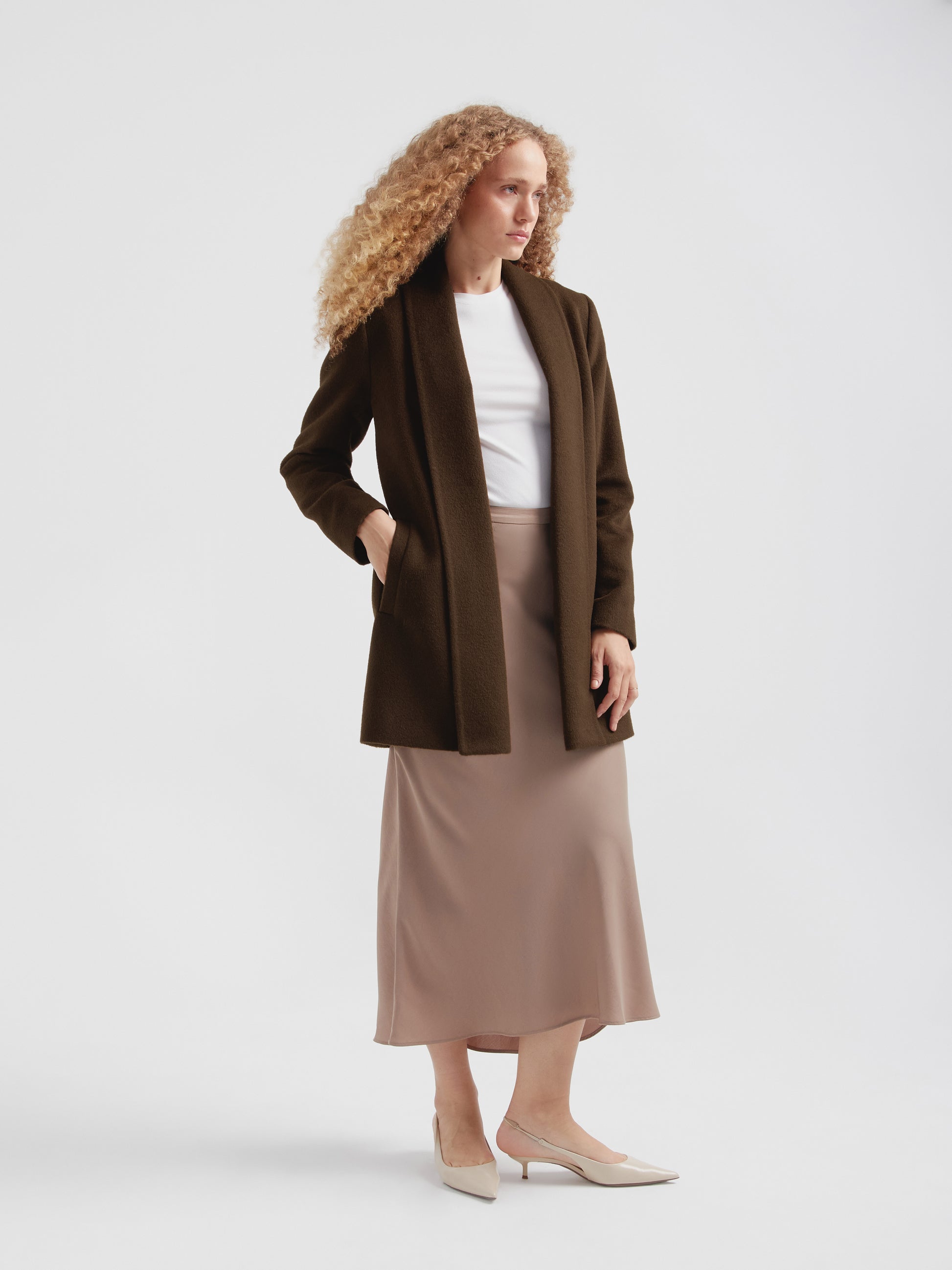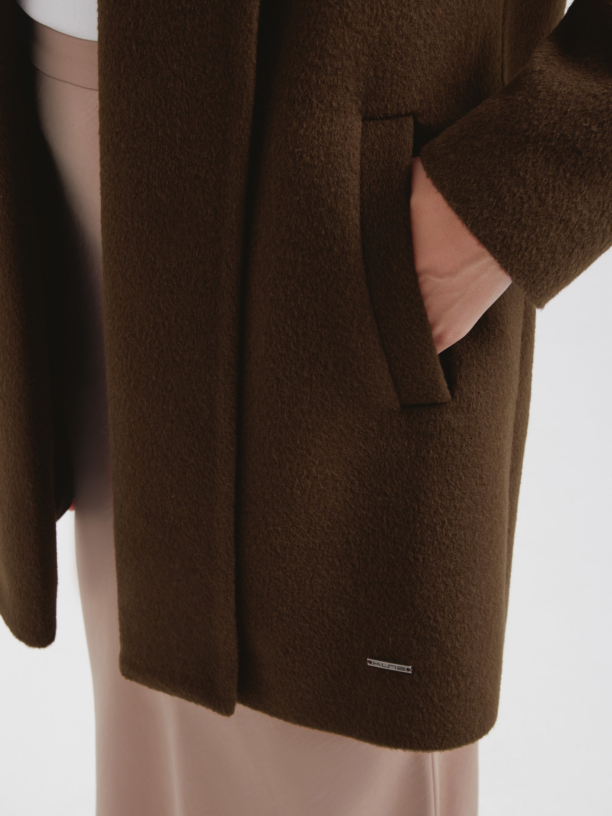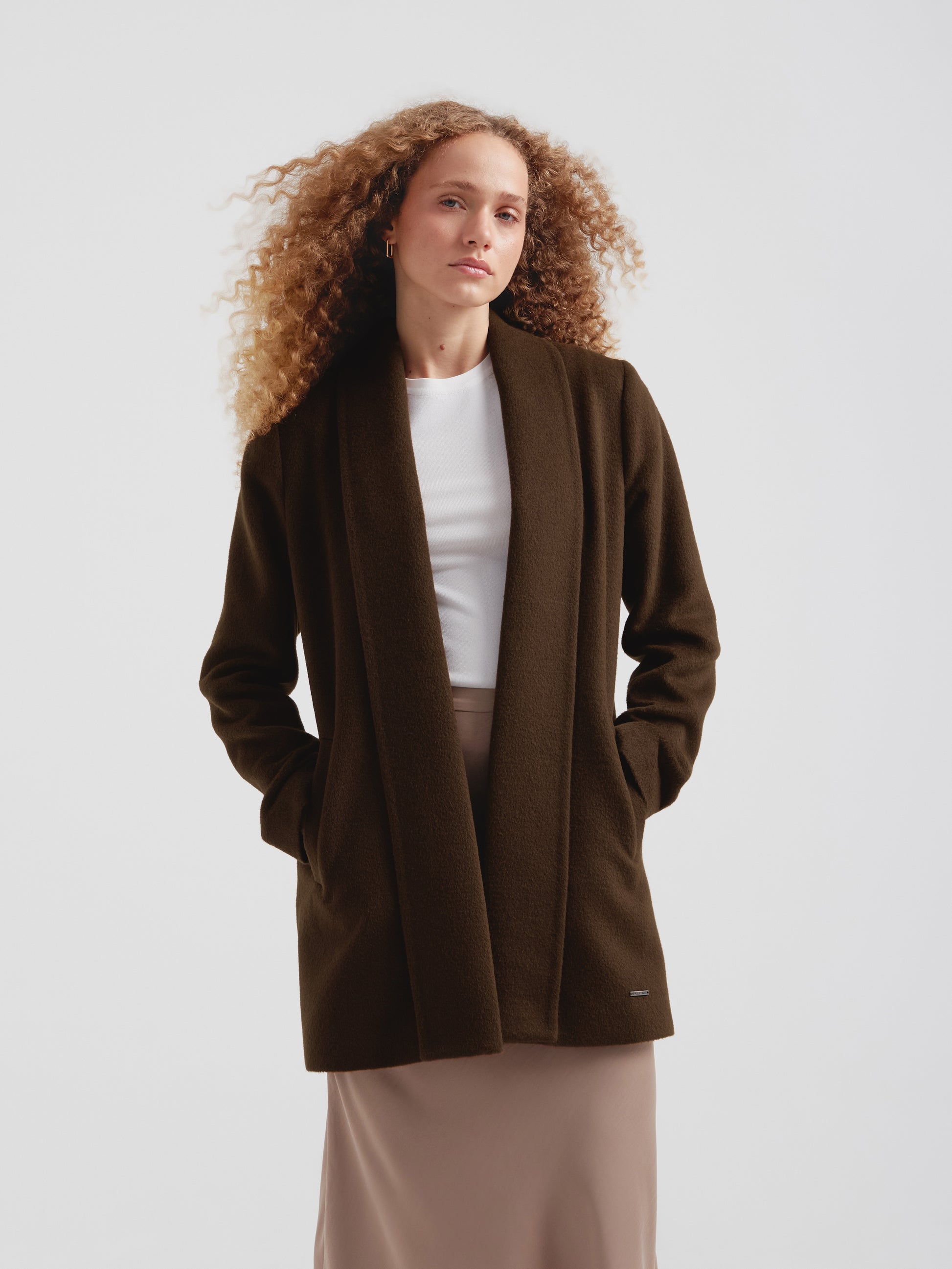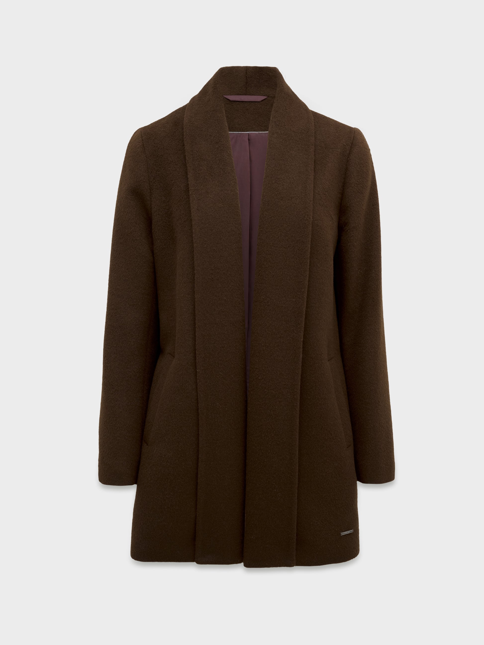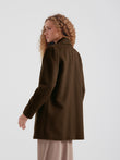 Abrigo Short Swing en tonalidad marrón, confeccionado en baby alpaca y lana. Esta pieza de mujer destaca por su corte corto y versátil de gran elegancia, ideal para toda ocasión. Presenta una estructura impecable que combina calidez y sofisticación en un formato funcional y moderno. | Material predominante: Baby Alpaca