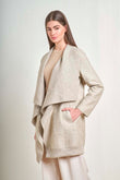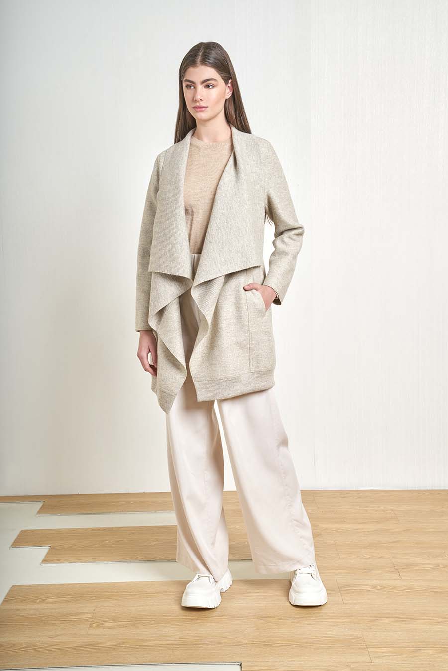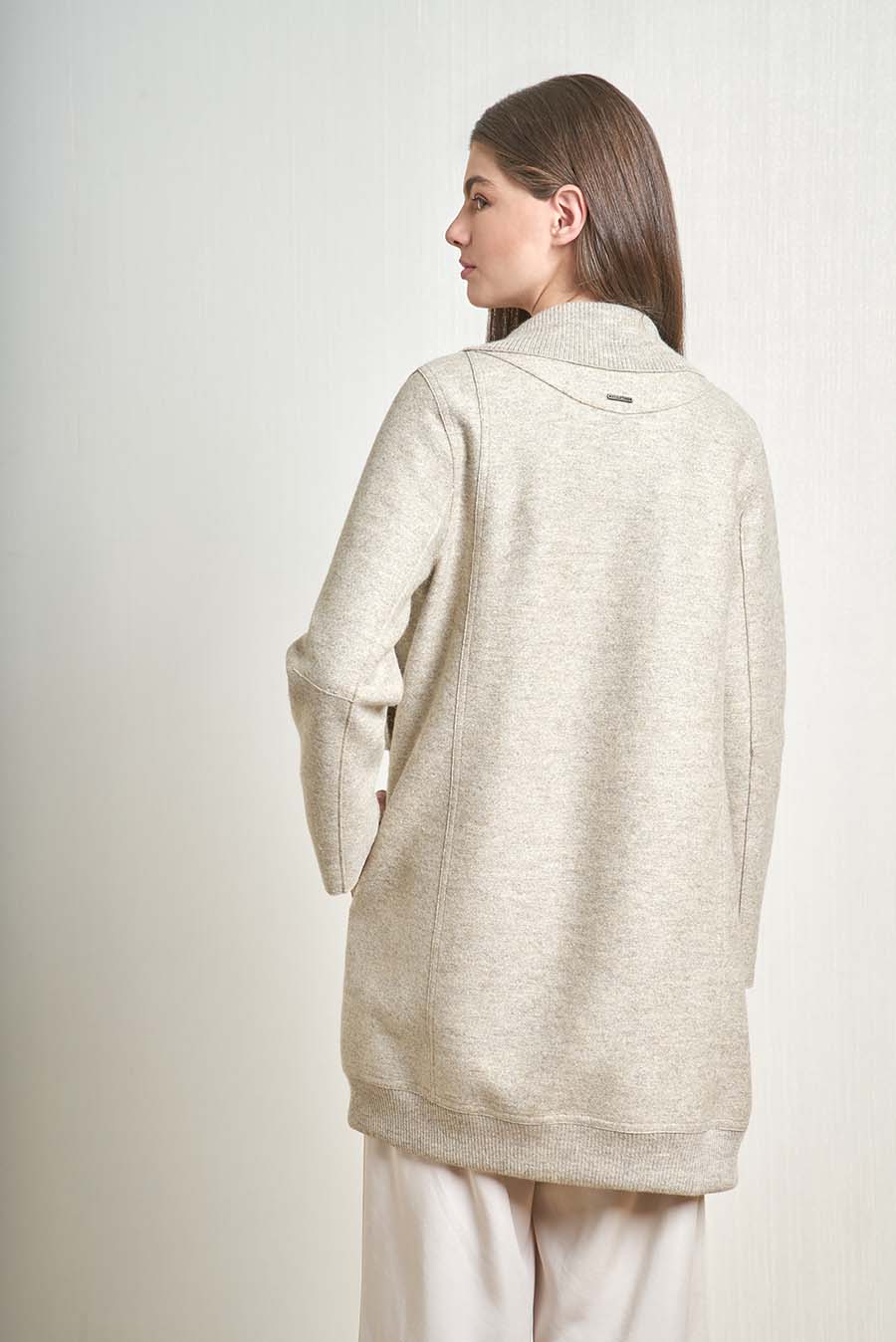 Hermosa pieza elaborada con tela felted, cuello y solapas tejidas. Tiene una atractiva caída que refleja el confort y comodidad de la prenda | Material predominante: Alpaca & Lana