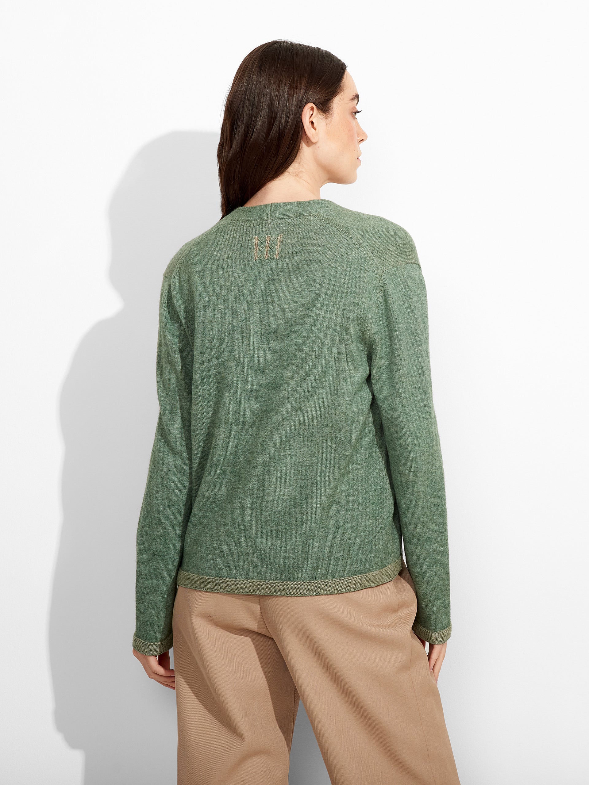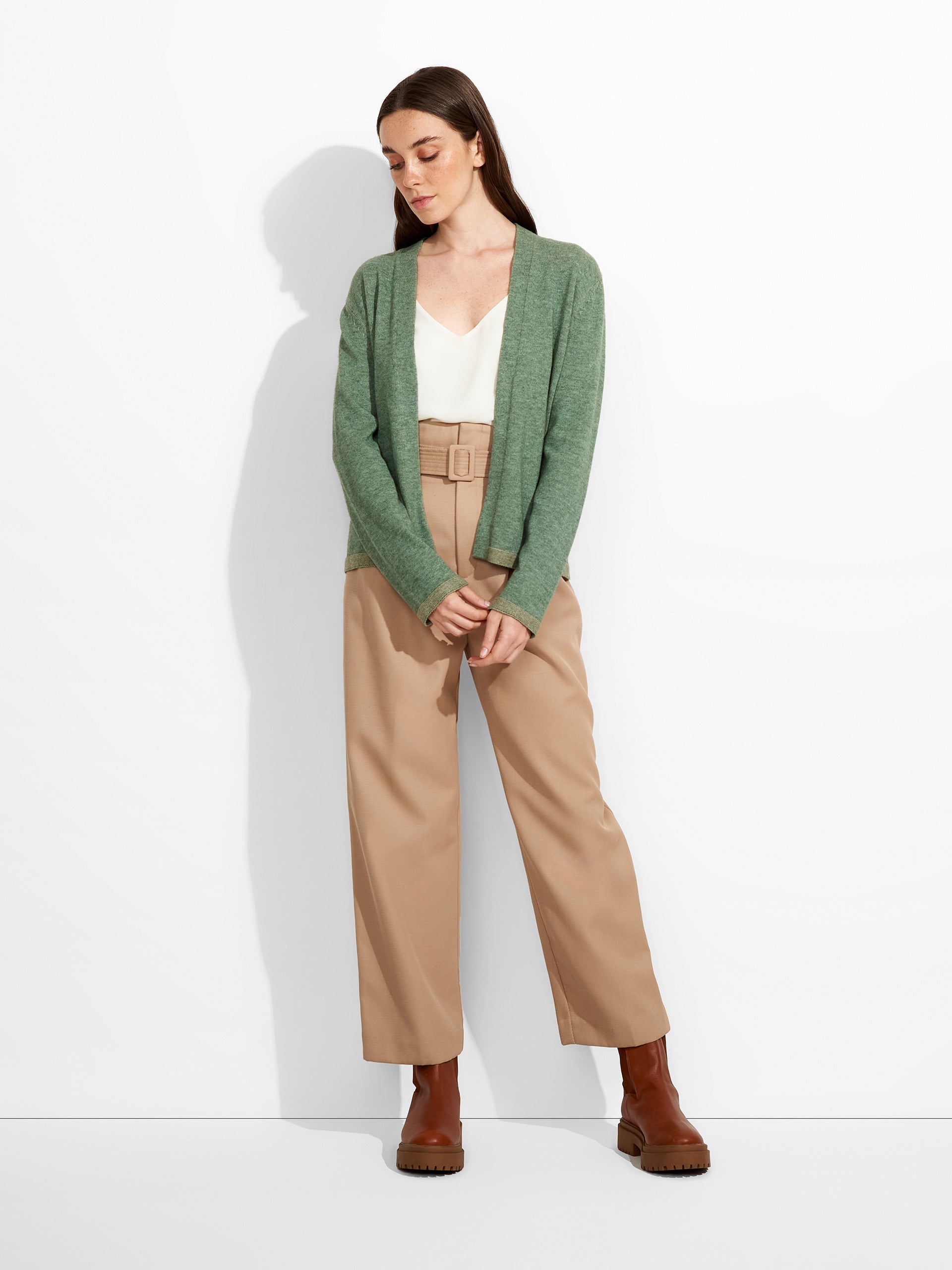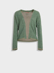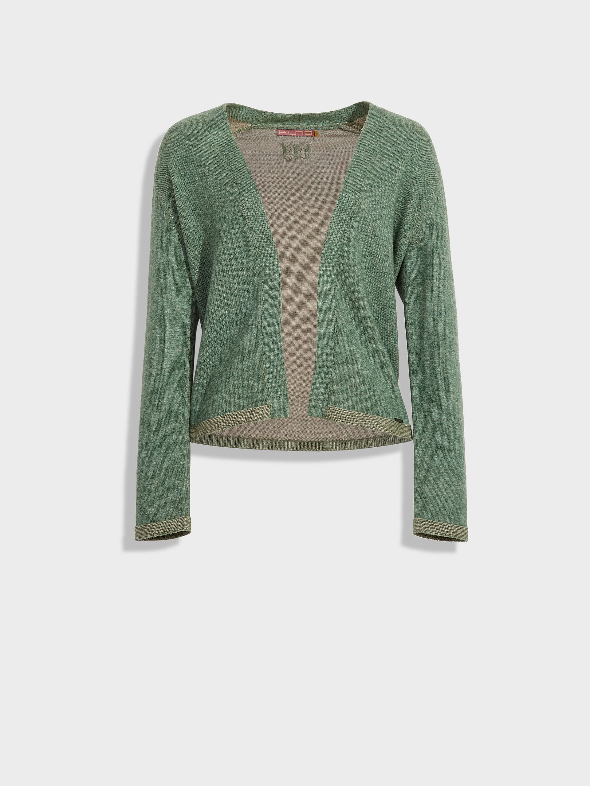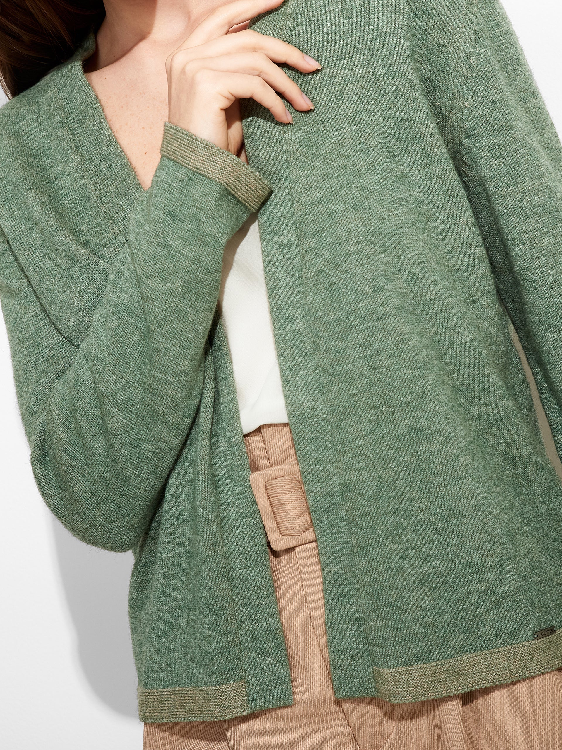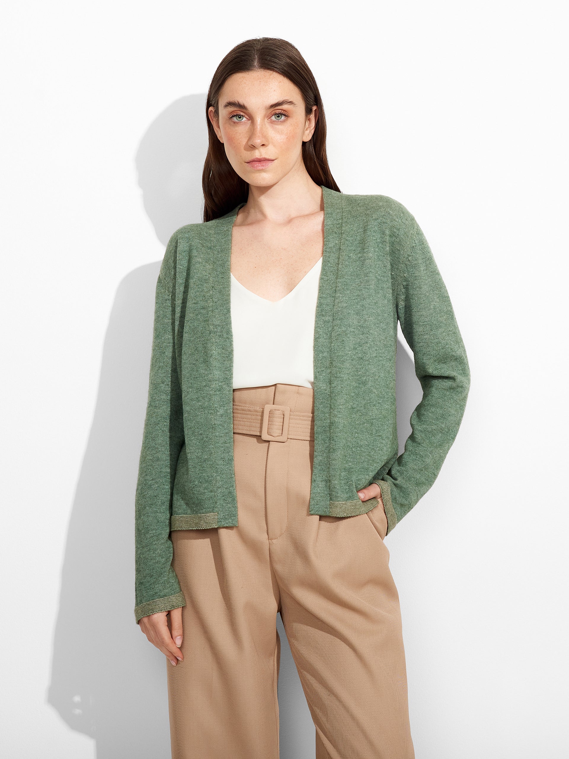 Cardigan Zoraya en tonalidad verde, de diseño abierto al frente, sin botones ni cierres. Presenta escote en V y mangas largas. Confeccionado en una mezcla de algodón y baby alpaca.