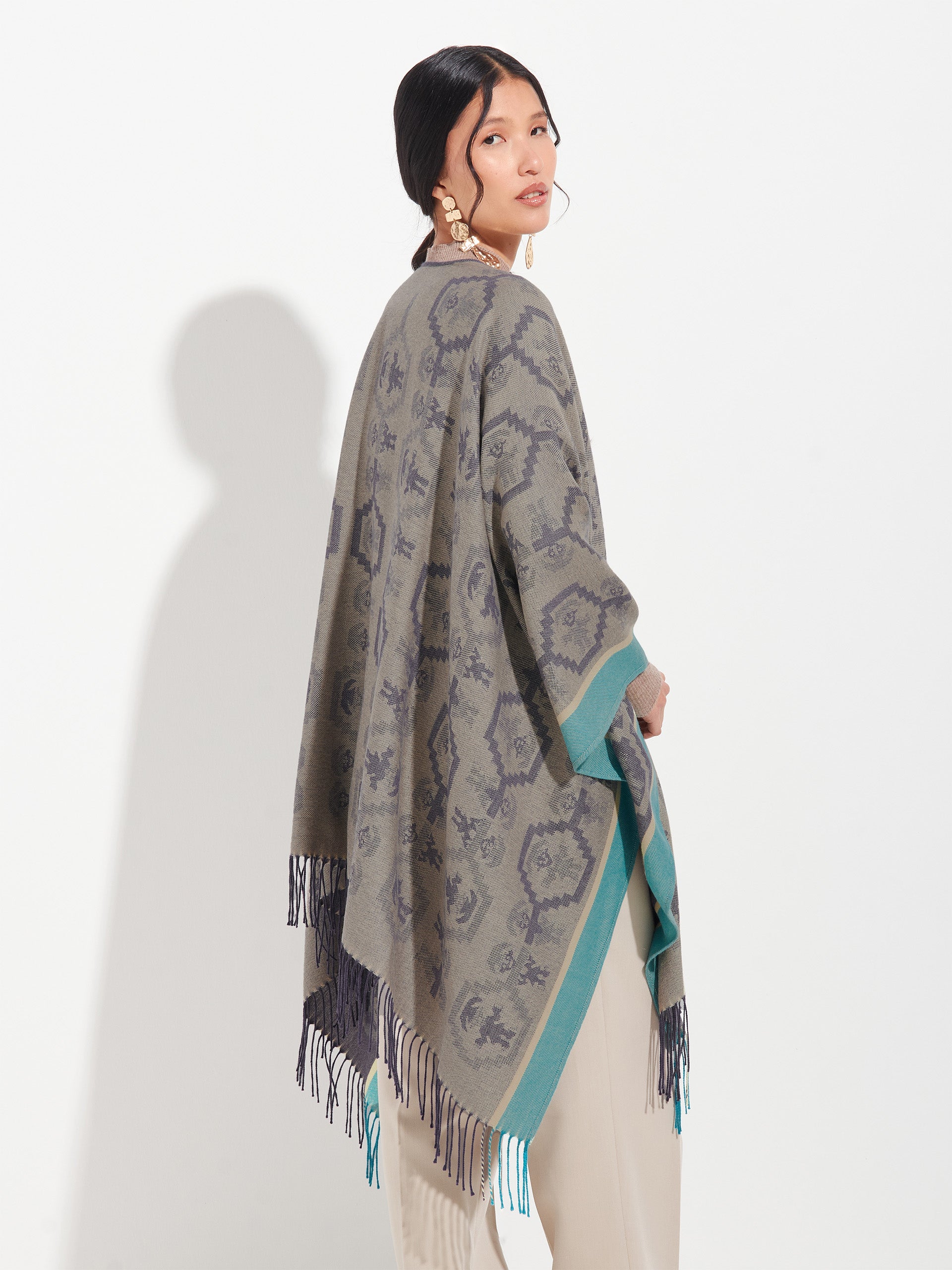 Poncho Chimu 12 en tonalidad morado, elaborado en 100% Alpaca Royal con técnica Jacquard satín (tela simple). Es una prenda reversible, inspirada en la Cultura Chimú, que refleja el valor de la tradición ancestral a través de un diseño lleno de identidad cultural. | Material predominante: Royal Alpaca