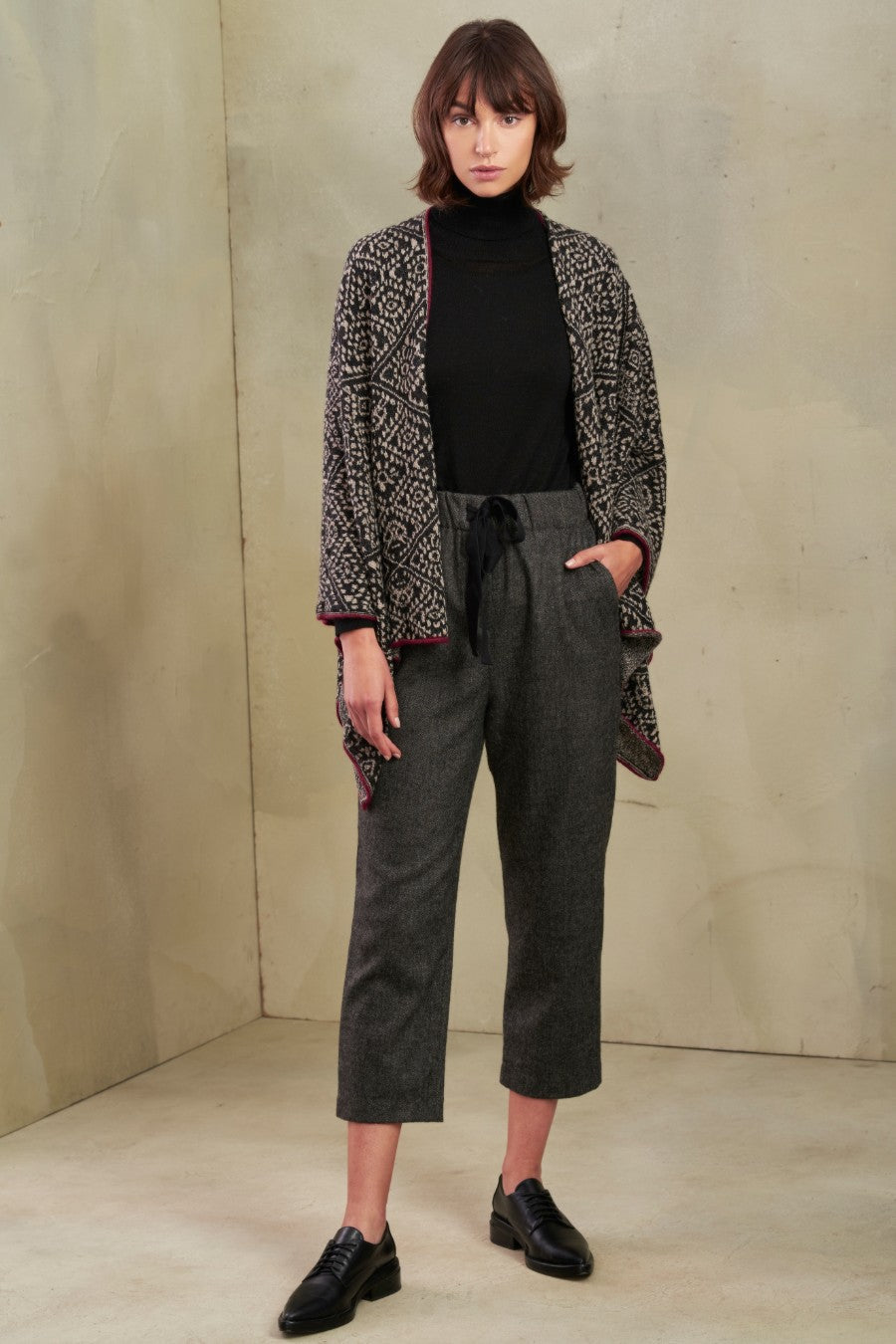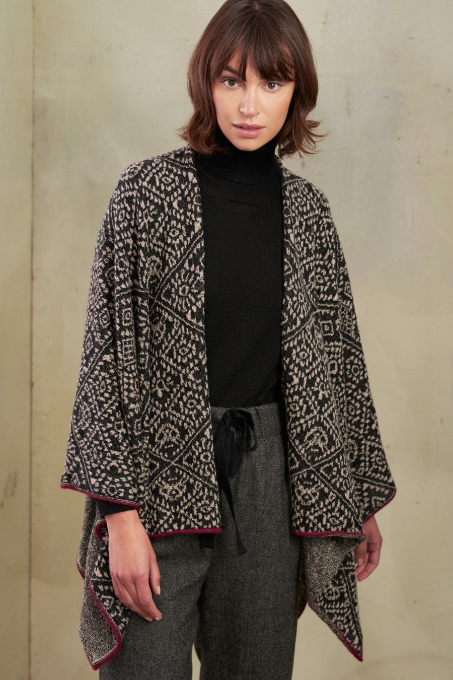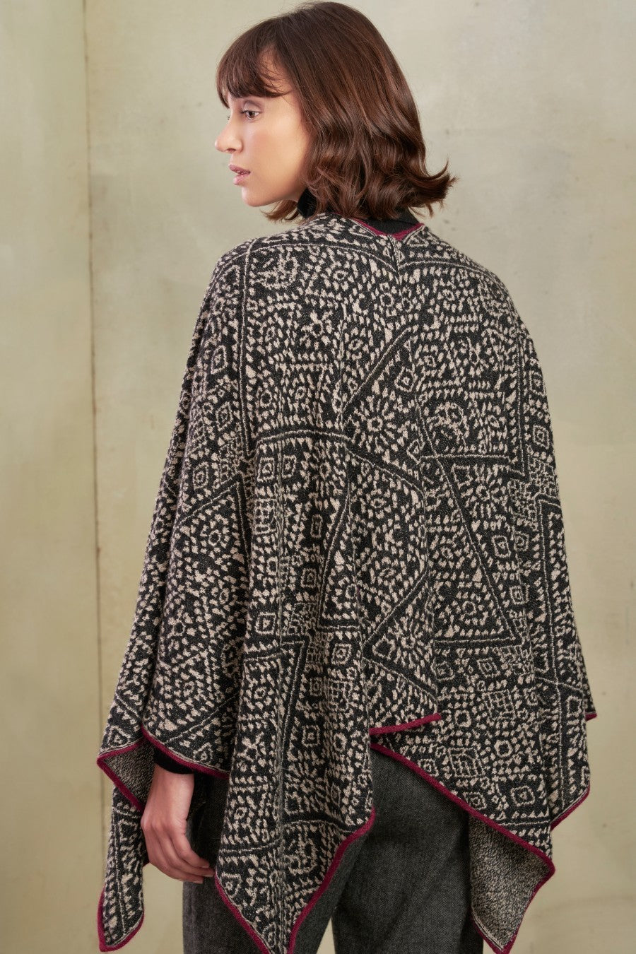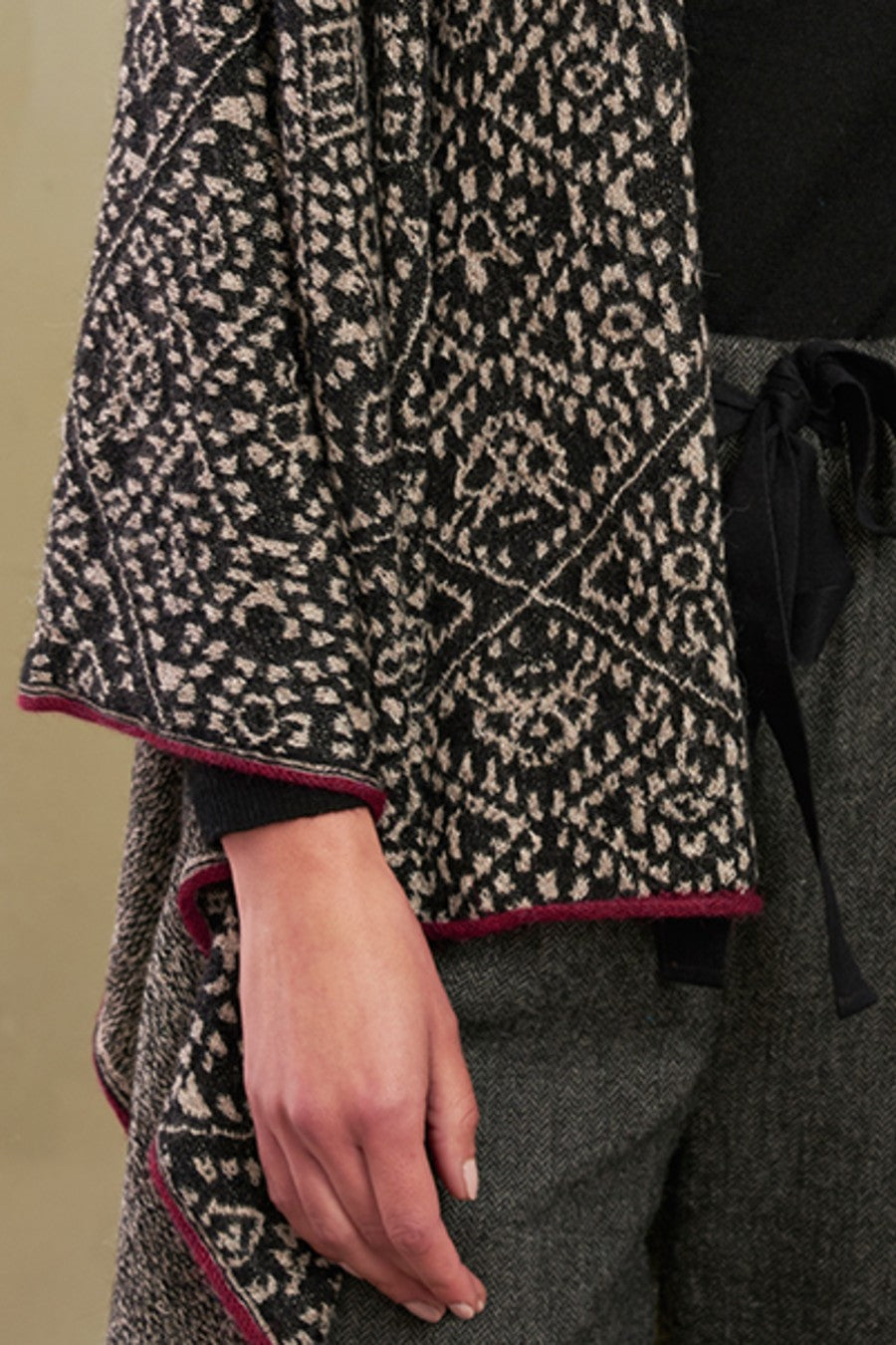 Elegante poncho de fibras de baby alpaca. Diseño étnico con bordes guindas y detalle de pompones. | Material predominante: Baby Alpaca