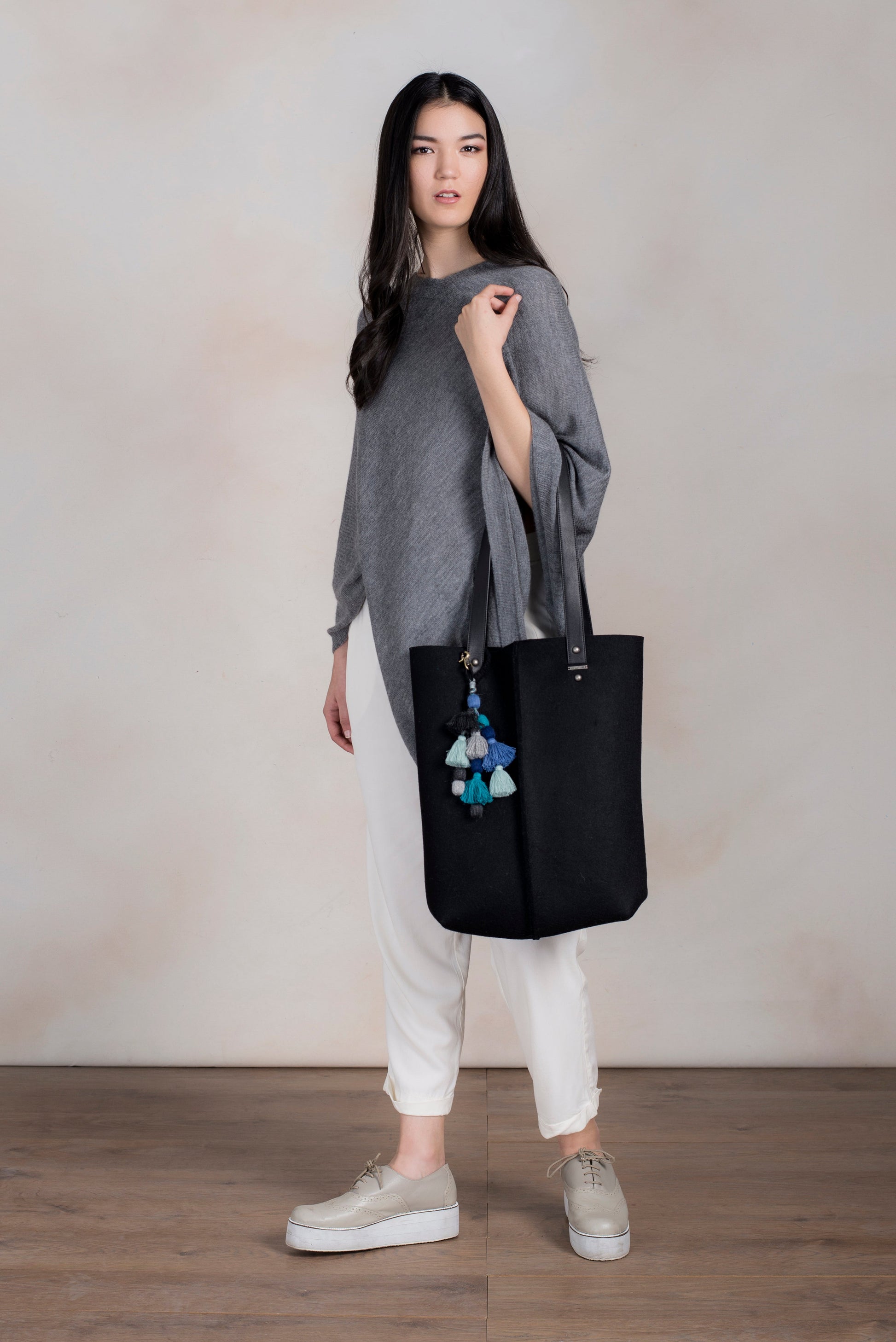 Un bolso funcional con un colorido colgante elaborado en base a hilados de baby alpaca. Esta cartera de fieltro tiene compartimientos interiores, asas de cuero y broche metálico para guardar cosas con total comodidad. Resalta tus looks favoritos con este atractivo accesorio. | Material predominante: Alpaca & Lana