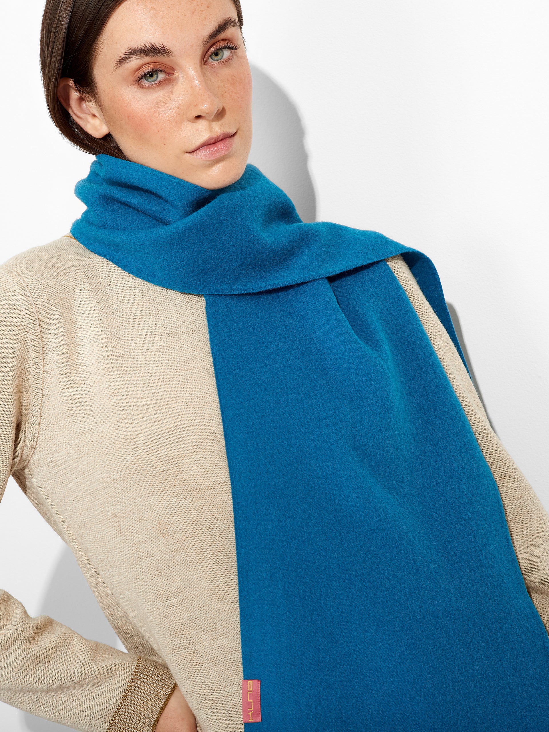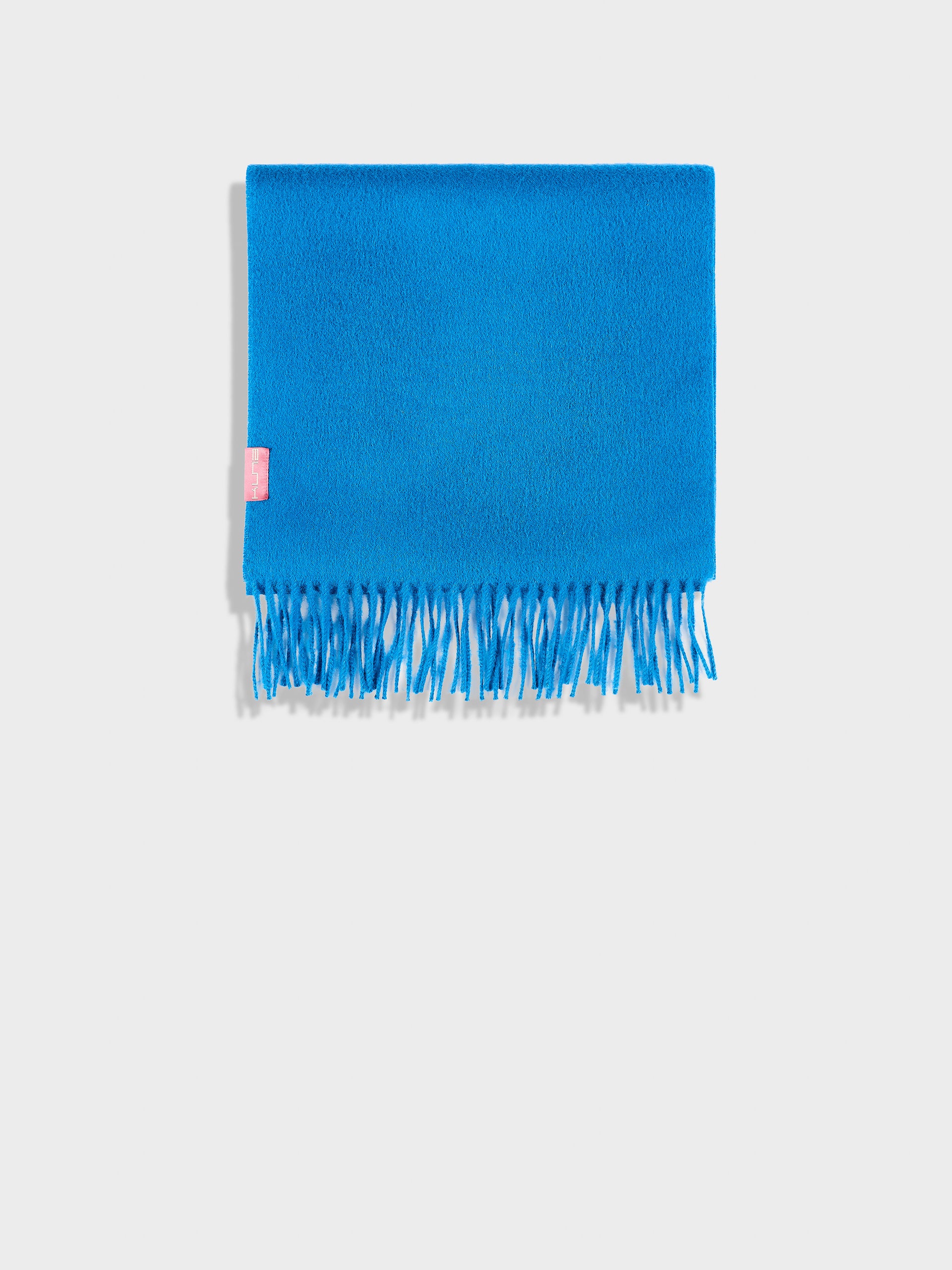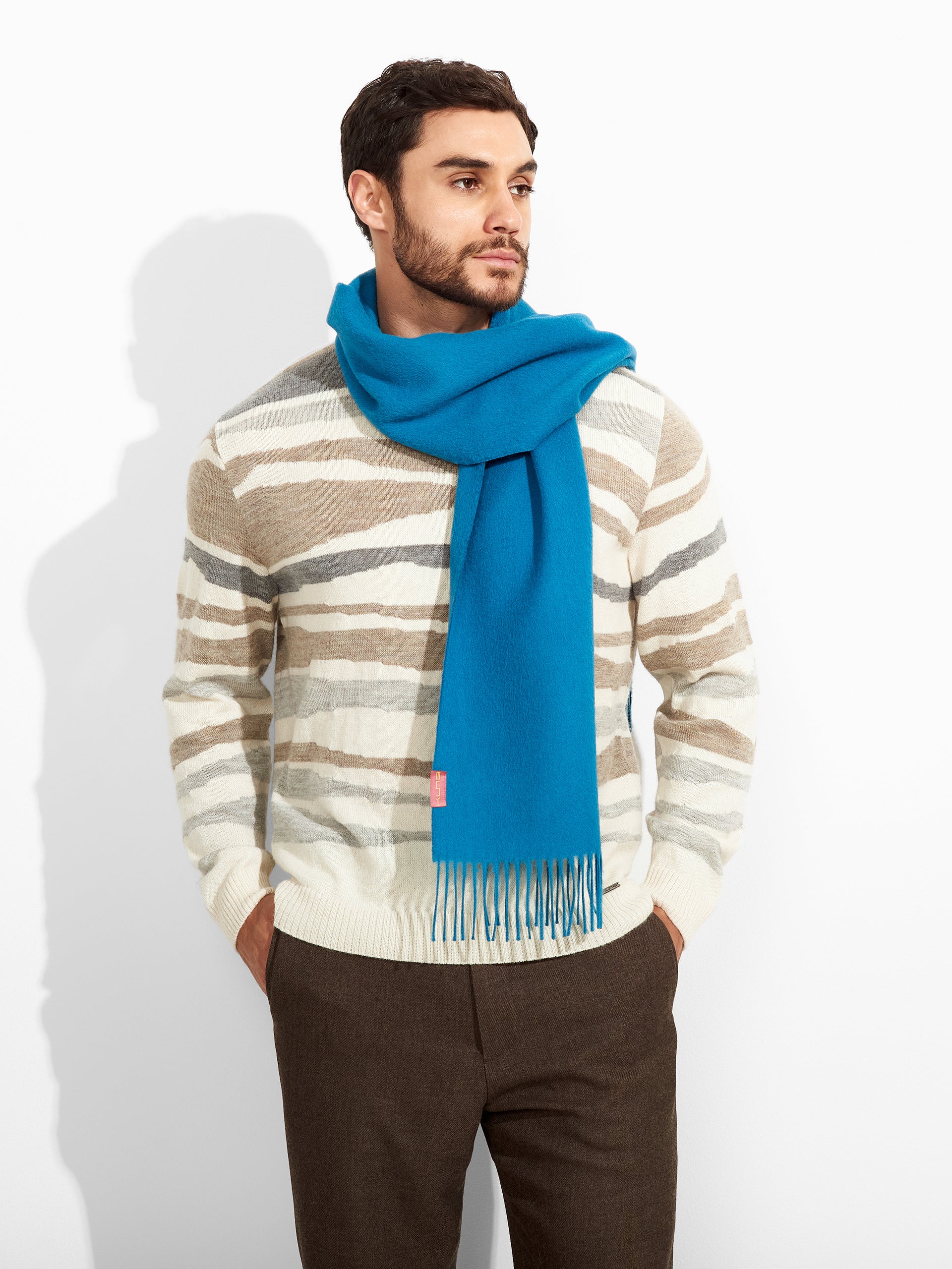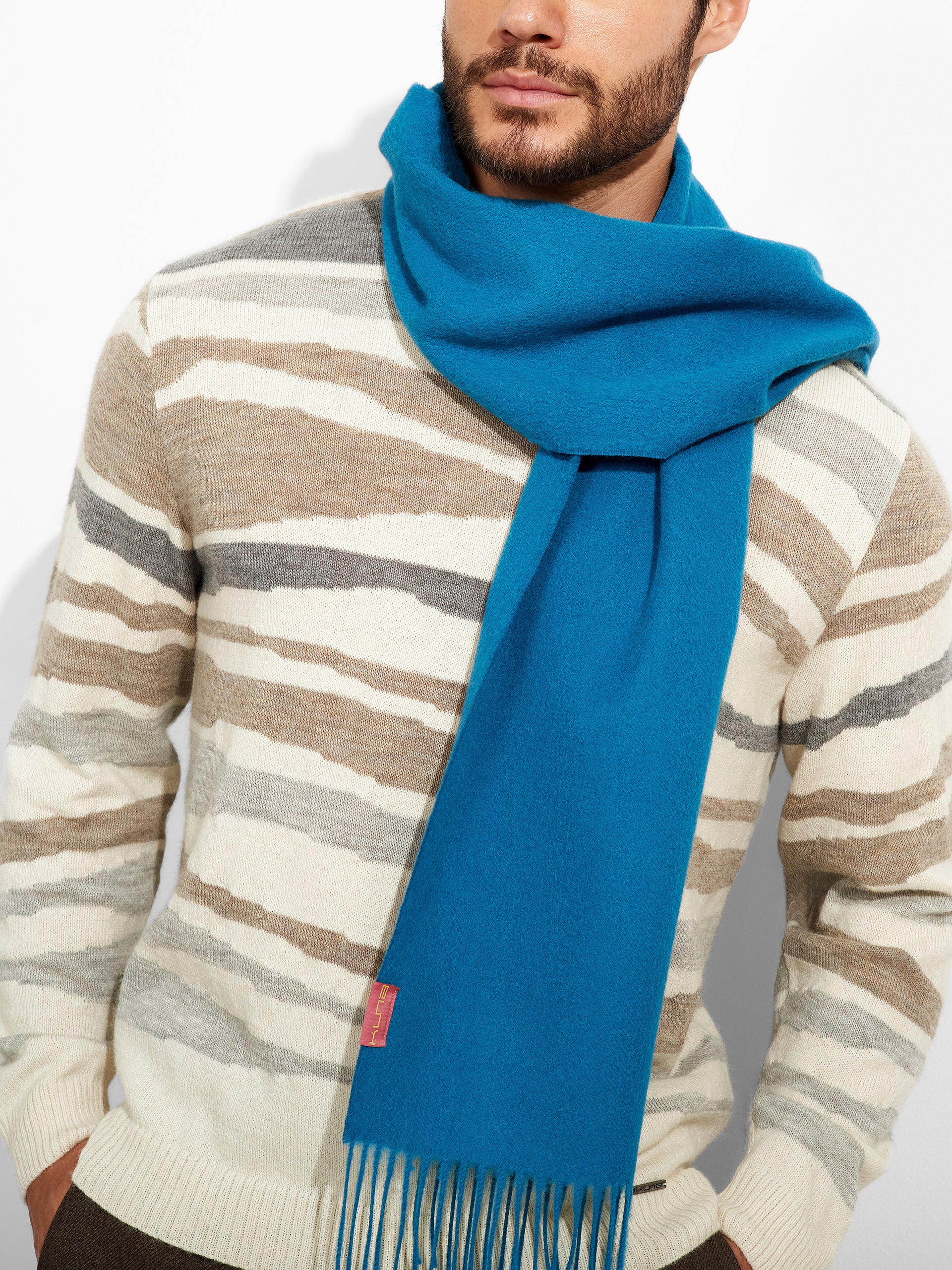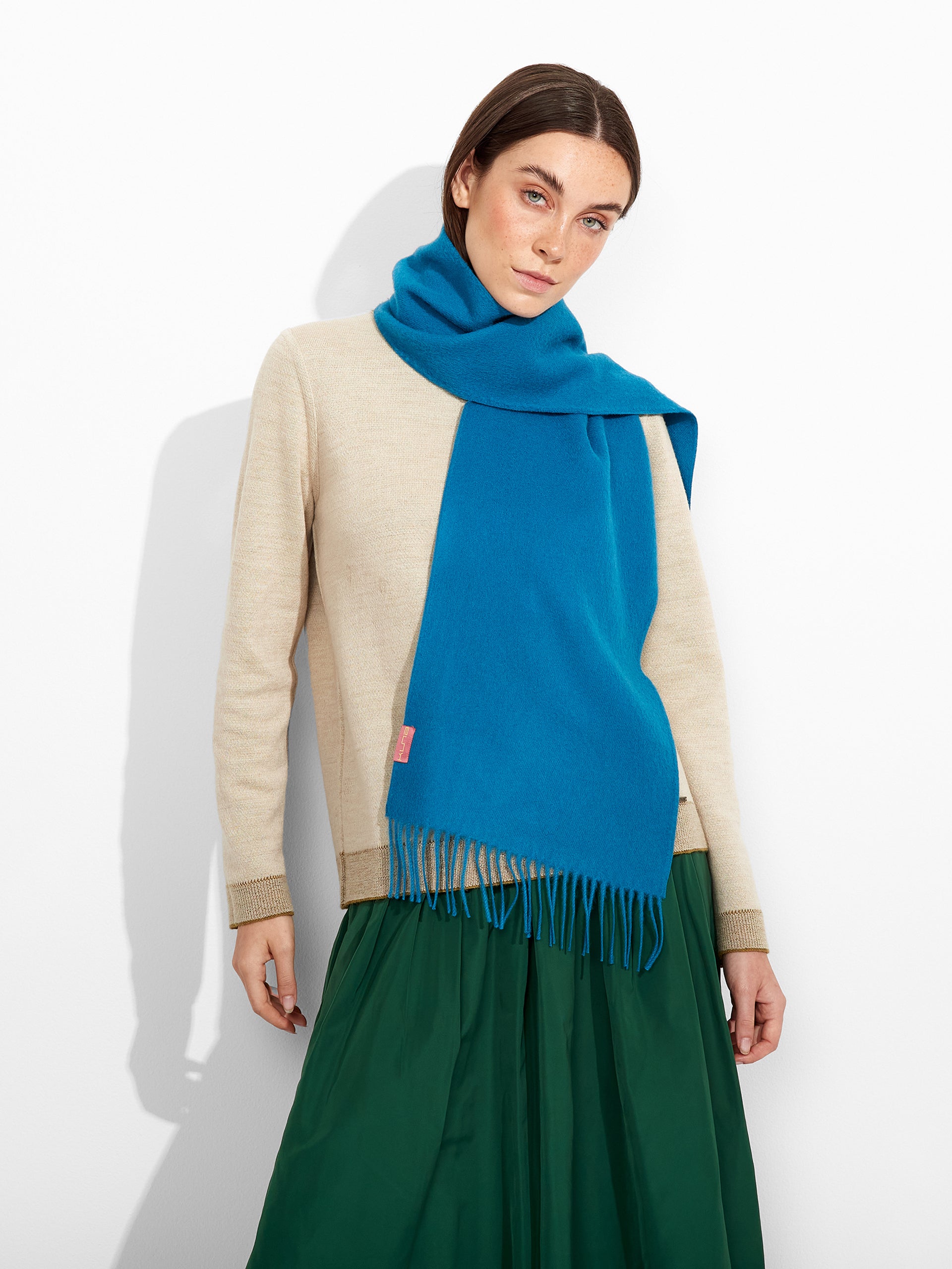 Chalina Adrian en tonalidad turquesa, de diseño de color entero con bordes terminados en flecos gruesos. Confeccionada en baby alpaca, brinda calidez y suavidad. | Material predominante: Baby Alpaca
