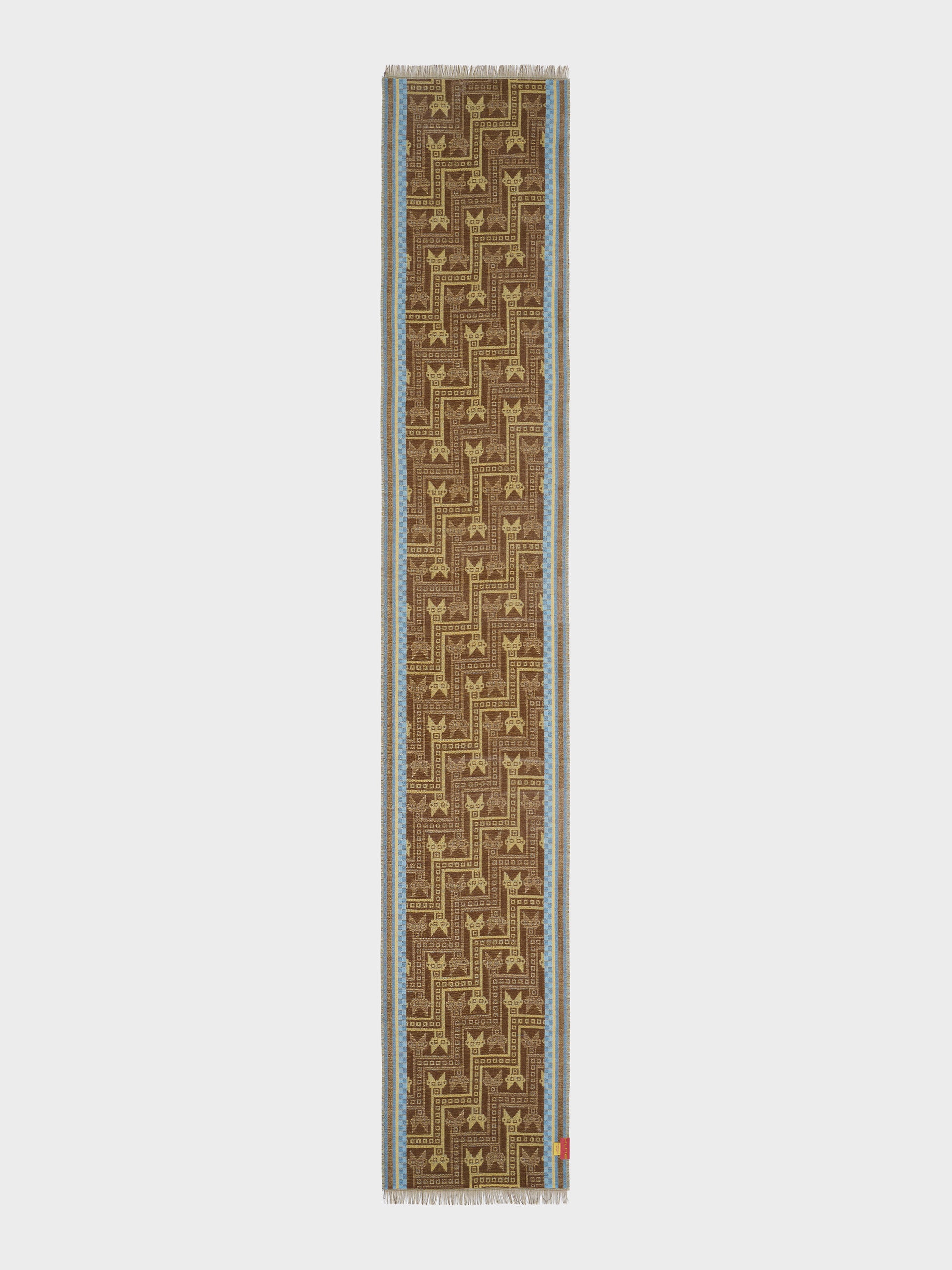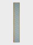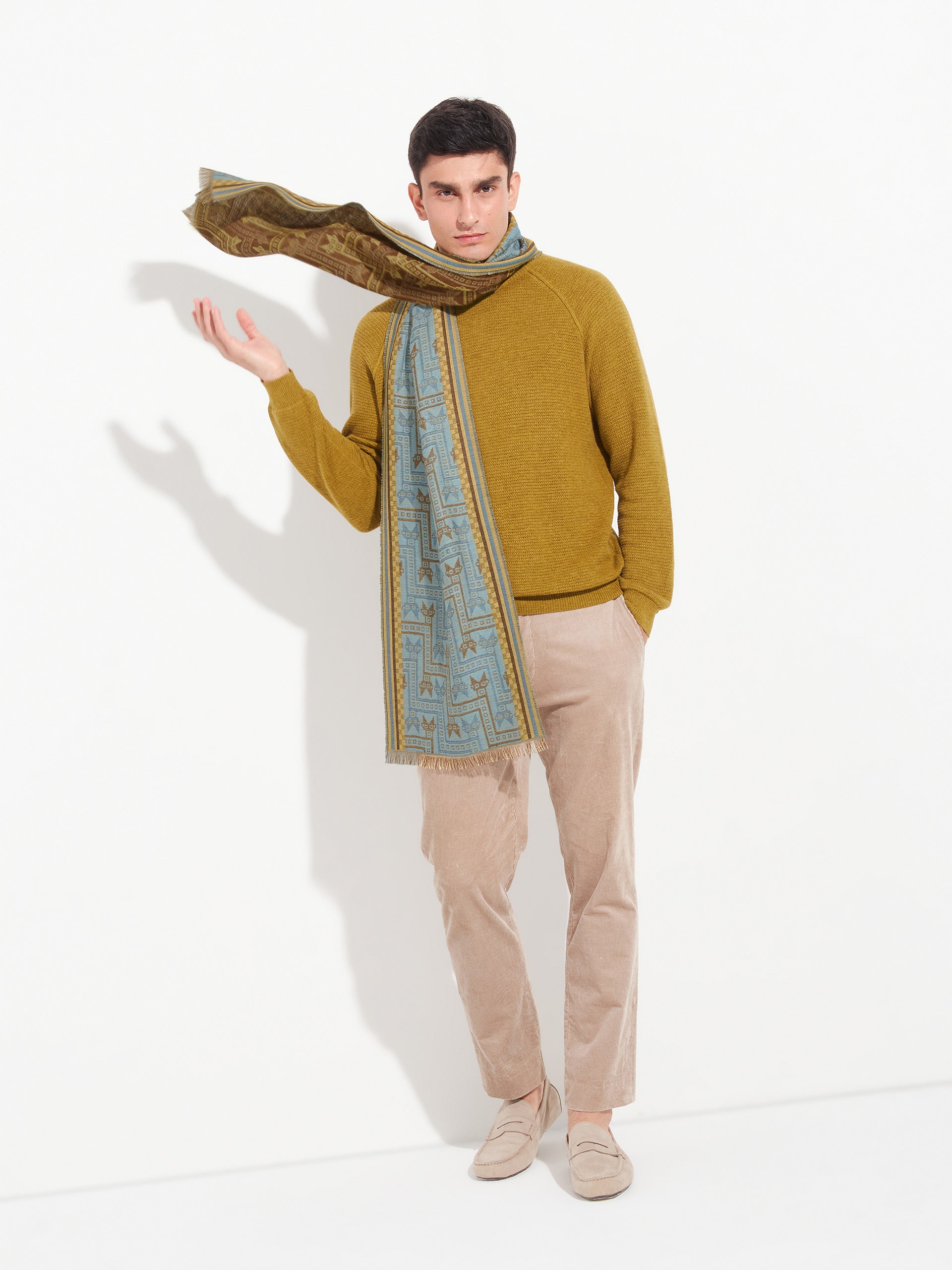 Chalina Chancay 39 en tonalidad amarillo, elaborada en 70% baby alpaca y 30% seda, con técnica Jacquard en doble tela e inserción de trama oculta. Con una medida de 180/176 x 30 cm, es un accesorio unisex y reversible, inspirado en la Cultura Chancay, que evoca la riqueza de las tradiciones antiguas a través de un diseño con identidad cultural. | Material predominante: Baby Alpaca