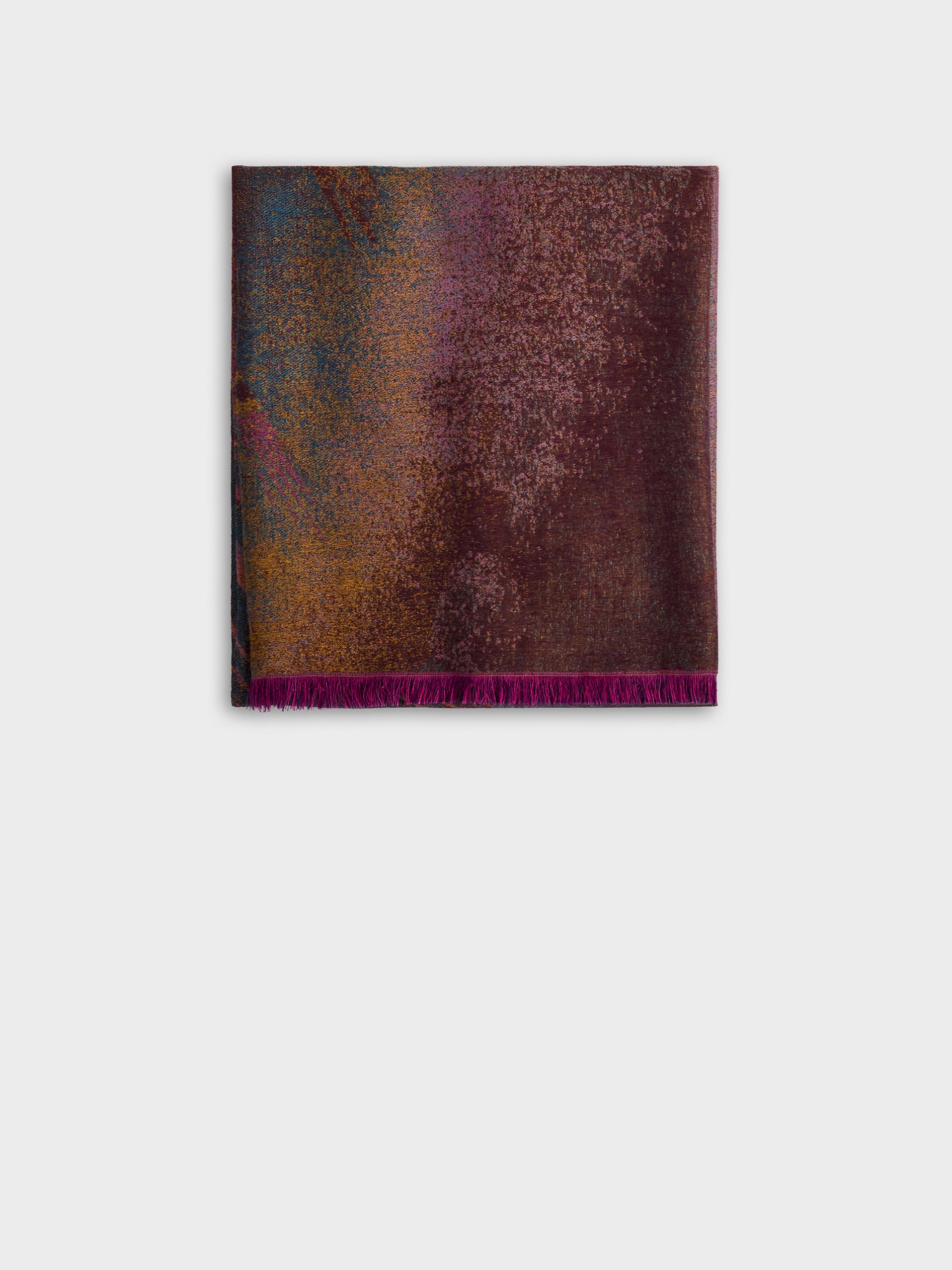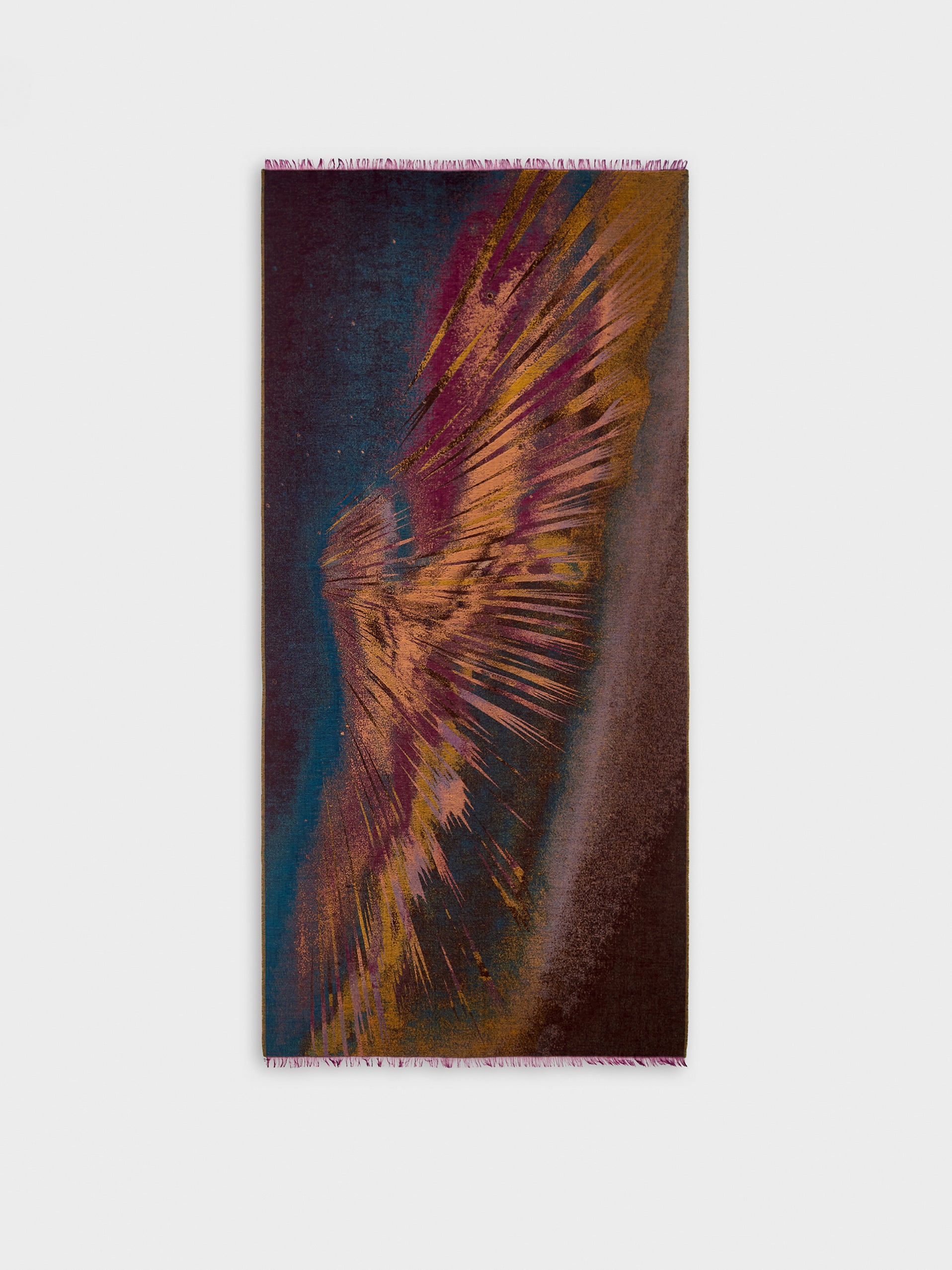 Espléndido espectáculo natural que ocurre en el nórdico país europeo de Finlandia. Las Auroras Boreales despliegan, con inconmensurable intensidad, la grandiosidad del cosmos. La profundidad de los colores que, al compás de la naturaleza y la atmósfera danzan al viento, proyectan subminales matices, gracias a sutiles movimientos. | Material predominante: Royal Alpaca y Seda