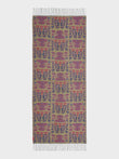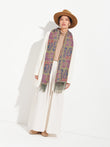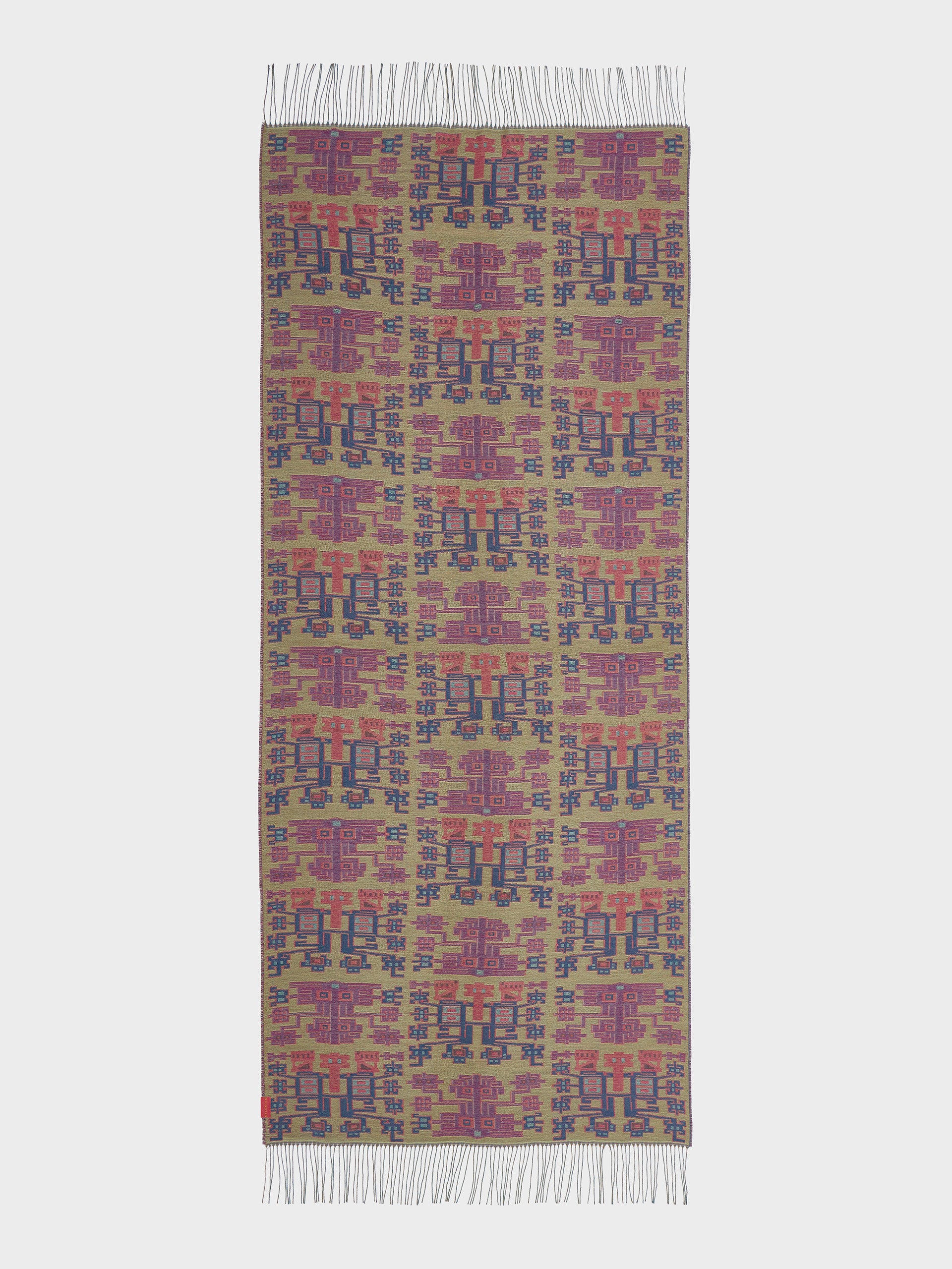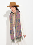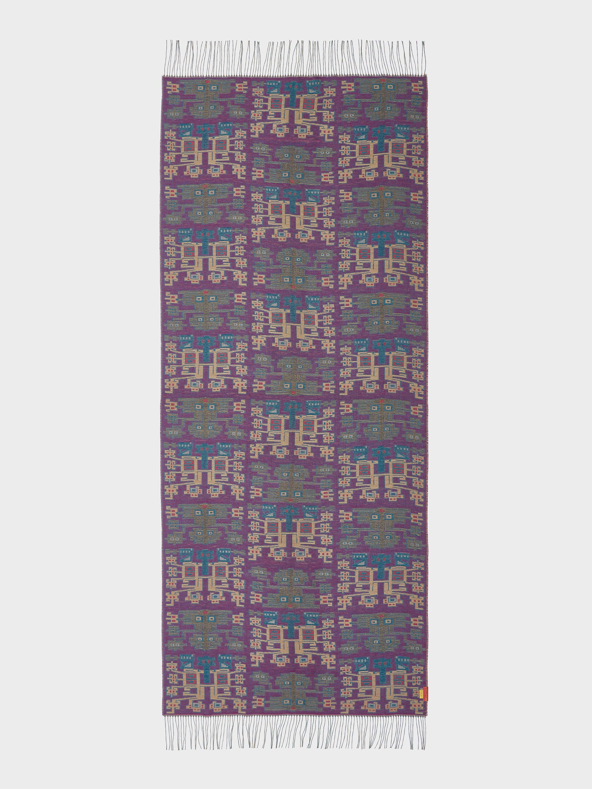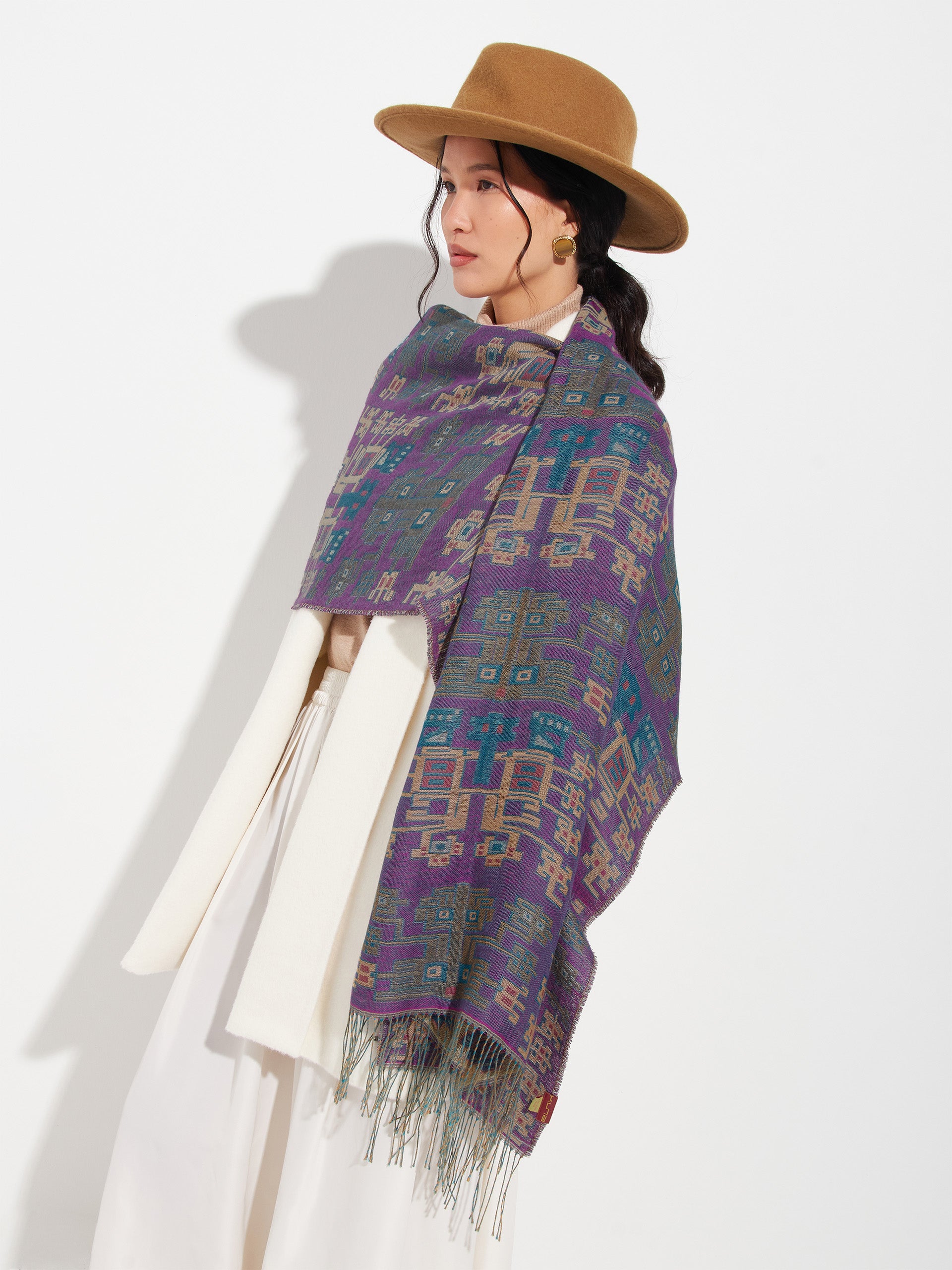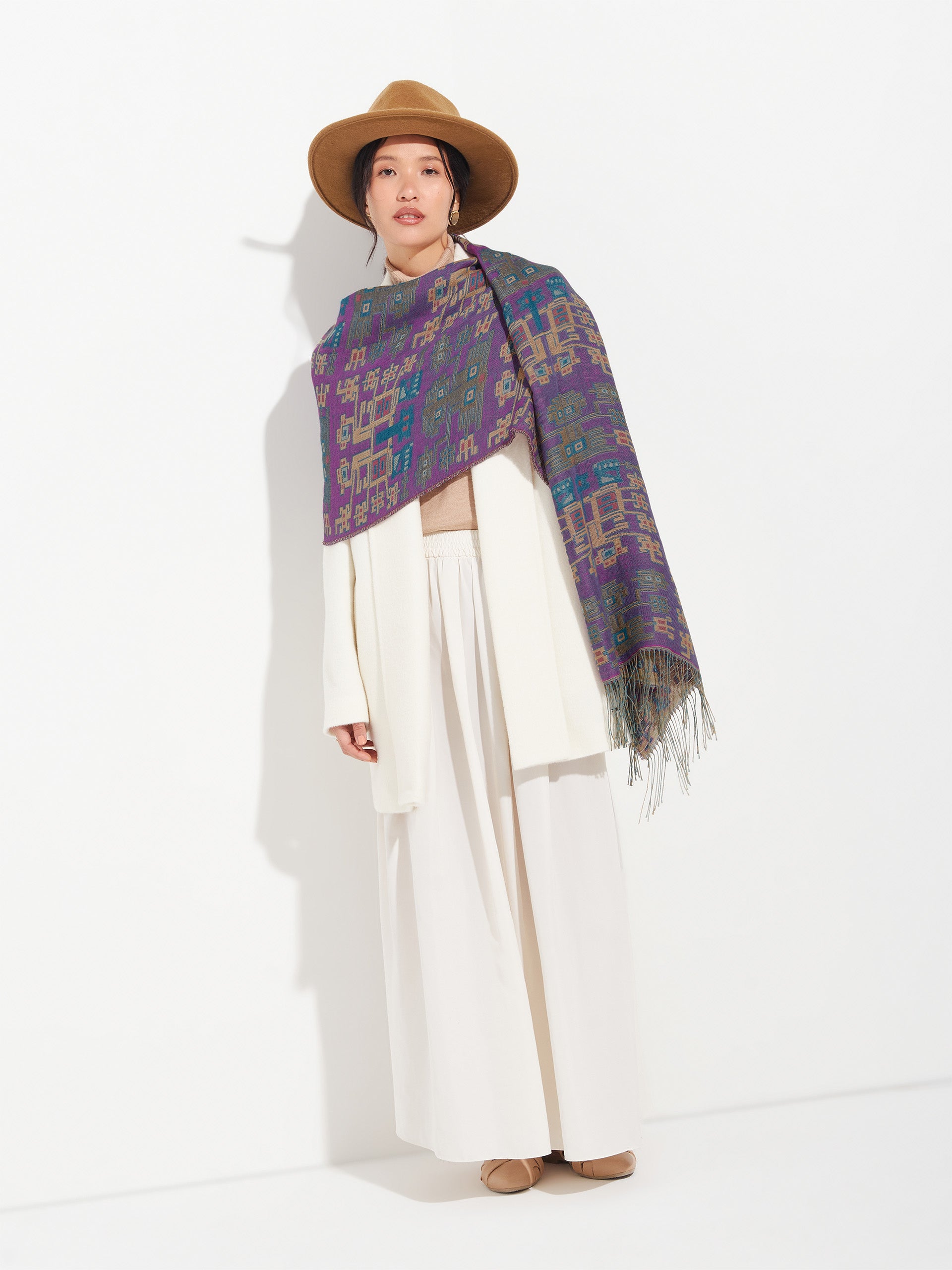 Estola Nazca 52 en tonalidad morado, elaborada en 70% baby alpaca y 30% seda, con técnica Jacquard en doble tela e inserción de trama oculta. Con una medida de 200/180 x 75 cm, es una prenda reversible, inspirada en la Cultura Nazca, que reinterpreta el legado ancestral en un diseño inspirado en la cultura originaria. | Material predominante: Baby Alpaca