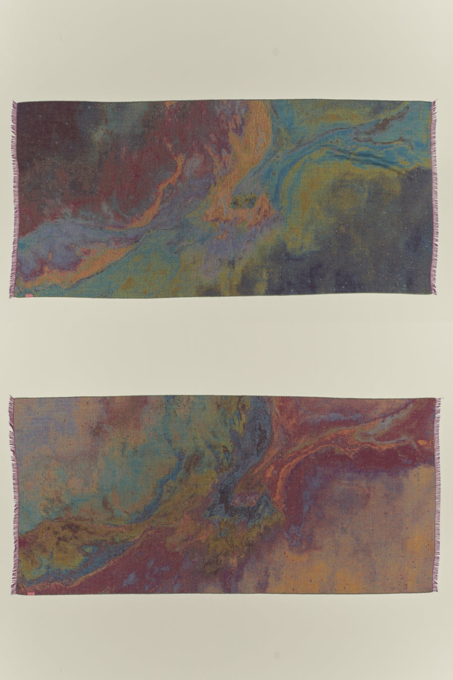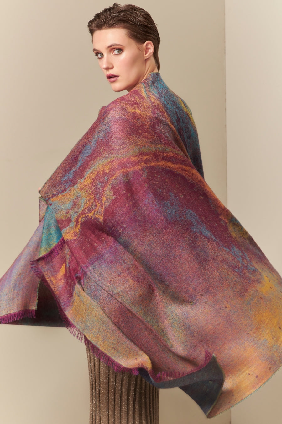 La sutil aplicación de moderna tecnología textil, combinada con la íntima mezcla de las fibras de royal alpaca y seda, otorga ese indescriptible toque que enaltece el estilo de nuestra estola Nebulosa de Orión, cuyas ligeras tonalidades y formas acentúan el efecto ondulado, reflejando un fenómeno cósmico, en cuya gama cromática destaca un hermoso azul brillante.