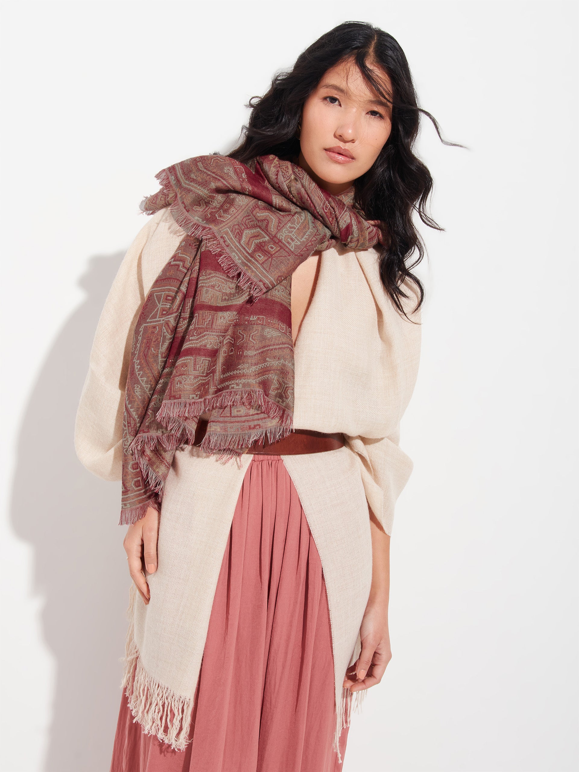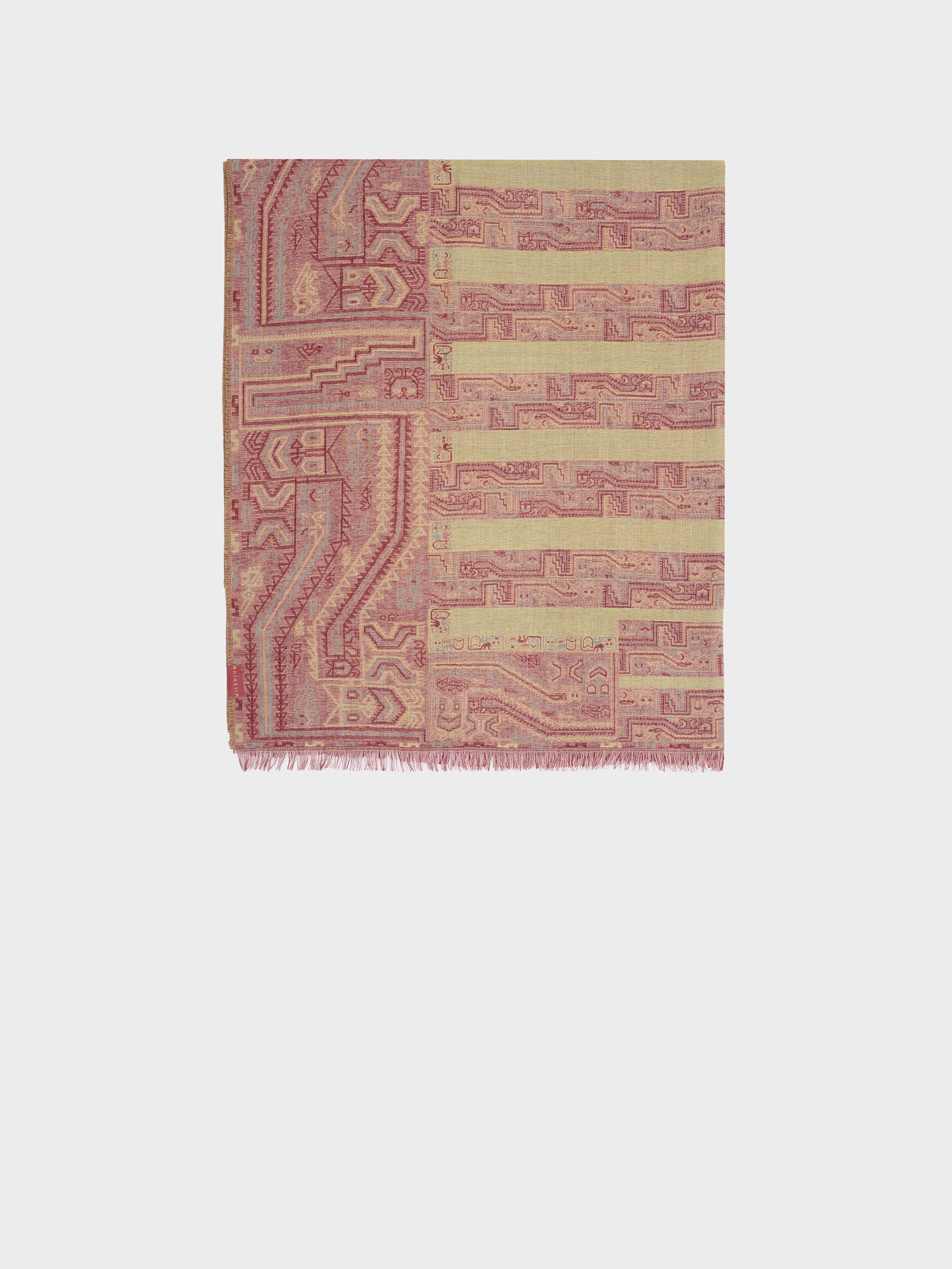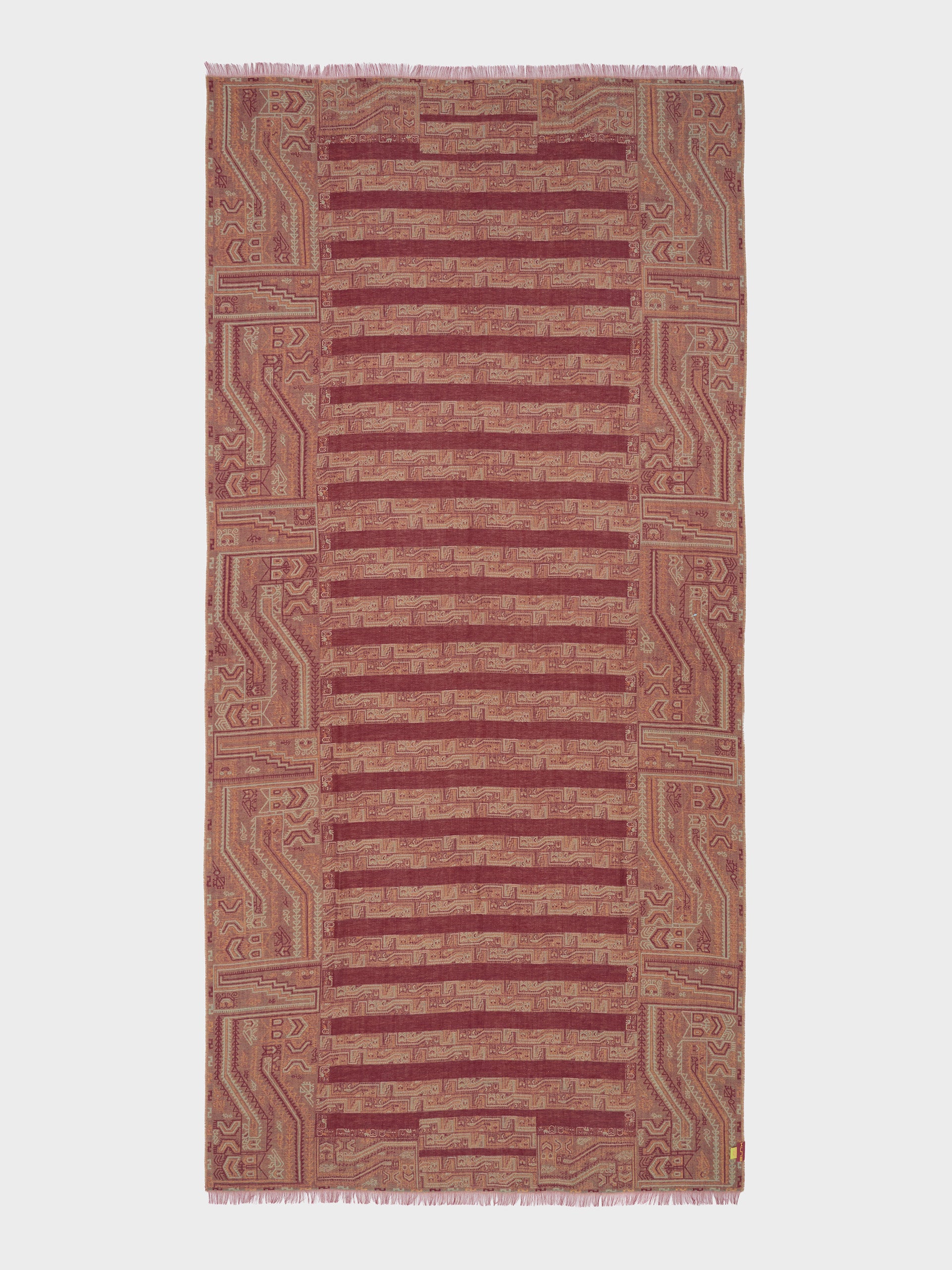Estola Paracas 19 en tonalidad rojo, elaborada en 50% Royal alpaca y 50% seda, con técnica Jacquard en doble tela e inserción de trama oculta. Con una medida de 200/196 x 93 cm, es una prenda reversible, inspirada en la Cultura Paracas, que transmite la herencia ancestral mediante un diseño con profundo significado cultural. | Material predominante: Royal Alpaca y Seda