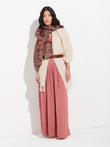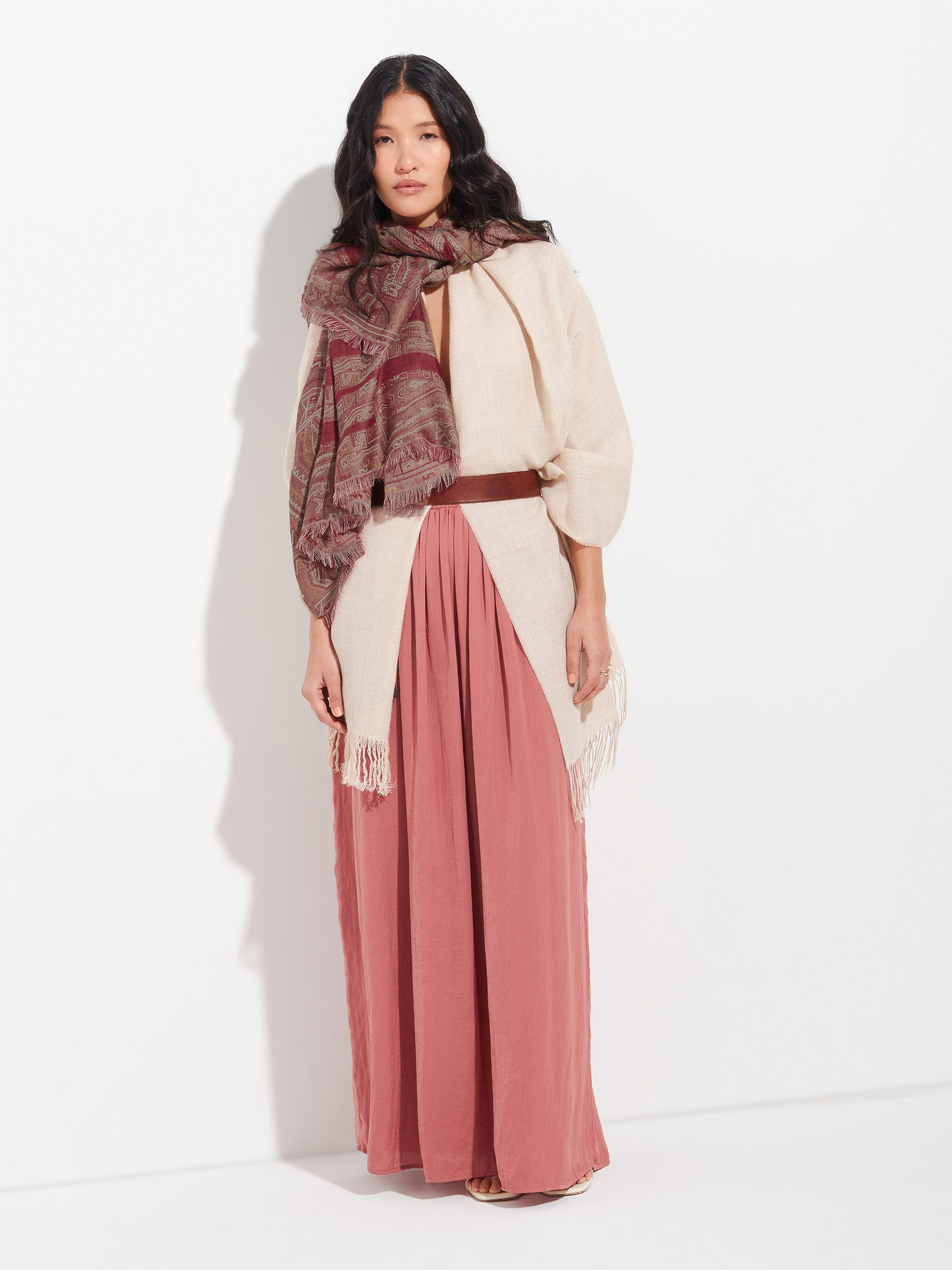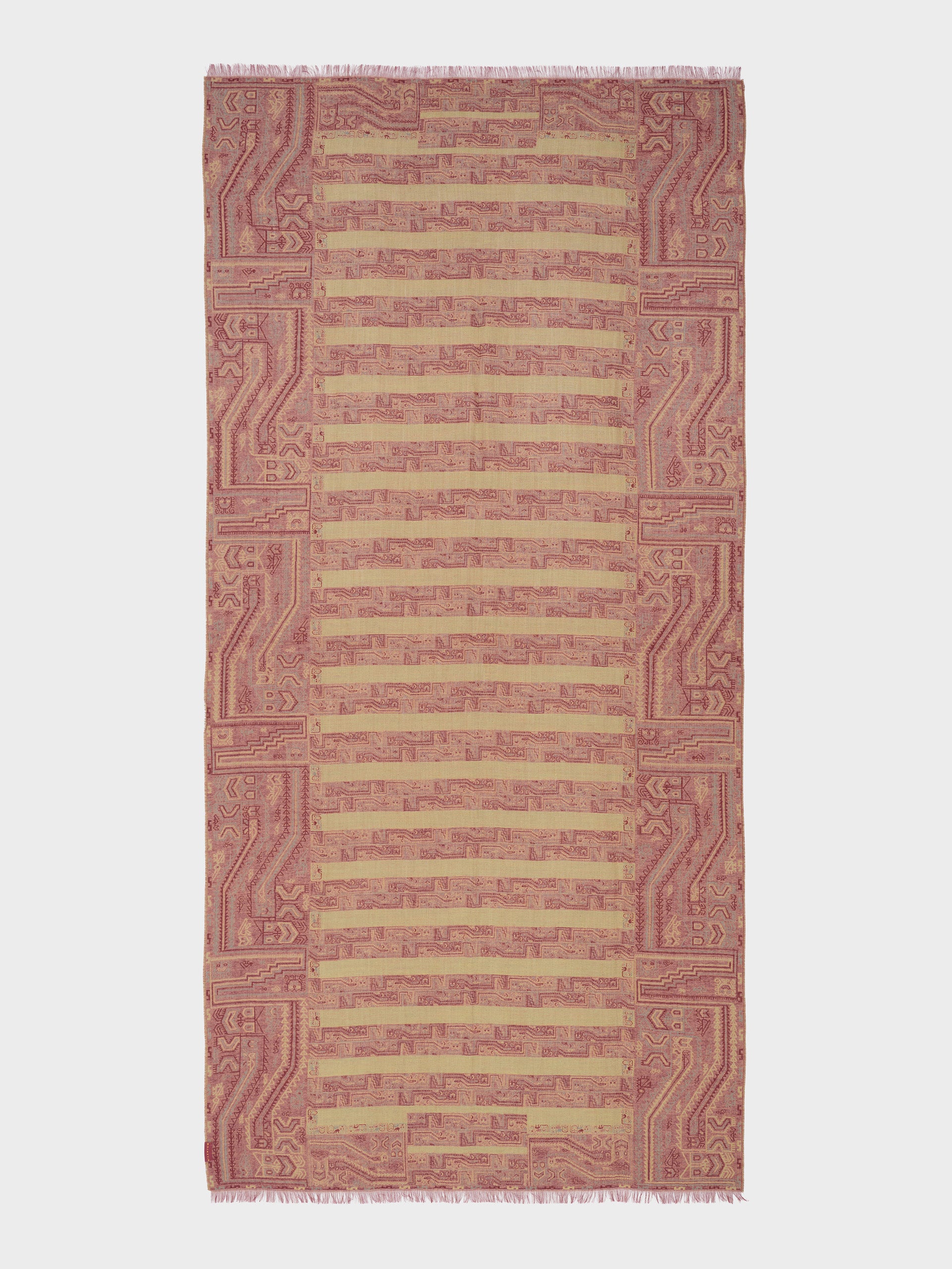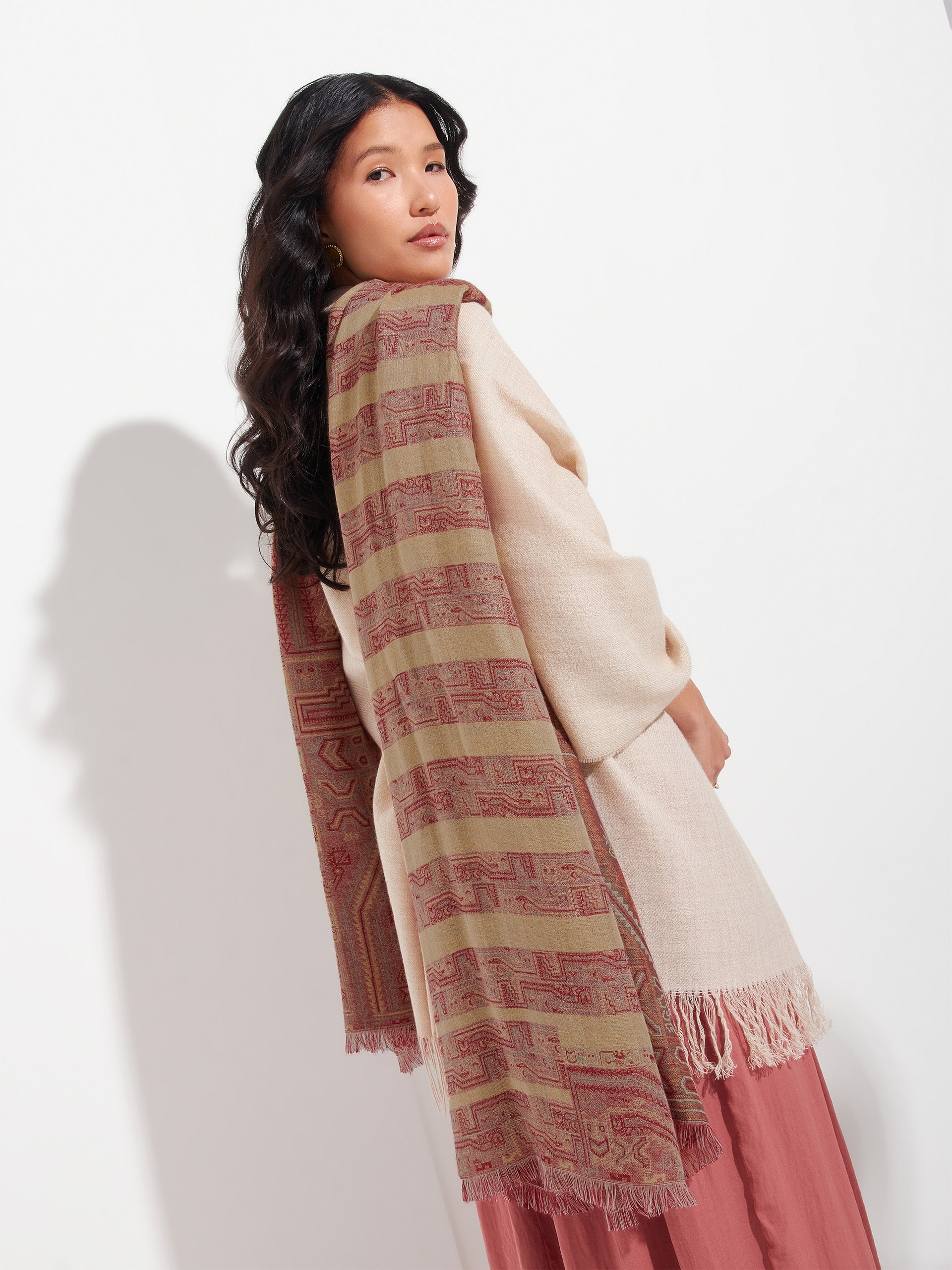 Estola Paracas 19 en tonalidad rojo, elaborada en 50% Royal alpaca y 50% seda, con técnica Jacquard en doble tela e inserción de trama oculta. Con una medida de 200/196 x 93 cm, es una prenda reversible, inspirada en la Cultura Paracas, que transmite la herencia ancestral mediante un diseño con profundo significado cultural. | Material predominante: Royal Alpaca y Seda