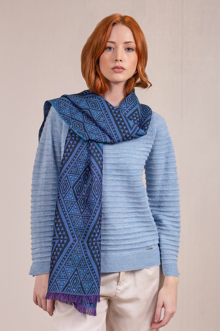 Elegante y ligera estola de baby alpaca y seda. Cada pieza es estampada individualmente en colores tono a tono y cuenta con un diseño inspirado en nuestros textiles milenarios. | Material predominante: Baby Alpaca