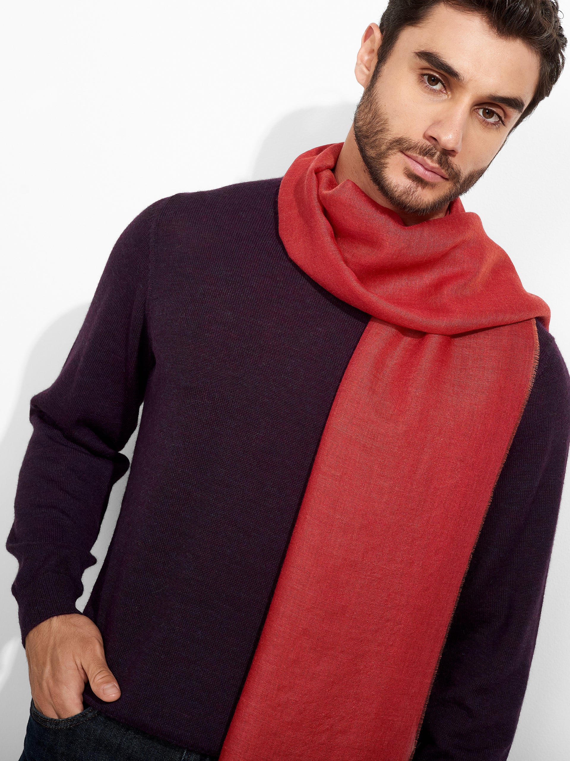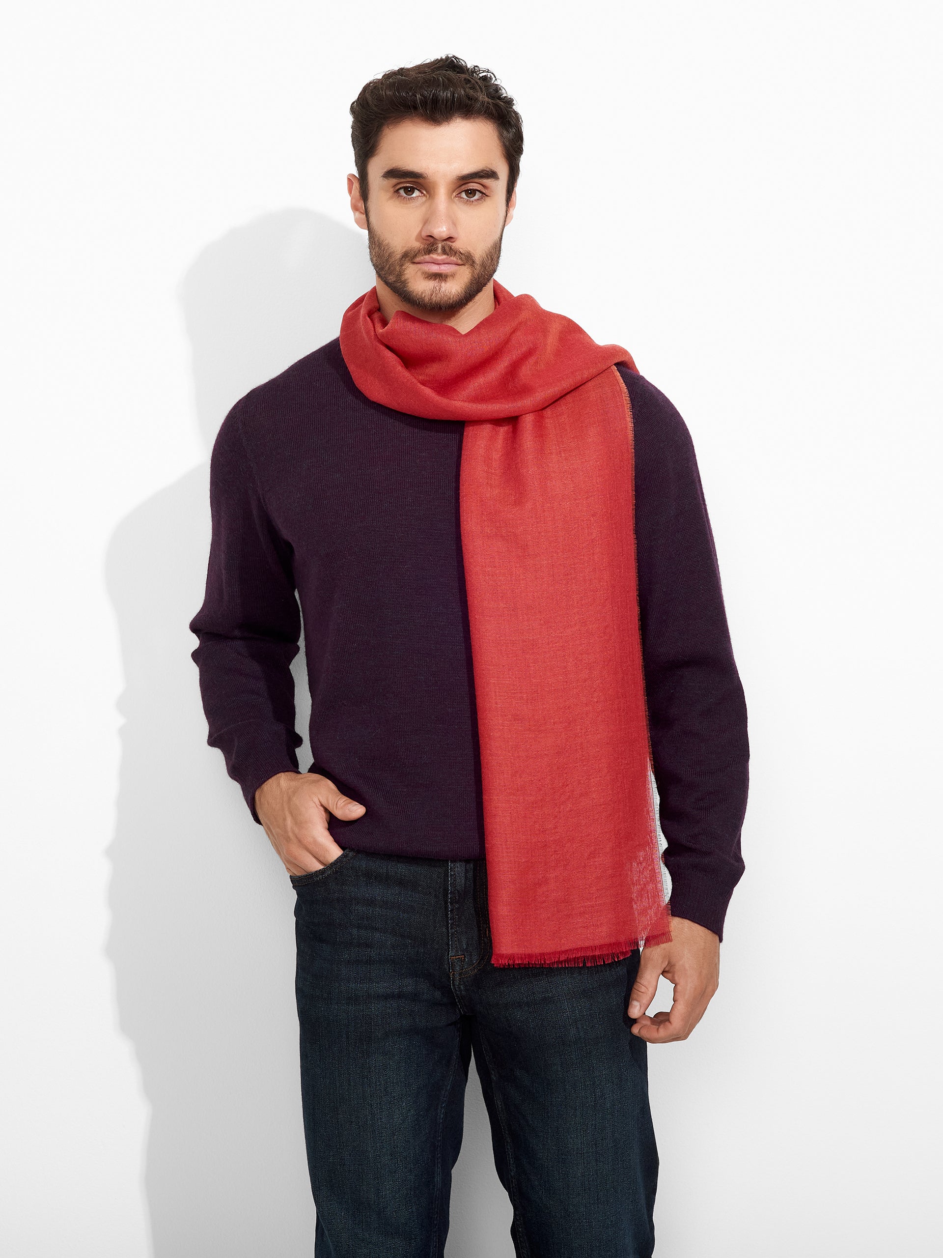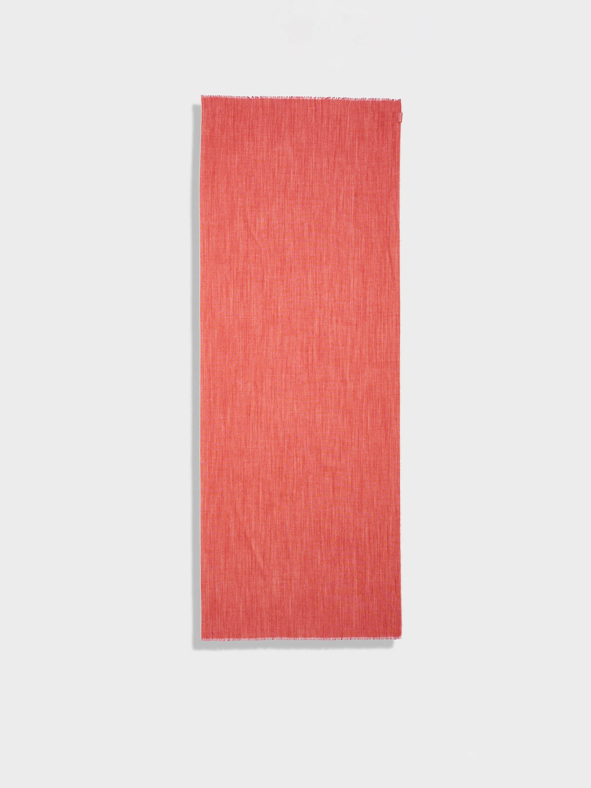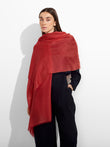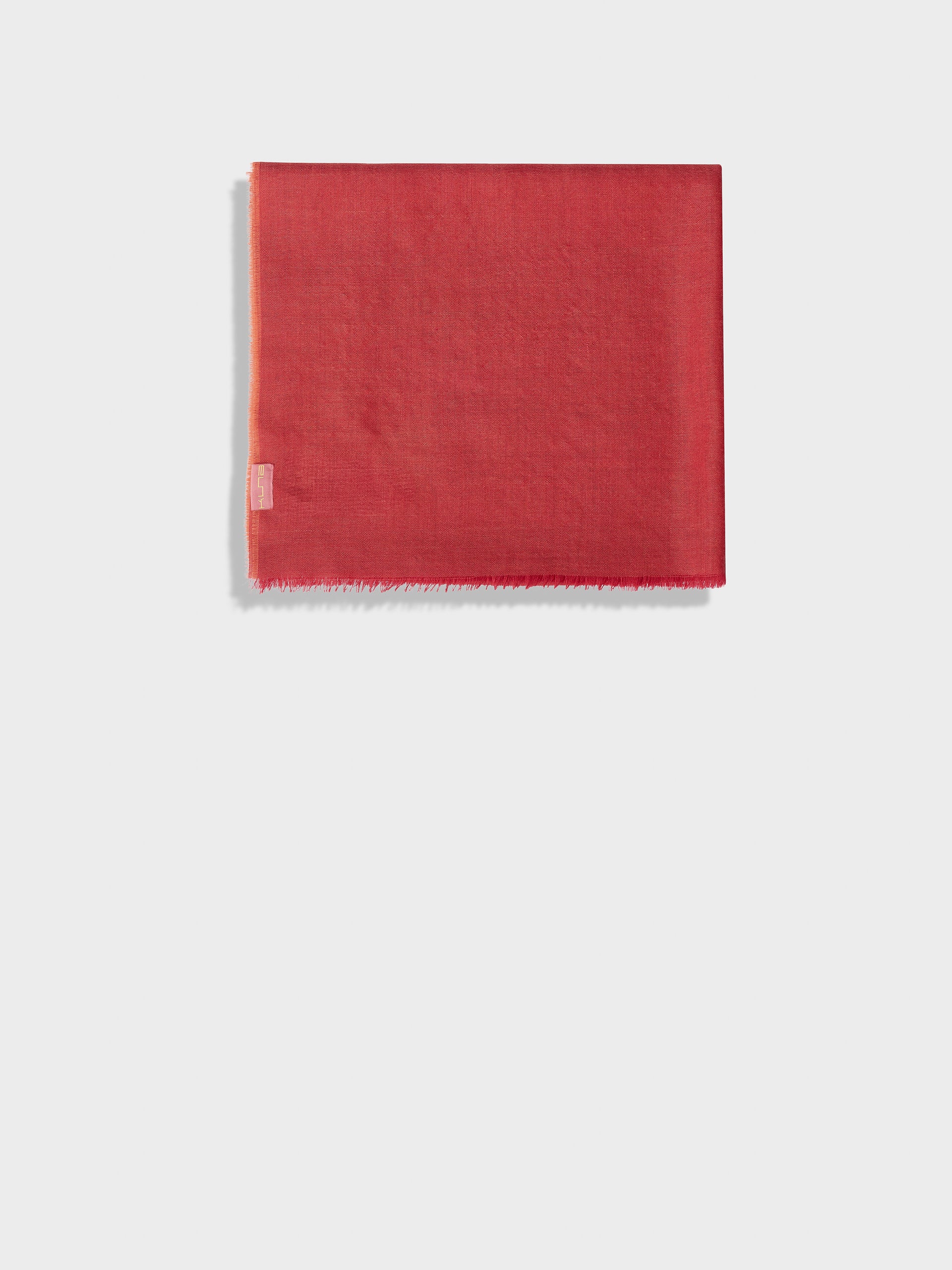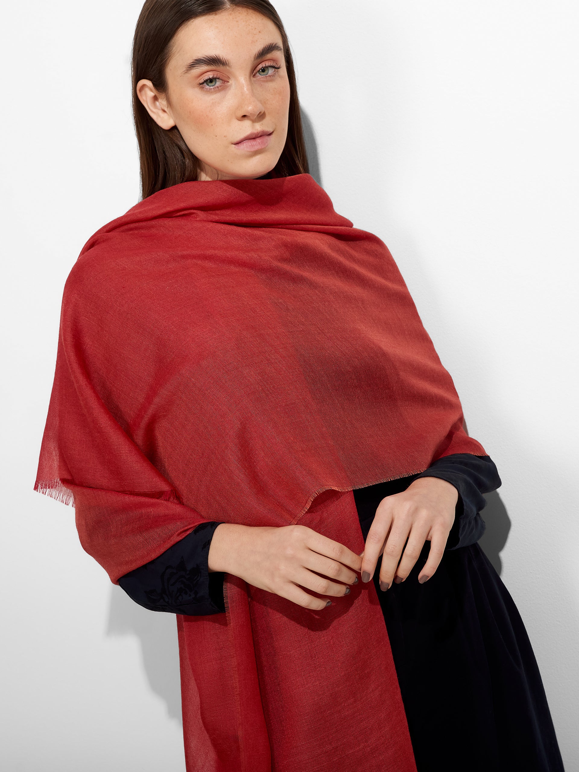 Estola Zaina en tonalidad rojo, de ligero efecto tornasol, presenta bordes con flecos finos. Confeccionada en baby alpaca y seda, combina ligereza y suavidad. | Material predominante: Baby Alpaca