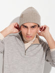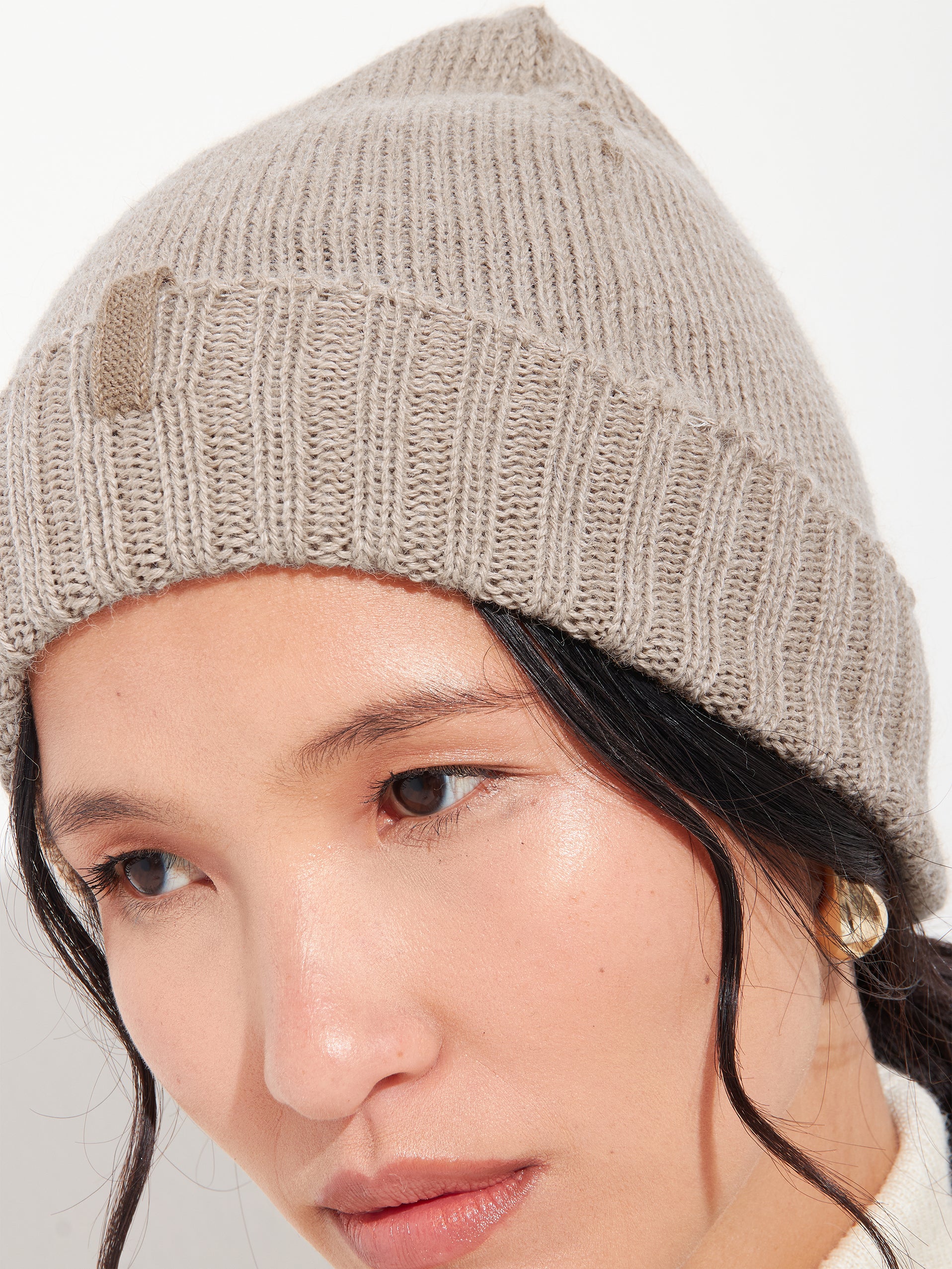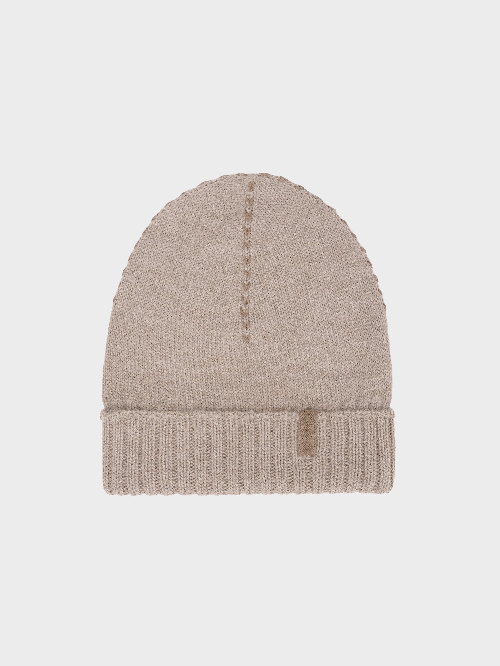 Gorro Beanie en tonalidad marrón, tejido en punto jersey y confeccionado en 100% baby alpaca RAS. De color entero, incorpora un delicado bordado a mano que añade un toque distintivo a su diseño minimalista. | Material predominante: Baby Alpaca