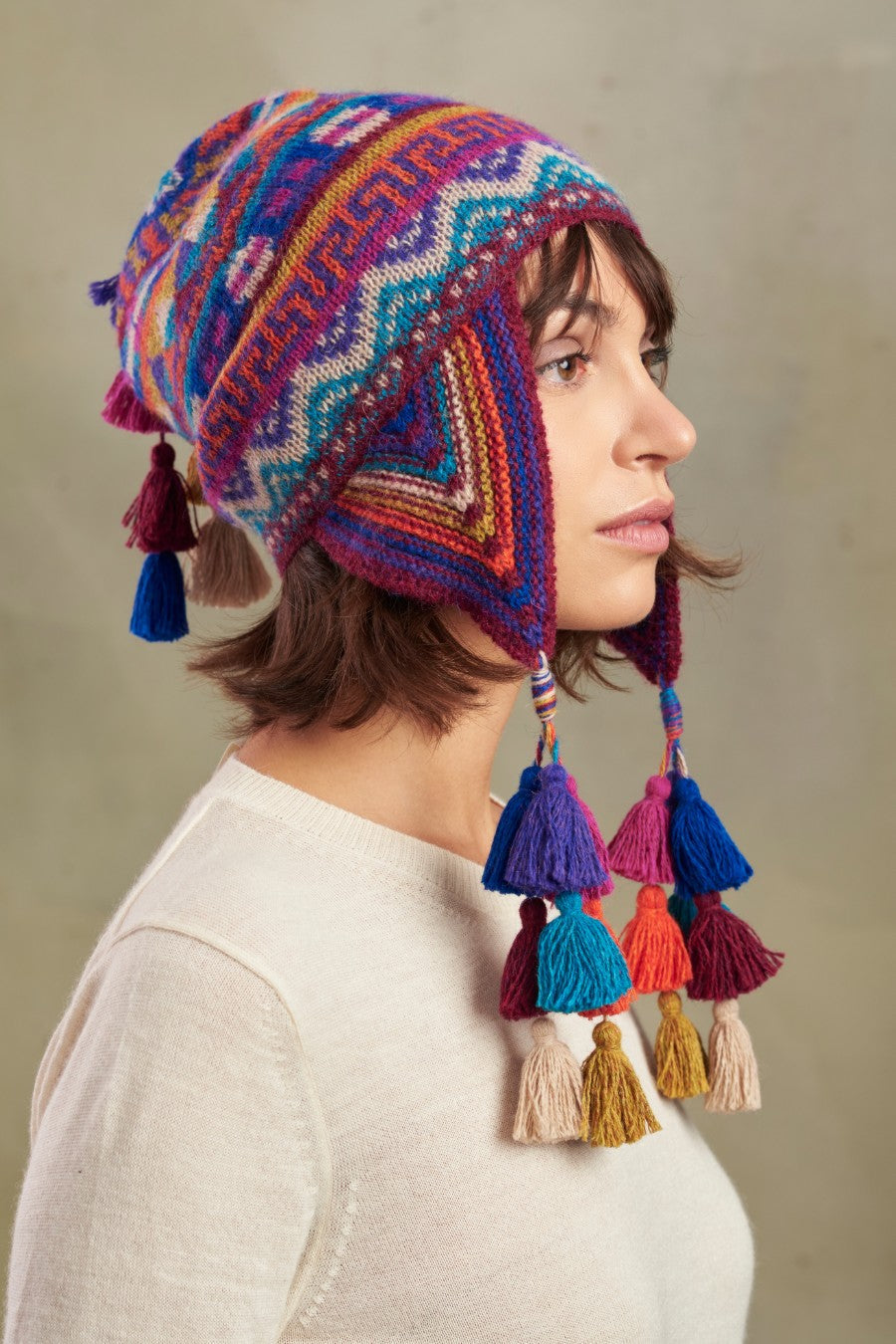 Chullo tejido en finas fibras de baby alpaca. Complemento de diseños simétricos y pompones que alegrarán cualquier atuendo. | Material predominante: Baby Alpaca