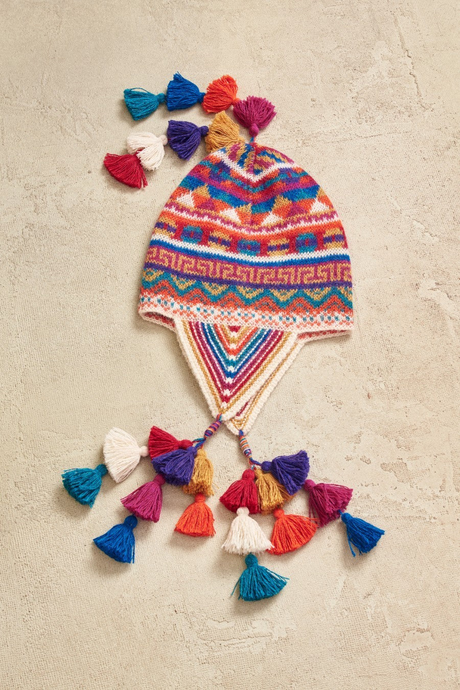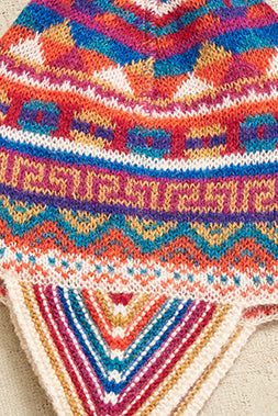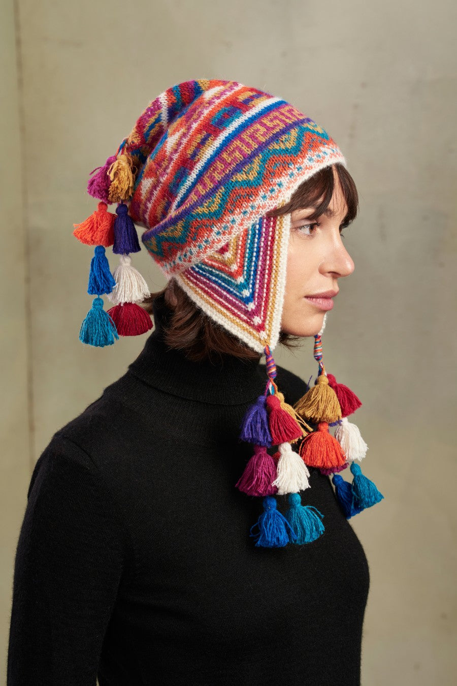 Chullo tejido en finas fibras de baby alpaca. Complemento de diseños simétricos y pompones que alegrarán cualquier atuendo. | Material predominante: Baby Alpaca