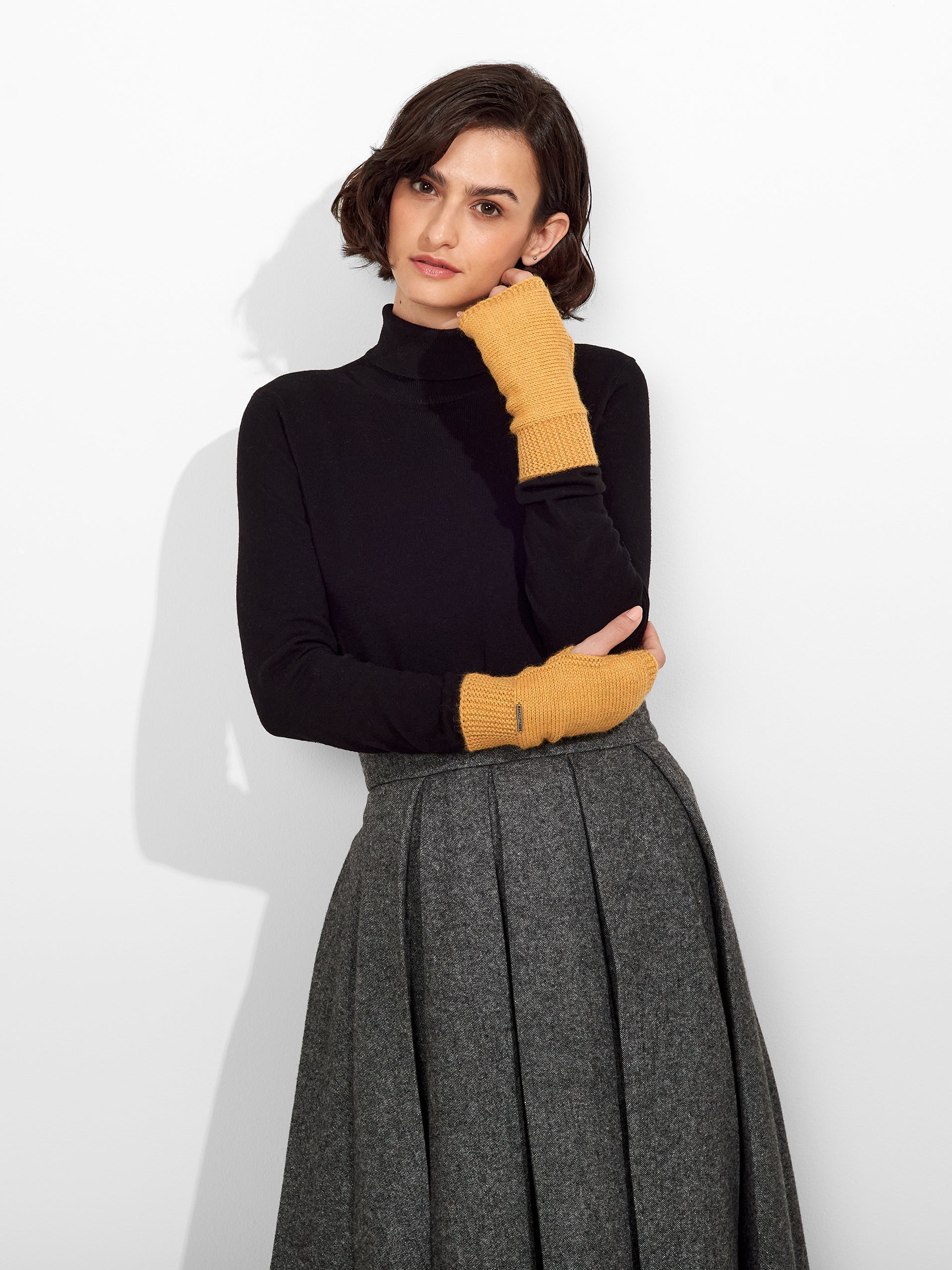 Guantes Zafiro en tonalidad amarillo, diseñado con abertura lateral en cada guante para mayor movilidad del pulgar, permite un ajuste más seguro y ceñido. Confeccionado en baby alpaca, brinda suavidad y calidez. | Material predominante: Baby Alpaca