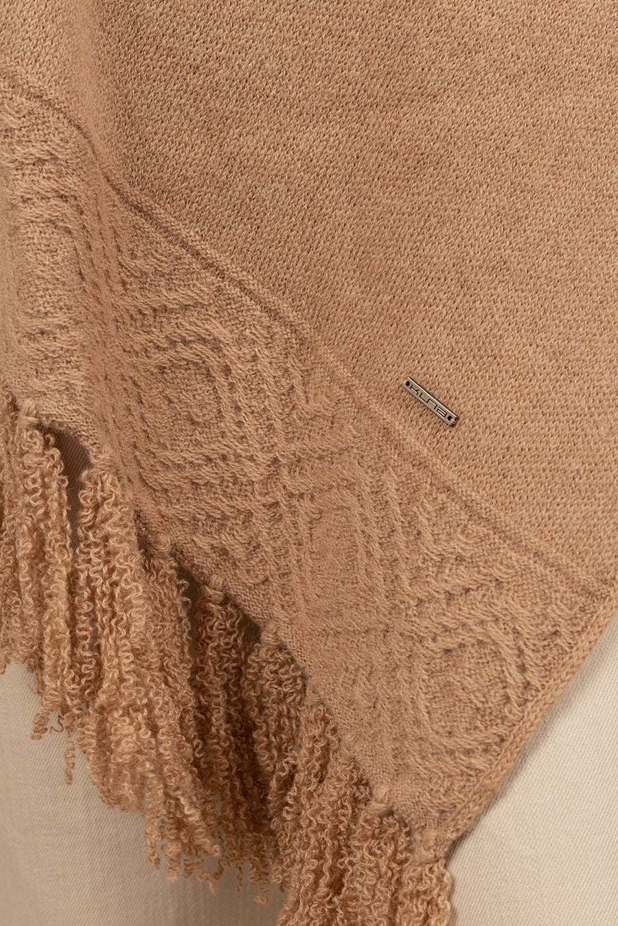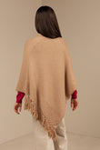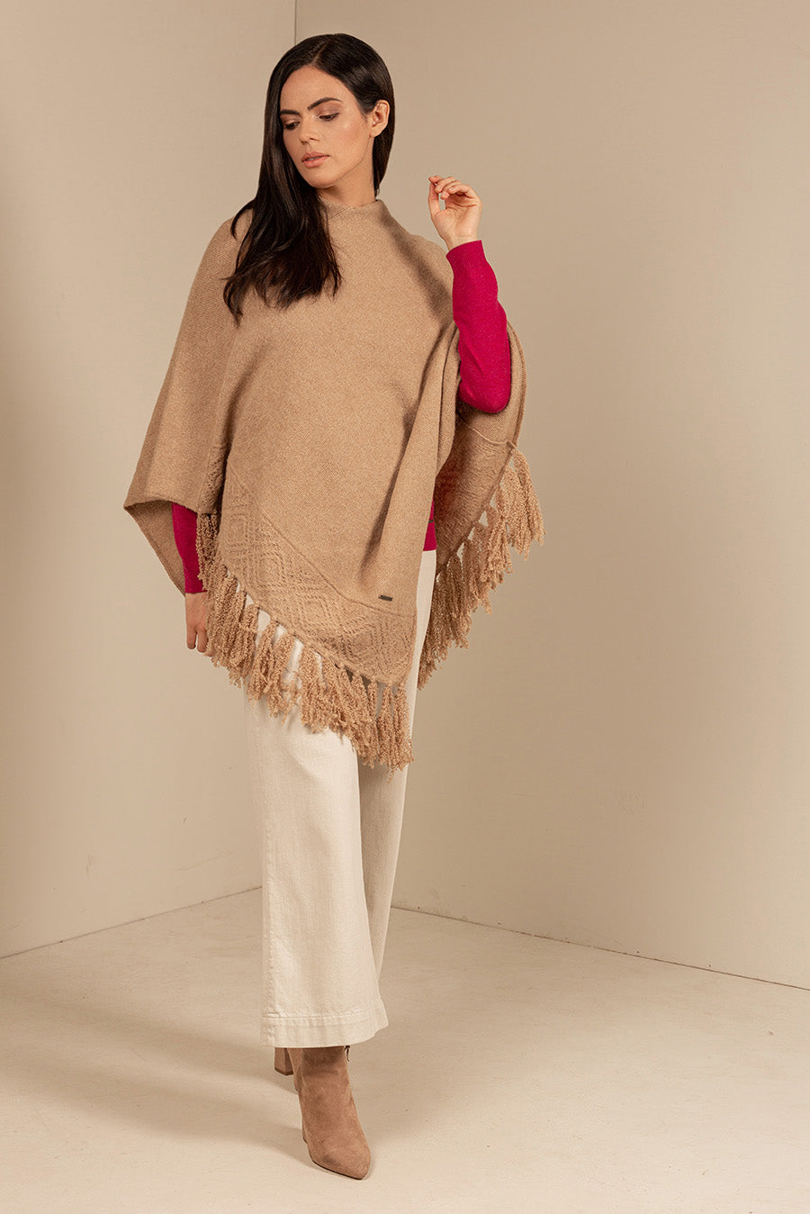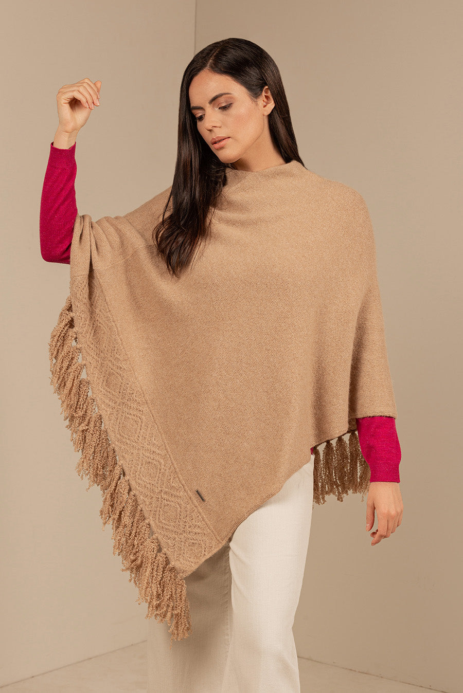 Un hilado de baby alpaca y lana se entrelaza para crear un poncho amplio y elegante, enriquecido con el detalle de los flecos en la parte inferior. El tejido de estas fibras naturales garantiza protección y calidez durante el uso, y completa la prenda con una refinada textura. | Material predominante: Baby Alpaca