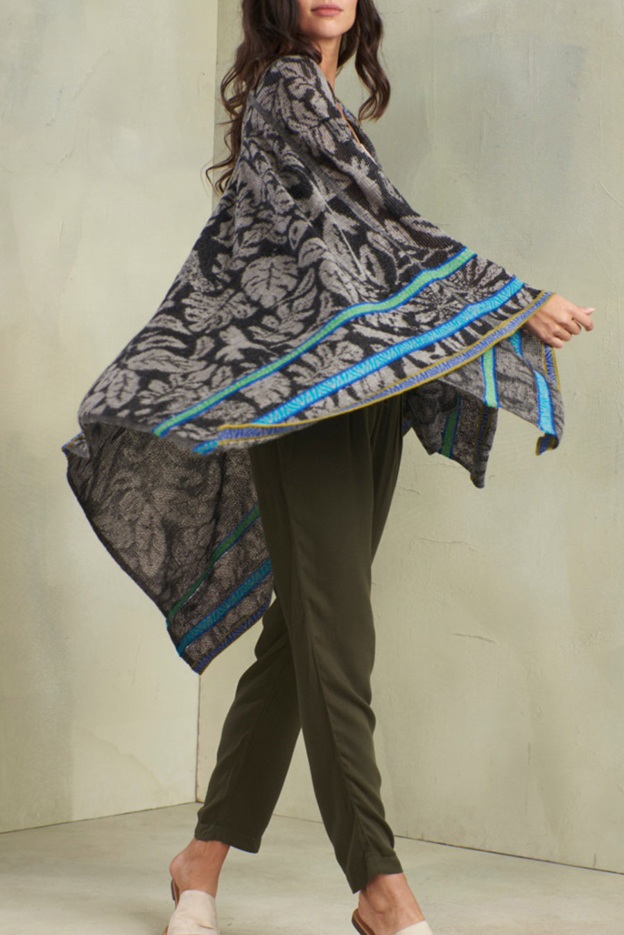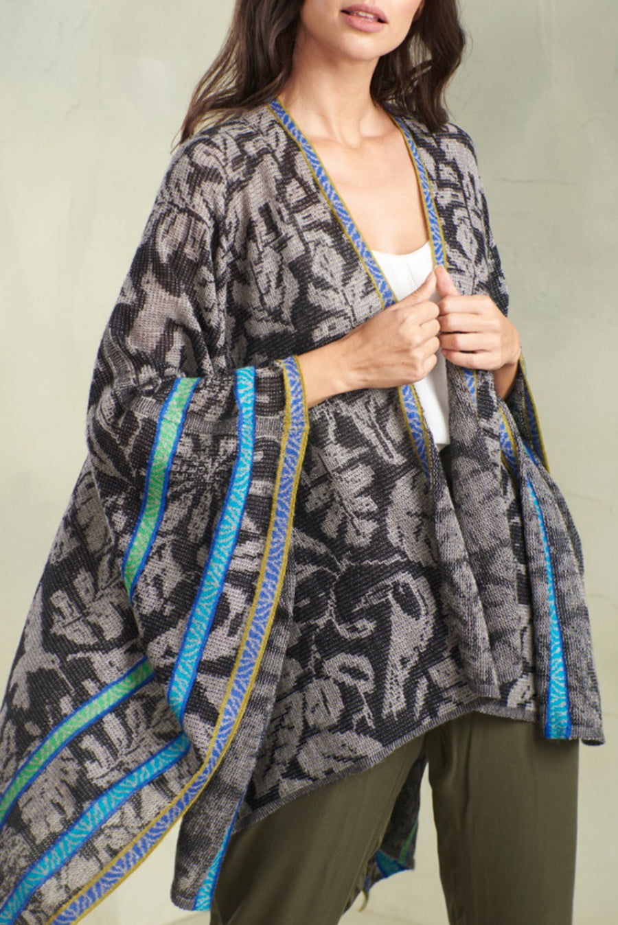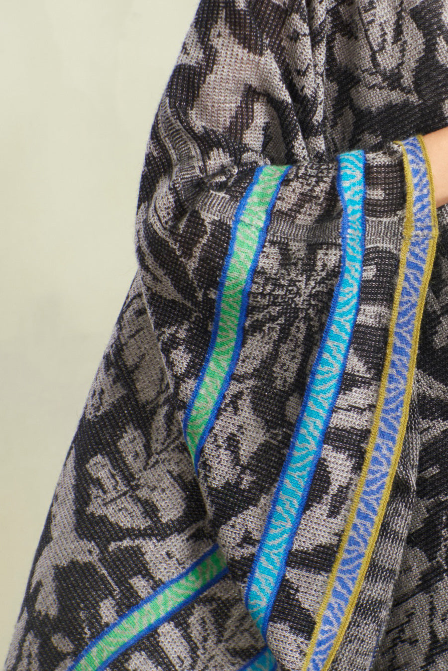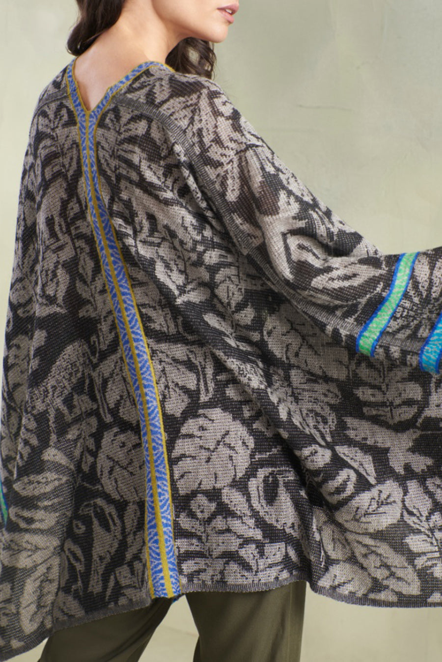 Delicada como el movimiento de las hojas en el viento y la sutil presencia de la misteriosa fauna, esta pieza logra representar el misticismo de la Amazonia, en fibras de baby alpaca y seda. | Material predominante: Baby Alpaca