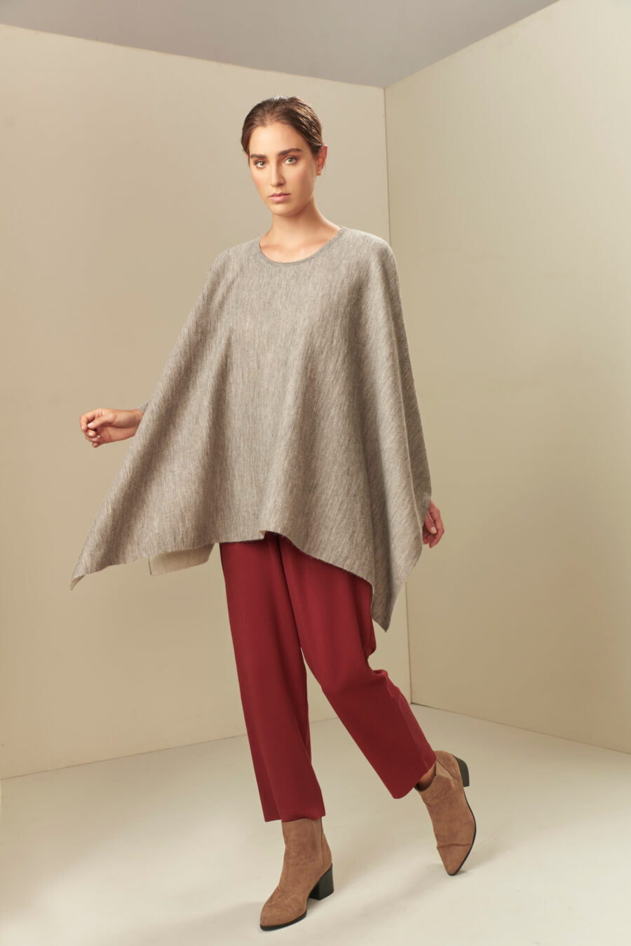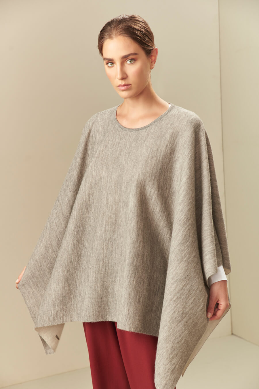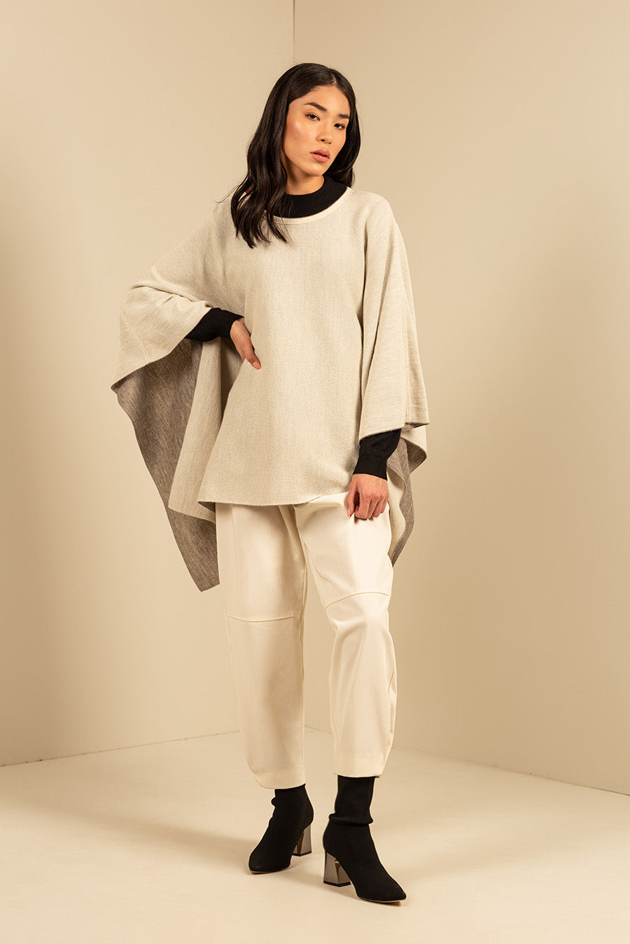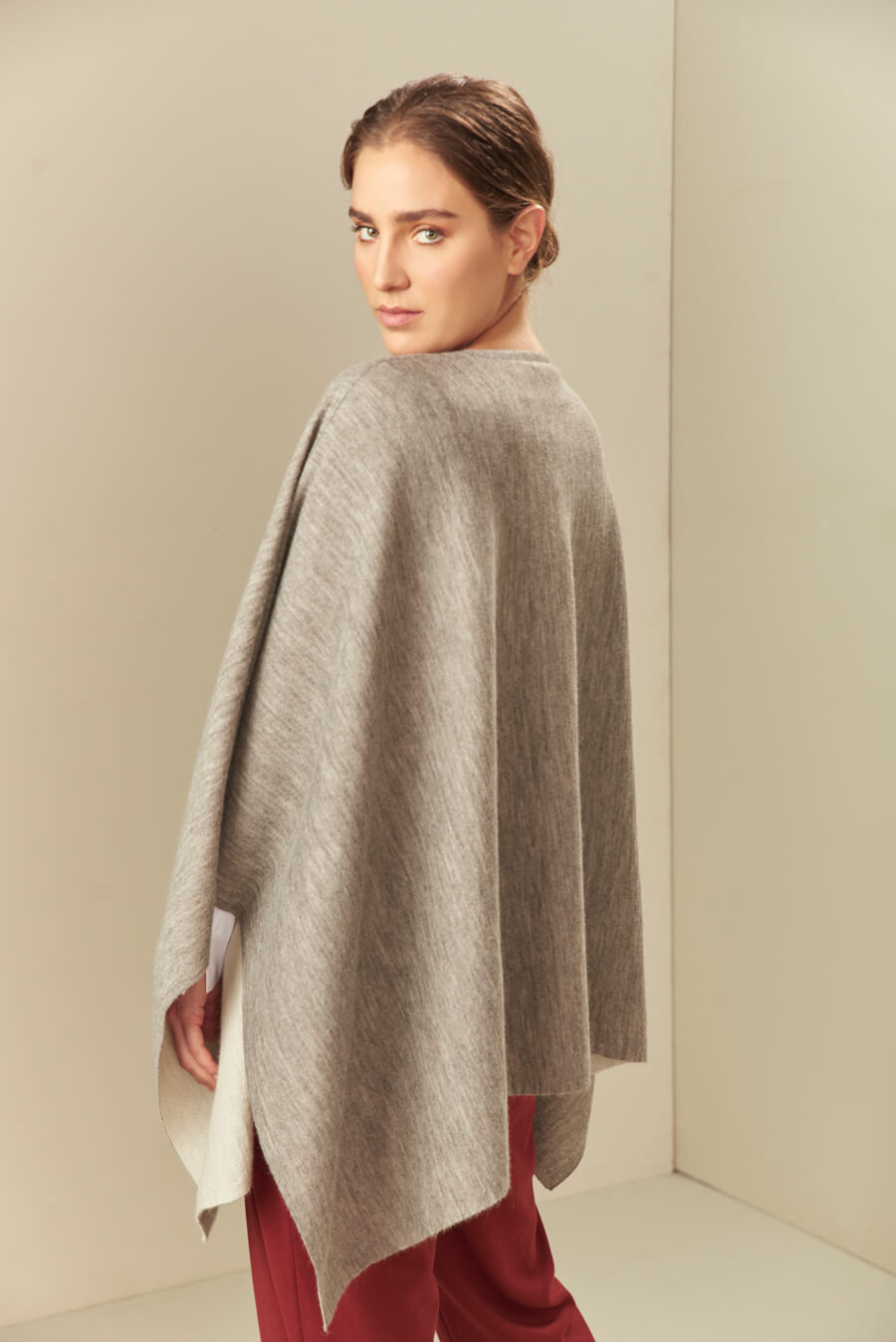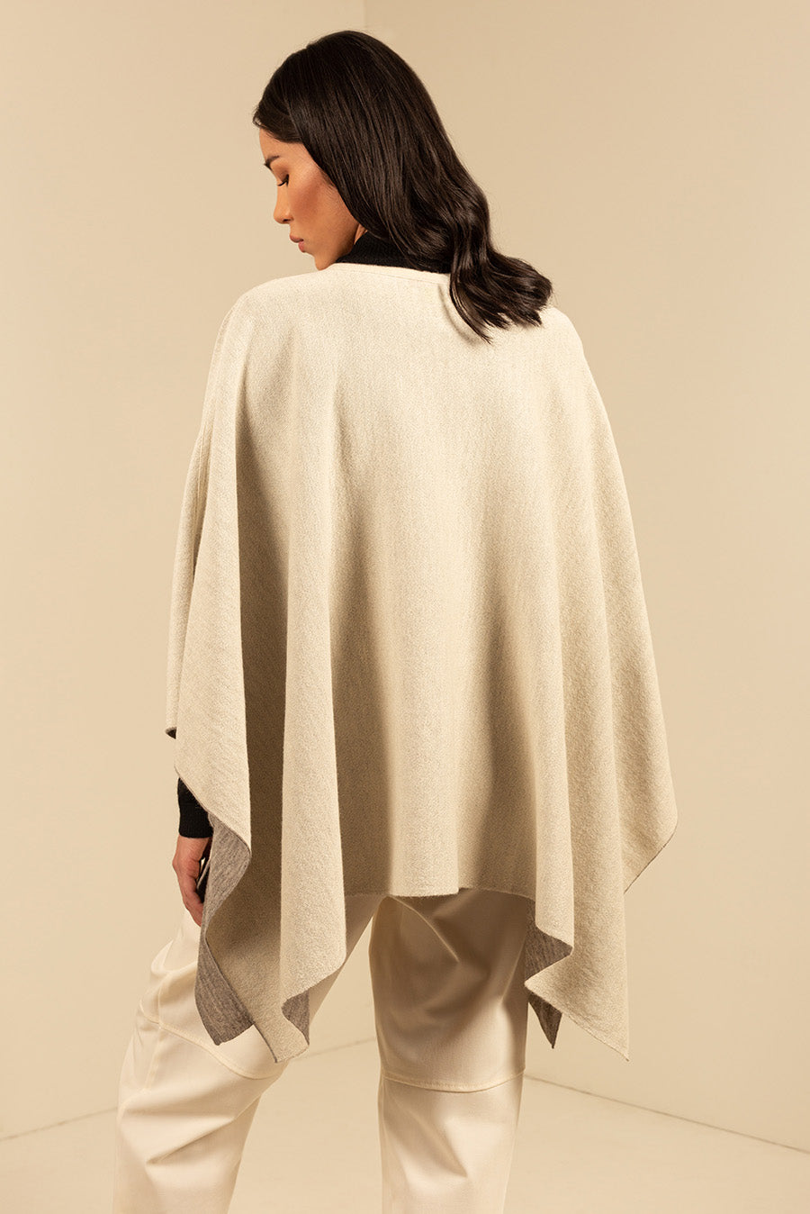 El poncho Uccello es reversible y está hecho con las mejores fibras de baby alpaca. Su colores neutros te permitirán complementar todos tus atuendos. | Material predominante: Baby Alpaca